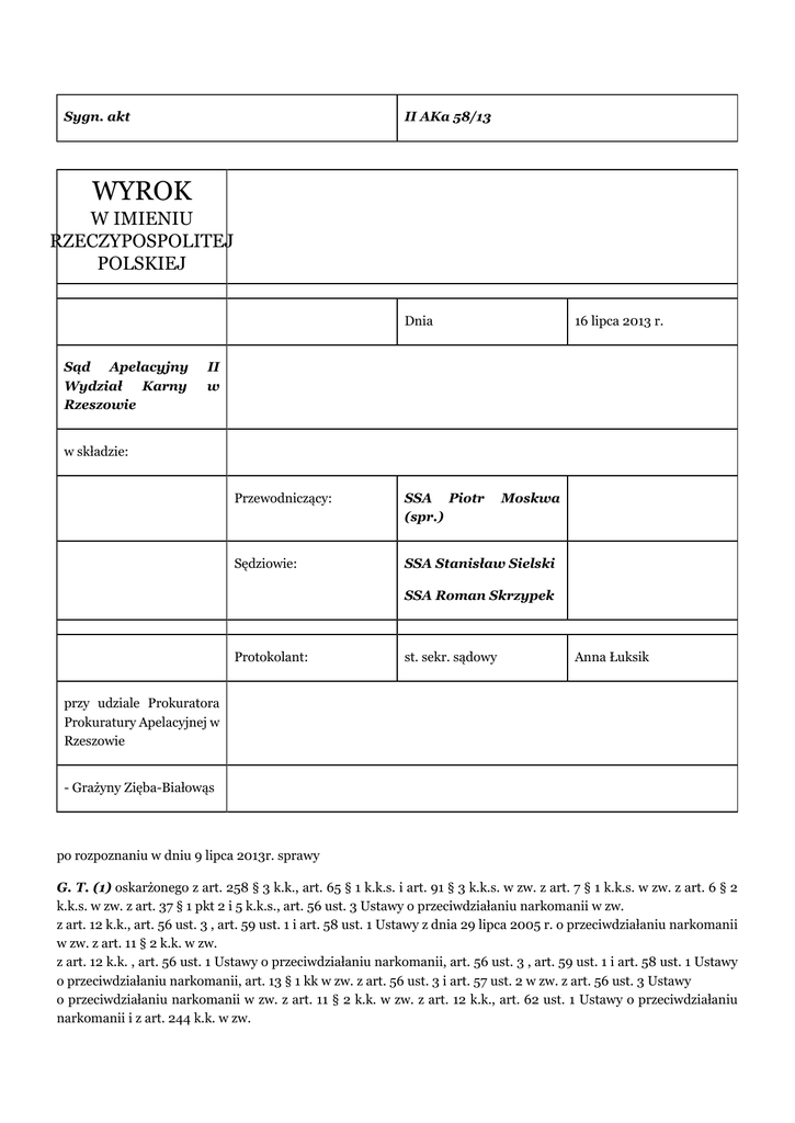 Sygn. akt II AKa 58/13 WYROK W IMIENIU RZECZYPOSPOLITEJ POLSKIEJ Dnia Sąd Apelacyjny Wydział Karny Rzeszowie 16 lipca 2013 r. II w w składzie: Przewodniczący: SSA Piotr (spr.) Moskwa Sędziowie: SSA Stanisław Sielski SSA Roman Skrzypek Protokolant: st. sekr. sądowy Anna Łuksik przy udziale Prokuratora Prokuratury Apelacyjnej w Rzeszowie - Grażyny Zięba-Białowąs po rozpoznaniu w dniu 9 lipca 2013r. sprawy G. T. (1) oskarżonego z art. 258 § 3 k.k., art. 65 § 1 k.k.s. i art. 91 § 3 k.k.s. w zw. z art. 7 § 1 k.k.s. w zw. z art. 6 § 2 k.k.s. w zw. z art. 37 § 1 pkt 2 i 5 k.k.s., art. 56 ust. 3 Ustawy o przeciwdziałaniu narkomanii w zw. z art. 12 k.k., art. 56 ust. 3 , art. 59 ust. 1 i art. 58 ust. 1 Ustawy z dnia 29 lipca 2005 r. o przeciwdziałaniu narkomanii w zw. z art. 11 § 2 k.k. w zw. z art. 12 k.k. , art. 56 ust. 1 Ustawy o przeciwdziałaniu narkomanii, art. 56 ust. 3 , art. 59 ust. 1 i art. 58 ust. 1 Ustawy o przeciwdziałaniu narkomanii, art. 13 § 1 kk w zw. z art. 56 ust. 3 i art. 57 ust. 2 w zw. z art. 56 ust. 3 Ustawy o przeciwdziałaniu narkomanii w zw. z art. 11 § 2 k.k. w zw. z art. 12 k.k., art. 62 ust. 1 Ustawy o przeciwdziałaniu narkomanii i z art. 244 k.k. w zw. z art. 12 k.k., P. N. oskarżonego z art. 56 ust. 3 Ustawy o przeciwdziałaniu narkomanii w zw. z art. 12 k.k., art. 258 § 1 k.k., art. 56 ust. 3, art. 13 § 1 k.k. w zw. z art. 56 ust. 3 i art. 57 ust. 2 w zw. z art. 56 ust. 3 Ustawy o przeciwdziałaniu narkomanii z zw. z art. 11 § 2 k.k., art. 12 k.k. i art. 65 § 1 k.k., art. 59 ust. 1 Ustawy o przeciwdziałaniu narkomanii, art. 58 ust. 1 Ustawy o przeciwdziałaniu narkomanii w zw. z art. 12 k.k. i art. 59 ust. 1 Ustawy o przeciwdziałaniu narkomanii w zw. z art. 12 k.k. na skutek apelacji wniesionych przez obrońców oskarżonych od wyroku Sądu Okręgowego w Przemyślu z dnia 4 kwietnia 2012r., sygn. akt II K 40/10 I. zmienia wyrok w zaskarżonej części w ten sposób, że: a) uchyla orzeczenie o wymiarze kar łącznych orzeczonych wobec G. T. (1), oparte na przepisach art. 85 k.k. i art. 39 § 1 k.k.s. w zw. z art. 20 § 2 k.k.s., zawarte w pkt 26 wyroku, b) przyjmuje, że grupą opisaną w pkt 1, G. T. (1) kierował do dnia 18 kwietnia 2008 r. i za czyn ten na podstawie art. 258 § 3 k.k., w miejsce orzeczonej kary 1 (jednego) roku i 6 (sześciu) miesięcy pozbawienia wolności, skazuje go na karę 1 (jednego) roku i 3 (trzech) miesięcy pozbawienia wolności, c) ustala, że czynu opisanego w pkt. 4 wyroku G. T. (1) dopuścił się działając w ramach zorganizowanej grupy przestępczej w okresie od września 2007 r. do 18 kwietnia 2008 r., a w okresie od 19 kwietnia 2008 r. do 6 czerwca 2008 r. indywidualnie i w tym okresie brał on udział w nabywaniu, przechowywaniu, ukrywaniu, przewożeniu oraz zbywaniu odbiorcom z terenu kraju i zagranicy łącznie 65 920 paczek papierosów o łącznej wartości celnej 84 403, 95 zł, co naraziło na uszczuplenie należności celnej małej wartości w wysokości 48 616, 65 zł oraz należności w podatku akcyzowym w wysokości 437 708, 80 zł i za czyn ten na podstawie art. 65 § 1 k.k.s. w zw. z art. 7 § 2 k.k.s. w zw. z art. 38 § 1 pkt 3 k.k.s., w miejsce wymierzonej kary 1 (jednego) roku pozbawienia wolności i 150 (sto pięćdziesiąt) stawek dziennych grzywny przy przyjęciu wysokości jednej stawki dziennej na kwotę 50 (pięćdziesięciu) złotych skazuje go na karę 8 (ośmiu) miesięcy pozbawienia wolności i karę grzywny w wysokości 100 (stu) stawek dziennych przy przyjęciu wysokości jednej stawki dziennej na kwotę 50 (pięćdziesięciu) złotych, d) obniża wysokość środka karnego w postaci ściągnięcia na rzecz Skarbu Państwa równowartości korzyści majątkowej, orzeczonego na podstawie art. 31 § 1 k.k.s. wobec G. T. (1) (pkt 5), do kwoty 42 201,98 zł (czterdzieści dwa tysiące dwieście jeden złotych dziewięćdziesiąt osiem groszy), e) poprawia błędną kwalifikację prawną czynów przypisanych G. T. (1) w pkt. 15, 17 i 21 oraz P. N. w pkt. 39 i 42 w ten sposób, że przyjmuje, iż podstawę skazania oraz podstawę wymiaru kary za opisane w tych punktach przestępstwa stanowią powołane tam przepisy ustawy z dnia 29 lipca 2005 r. o przeciwdziałaniu narkomanii w brzmieniu obowiązującym przed dniem wejścia w życie ustawy z dnia 1 kwietnia 2011 r. o zmianie ustawy o przeciwdziałaniu narkomanii oraz niektórych innych ustaw (Dz. U. z dnia 8 czerwca 2011 r., Nr 117, poz. 678), tj. przed dniem 9 grudnia 2011 r., f) na podstawie art. 85 k.k. i art. 39 § 1 i 2 k.k.s. w zw z art. 20 § 2 k.k.s. wymierza G. T. (1) karę łączną 3 (trzech) lat i 8 (ośmiu) miesięcy pozbawienia wolności i karę łączną grzywny w wysokości 160 (stu sześćdziesięciu) stawek dziennych, przy przyjęciu wysokości jednej stawki dziennej na kwotę 50 (pięćdziesięciu) złotych, II. w pozostałym zakresie wyrok w zaskarżonej części utrzymuje w mocy, III. zwalnia G. T. (1) i P. N. w całości od zapłaty na rzecz Skarbu Państwa kosztów sądowych za postępowanie odwoławcze. Sygn. akt. II AKa 58/13 UZASADNIENIE Sąd Okręgowy w Przemyślu wyrokiem z dnia 4 kwietnia 2012 r., uznał między innymi: - w pkt 1 oskarżonego G. T. (1) za winnego tego, że: w okresie od nieustalonego dnia września 2007 r. do dnia 6 czerwca 2008 r. w P., M. i innych miejscowościach na terenie kraju kierował zorganizowaną grupą przestępczą, w skład, której wchodzili I. Ł., M. S., M. P. i B. K., mającą na celu popełnianie przestępstw skarbowych polegających na nabywaniu, przechowywaniu, przewożeniu i zbywaniu odbiorcom z terenu kraju i zagranicy wyrobów akcyzowych w postaci papierosów różnych marek produkcji zagranicznej, bez polskich znaków skarbowych akcyzy, w ten sposób, że zajmował się organizacją skupu wyżej wymienionego towaru, jego przechowywania, segregacji według uzgodnionego asortymentu, pakowania, załadunku i transportu do wyznaczonych uprzednio miejsc, jak r