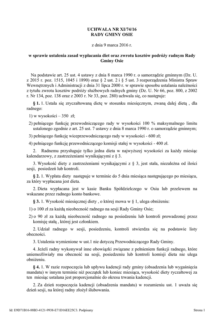 UCHWAŁA NR XI/74/16 RADY GMINY OSIE z dnia 9 marca 2016 r. w sprawie ustalenia zasad wypłacania diet oraz zwrotu kosztów podróży radnym Rady Gminy Osie Na podstawie art. 25 ust. 4 ustawy z dnia 8 marca 1990 r. o samorządzie gminnym (Dz. U. z 2015 r. poz. 1515, 1045 i 1890) oraz § 2 ust. 2 i § 5 ust. 3 rozporządzenia Ministra Spraw Wewnętrznych i Administracji z dnia 31 lipca 2000 r. w sprawie sposobu ustalania należności z tytułu zwrotu kosztów podróży służbowych radnych gminy (Dz. U. Nr 66, poz. 800, z 2002 r. Nr 134, poz. 138 oraz z 2003 r. Nr 33, poz. 280) uchwala się, co następuje: § 1. 1. Ustala się zryczałtowaną dietę w stosunku miesięcznym, zwaną dalej dietą , dla radnego: 1) w wysokości – 350 zł; 2) pełniącego funkcję przewodniczącego rady w wysokości 100 % maksymalnego limitu ustalonego zgodnie z art. 25 ust. 7 ustawy z dnia 8 marca 1990 r. o samorządzie gminnym; 3) pełniącego funkcję wiceprzewodniczącego rady w wysokości - 600 zł; 4) pełniącego funkcję przewodniczącego komisji stałej w wysokości - 400 zł. 2. Radnemu przysługuje tylko jedna dieta w najwyższej wysokości za każdy miesiąc kalendarzowy, z zastrzeżeniami wynikającymi z § 3. 3. Wysokość diety z zastrzeżeniami wynikającymi z § 3, jest stała, niezależna od ilości sesji, posiedzeń lub kontroli. § 2. 1. Wypłata diety następuje w terminie do 5 dnia miesiąca następującego po miesiącu, za który wypłacana jest dieta. 2. Dieta wypłacana jest w kasie Banku Spółdzielczego w Osiu lub przelewem na wskazane przez radnego konto bankowe. § 3. 1. Wysokość miesięcznej diety , o której mowa w § 1, ulega obniżeniu: 1) o 100 zł za każdą nieobecność radnego na sesji Rady Gminy Osie; 2) o 90 zł za każdą nieobecność radnego na posiedzeniu lub kontroli prowadzonej przez komisję stałą , której jest członkiem. 2. Udział radnego w sesji, posiedzeniu, kontroli stwierdza się na podstawie listy obecności. 3. Ustalenia wymienione w ust.1 nie dotyczą Przewodniczącego Rady Gminy. 4. Jeżeli radny wykonywał inne obowiązki związane z pełnieniem funkcji radnego, które uniemożliwiały mu obecność na sesji, posiedzeniu lub kontroli komisji dieta nie ulega obniżeniu. § 4. 1. W razie rozpoczęcia lub upływu kadencji rady gminy (obsadzenia lub wygaśnięcia mandatu) w innym terminie niż początek lub koniec miesiąca, wysokość diety ryczałtowej za ten miesiąc ustalana jest proporcjonalnie do okresu trwania kadencji. 2. Za dzień rozpoczęcia kadencji (obsadzenia mandatu) w rozumieniu ust. 1 uważa się dzień sesji, na której radny złożył ślubowania. Id: E9D71B16-88B3-4121-9938-E71D16EE25C3. Podpisany Strona 1 3. Za dzień upływu kadencji (wygaśnięcia mandatu) w rozumieniu ust. 1 uważa się dzień, z którym następuje zdarzenie uzasadniające upływ kadencji (wygaśnięcie mandatu). 4. W przypadku zmiany w trakcie miesiąca kalendarzowego funkcji pełnionej przez radnego, od której uzależniona jest wypłata diety lub jej wysokość, wymiar diety ryczałtowej za dany miesiąc ustala się proporcjonalnie, przyjmując za miesiąc łącznie 30 dni. § 5. 1. Radnemu przysługuje zwrot kosztów podróży służbowych na zasadach określonych w rozporządzeniu Ministra Spraw Wewnętrznych i Administracji z dnia 31 lipca 2000 r. w sprawie sposobu ustalania należności z tytułu zwrotu kosztów podróży służbowych radnych gminy ( Dz. U. Nr 66, poz. 800 z późn. zm. ). 2. Ustala się stawki zwrotu kosztów przejazdu radnego pojazdem samochodowym niebędącym własnością Gminy, w ramach podróży służbowej mającej bezpośredni związek z wykonywaniem mandatu, za 1 km przebiegu w wysokości stawek określonych jako maksymalne w rozporządzeniu ministra właściwego ds. transportu wydanym na podstawie art. 34a ust. 2 ustawy z dnia 6 września 2001 r. o transporcie drogowym (tekst jedn. Dz. U. z 2013 r. poz. 1414 z późn. zm.). 3. Wyznacza się Wiceprzewodniczącego Rady Gminy Osie do wystawiania polecenia wyjazdu służbowego dla Przewodniczącego Rady Gminy. § 6. Traci moc uchwała Nr XXIII/127/93 Rady Gminy w Osiu z dnia 25 marca 1993 r. w sprawie ustalenia diety miesięcznej dla Przewodniczącego Rady Gminy i uchwała Nr IV/15/11 Rady Gminy Osie z dnia 29 marca 2011 r. w sprawie ustalenia zasad wypłacania diet oraz zwrotu kosztów podróży służbowych radnym Rady Gminy Osie. § 7. Uchwała wchodzi w życie z dniem 1 kwietnia 2016 r. Przewodniczący Rady Gminy mgr Roman Waśkowski Id: E9D71B16-88B3-4121-9938-E71D16EE25C3. Podpisany Strona 2 Uzasadnienie Z tytułu wykonywania mandatu, radnym przysługują diety na zasadach określonych przez radę gminy. Ustalając wysokość zryczałtowanych diet Rada Gminy wzięła pod uwagę ograniczenia wysokości diet wynikające z ustawy z dnia 8 marca 1990 r. o samorządzie gminnym oraz rozporządzenia Rady Ministrów z dnia 26 lipca 2000 r. w sprawie maksymalnej wysokości diet przysługujących radnemu gminy. Zgodnie z art. 25 pkt 8 ustawy z dnia 8 marca 1990 r. o samorządzie gminnym Rada Gminy, ustalając wysokość diet radnych, wzięła pod uwagę funkcje pełnione przez radnego. Diety mają rekompensować radnym czas poświęcony na wykonywanie pracy w samorządzie m.in. udział w sesjach, posiedzeniach komisji, dyżurach i spotkania z wyborcami. Id: E9D71B16-88B3-4121-9938-E71D16EE25C3. Podpisany Strona 3
