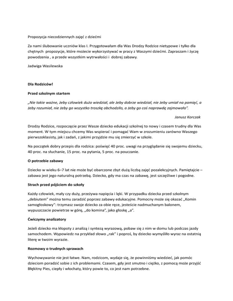Propozycja niecodziennych zajęć z dziećmi Za nami ślubowanie uczniów klas I. Przygotowałam dla Was Drodzy Rodzice nietypowe i tylko dla chętnych propozycje, które możecie wykorzystywać w pracy z Waszymi dziećmi. Zapraszam i życzę powodzenia , a przede wszystkim wytrwałości i dobrej zabawy. Jadwiga Wasilewska Dla Rodziców! Przed szkolnym startem „Nie takie ważne, żeby człowiek dużo wiedział, ale żeby dobrze wiedział, nie żeby umiał na pamięć, a żeby rozumiał, nie żeby go wszystko troszkę obchodziło, a żeby go coś naprawdę zajmowało”. Janusz Korczak Drodzy Rodzice, rozpoczęcie przez Wasze dziecko edukacji szkolnej to nowy i czasem trudny dla Was moment. W tym miejscu chcemy Was wspierać i pomagać Wam w zrozumieniu zarówno Waszego pierwszoklasisty, jak i zadań, z jakimi przyjdzie mu się zmierzyć w szkole. Na początek dobry przepis dla rodzica: poświęć 40 proc. uwagi na przyglądanie się swojemu dziecku, 40 proc. na słuchanie, 15 proc. na pytania, 5 proc. na pouczanie. O potrzebie zabawy Dziecko w wieku 6–7 lat nie może być obarczone zbyt dużą liczbą zajęć pozalekcyjnych. Pamiętajcie – zabawa jest jego naturalną potrzebą. Dziecko, gdy ma czas na zabawę, jest szczęśliwe i pogodne. Strach przed pójściem do szkoły Każdy człowiek, mały czy duży, przeżywa napięcia i lęki. W przypadku dziecka przed szkolnym „debiutem” można temu zaradzić poprzez zabawy edukacyjne. Pomocny może się okazać „Komin samogłoskowy”: trzymasz swoje dziecko za obie ręce, jesteście nadmuchanym balonem, wypuszczacie powietrze w górę, „do komina”, jako głoskę „a”. Ćwiczymy analizatory Jeżeli dziecko ma kłopoty z analizą i syntezą wyrazową, pobaw się z nim w domu lub podczas jazdy samochodem. Wypowiedz na przykład słowo „rak” i poproś, by dziecko wymyśliło wyraz na ostatnią literę w twoim wyrazie. Rozmowy o trudnych sprawach Wychowywanie nie jest łatwe. Nam, rodzicom, wydaje się, że powinniśmy wiedzieć, jak pomóc dzieciom poradzić sobie z ich problemami. Czasem, gdy jest smutno i ciężko, z pomocą może przyjść Błękitny Pies, ciepły i włochaty, który powie to, co jest nam potrzebne. Stawiaj granice W każdej dobrze funkcjonującej grupie – klasie, drużynie, zespole – muszą być jasno określone zasady. Aby dziecko czuło się bezpieczne w szkole, musi poznać granice najpierw w swojej rodzinie. Potrzebne mu są konsekwentnie przestrzegane zasady: oglądasz jedną bajkę, a po niej idziesz spać; po zabawie sprzątasz zabawki. Pamiętaj - to Ty jesteś rodzicem, w pewnych kwestiach dziecko nie może decydować. Zwyczaje rodzinne Opowiadaj dzieciom historie rodzinne. Niech wiedzą, skąd pochodzą, jakie są dzieje ich przodków. Pielęgnujcie tradycje rodzinne: wiosenne wycieczki w sobotę, wieczorne opowieści do poduchy. Obserwacje przyrody Potrzeba bliskości z przyrodą jest jak najbardziej naturalna. Aby dziecko było szczęśliwe, radosne musi biegać, skakać, poznawać, dotykać, obserwować… To powrót do źródeł, z których można czerpać. Ciekawym pomysłem może być założenie „Dziennika obserwacji przyrodniczych”. Wykorzystajcie lupę, lornetkę, ołówek, a przede wszystkim miejcie oczy i uszy szeroko otwarte. Pamiętaj - bliski kontakt z przyrodą łagodzi napięcia, lęki i obawy, a więc ruszajcie w plener. Problem niejadka Gotujcie razem, niech Twój malec wie, co wkładasz do garnka, gdy gotujesz zupę. Niech pozna potrawy wszystkimi zmysłami. Kolory dań i estetyczny sposób podania wzmagają apetyt. Ćwiczenia wspomagające koncentrację Zabawy poprawiające grafomotorykę: wspólne ugniatanie ciasta dla całej rodziny; taca z piaskiem do rysowania paluszkami; ćwiczenia Dennisona Kapturek myśliciela, Leniwe ósemki, Ruchy naprzemienne… Kapturek myśliciela Wyostrza słuch i poprawia pamięć. Trzeba kilka razy lekko zawinąć i rozwinąć małżowinę uszu, zamykając oczy. Potem słuchamy: czy słyszymy tak samo na oboje uszu? Czy słyszenie na jedno ucho jest wyraźniejsze? Czy niektóre dźwięki są przytłumione? Kapturek myśliciela pomaga w zapamiętywaniu informacji. Leniwe ósemki Są idealne do wytrenowania dobrej koordynacji ręka-oko. Na papierze lub tablicy płynnym, nieprzerwanym ruchem trzeba narysować położoną ósemkę. Zaczynamy na środku, najpierw malujemy w stronę przeciwną do ruchu wskazówek zegara, potem zgodnie z ruchem wskazówek zegara. Pięć lub więcej powtórzeń wykonuje się każdą ręką osobno, a następnie dwoma rękoma naraz. Ćwiczenie rozluźnia mięśnie dłoni, przedramion i ramion. Jeśli dziecko czuje się zestresowane, powinno zakreślić palcami na ławce kilka leniwych ósemek, by uzyskać integrację obydwu półkul. Ruchy naprzemienne To na przykład truchtanie w miejscu. Z kolei przez dotknięcie prawym łokciem lewego kolana i następnie lewym łokciem prawego kolana pobudza się duże powierzchnie obu półkul mózgowych. Ruchy naprzemienne wykonywane regularnie powodują, że w ciele modzelowatym tworzy się i pokrywa mieliną więcej sieci nerwowych. Przez to usprawnia się komunikacja między półkulami mózgu, która kształtuje myślenie przyczynowo-skutkowe. Ruchy naprzemienne powinny być wykonywane bardzo powoli. Wzbogacacze lekcji Rodzic może być wzbogacaczem lekcji. Wykonujesz ciekawy zawód, powiedz o tym nauczycielowi, opowiedz o tym, co robisz, w klasie. Twoje dziecko będzie dumne. Teatr domowy Nie ma lepszej zabawy niż teatr, zwłaszcza w domu. Wystarczy do tego kawałek tkaniny (koc, zasłona), kij, dwa krzesła i już możemy wystawiać sztukę Poczucie bezpieczeństwa „Moje dziecko samo nic nie mówi, muszę z niego wyciągać”. Mniej przepytywań, więcej miłych sytuacji przeżywanych wspólnie. Dzieci mówią, gdy spędzasz z nim czas. Pamiętajmy – dzieci mogą więcej, niż nam się wydaje.