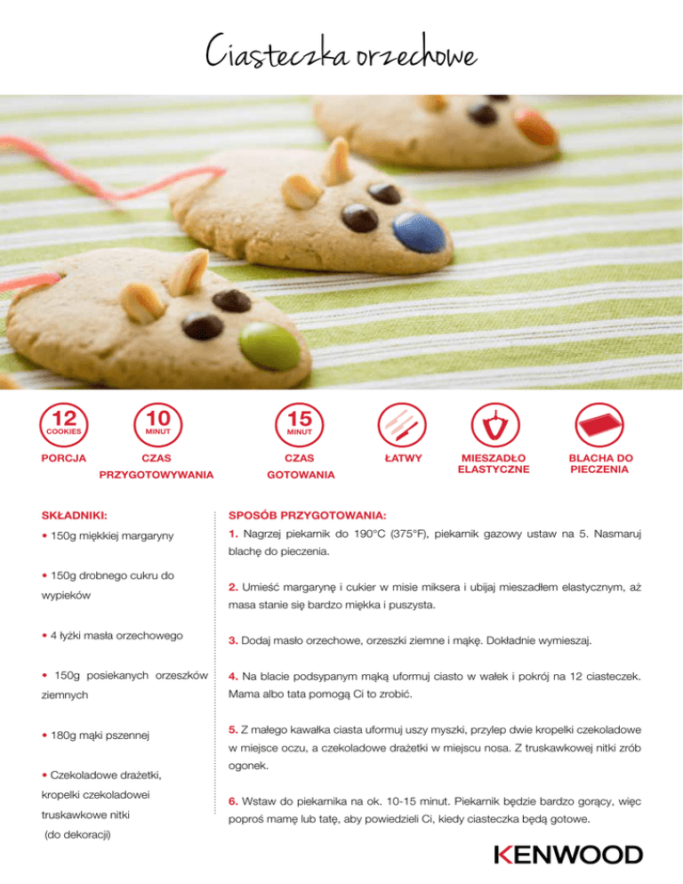 Ciasteczka orzechowe 12 10 15 Porcja Czas Czas przygotowywania gotowania cookies minut minut łatwy mieszadło elastyczne blacha do pieczenia Składniki: Sposób przygotowania: • 150g miękkiej margaryny 1. Nagrzej piekarnik do 190°C (375°F), piekarnik gazowy ustaw na 5. Nasmaruj blachę do pieczenia. • 150g drobnego cukru do wypieków 2. Umieść margarynę i cukier w misie miksera i ubijaj mieszadłem elastycznym, aż masa stanie się bardzo miękka i puszysta. • 4 łyżki masła orzechowego 3. Dodaj masło orzechowe, orzeszki ziemne i mąkę. Dokładnie wymieszaj. • 150g posiekanych orzeszków 4. Na blacie podsypanym mąką uformuj ciasto w wałek i pokrój na 12 ciasteczek. ziemnych Mama albo tata pomogą Ci to zrobić. • 180g mąki pszennej • Czekoladowe drażetki, kropelki czekoladowei truskawkowe nitki (do dekoracji) 5. Z małego kawałka ciasta uformuj uszy myszki, przylep dwie kropelki czekoladowe w miejsce oczu, a czekoladowe drażetki w miejscu nosa. Z truskawkowej nitki zrób ogonek. 6. Wstaw do piekarnika na ok. 10-15 minut. Piekarnik będzie bardzo gorący, więc poproś mamę lub tatę, aby powiedzieli Ci, kiedy ciasteczka będą gotowe.