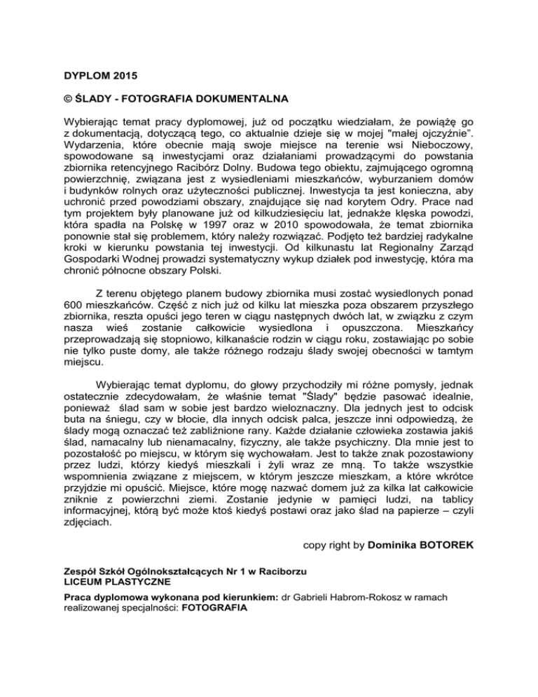 DYPLOM 2015 © ŚLADY - FOTOGRAFIA DOKUMENTALNA Wybierając temat pracy dyplomowej, już od początku wiedziałam, że powiążę go z dokumentacją, dotyczącą tego, co aktualnie dzieje się w mojej "małej ojczyźnie”. Wydarzenia, które obecnie mają swoje miejsce na terenie wsi Nieboczowy, spowodowane są inwestycjami oraz działaniami prowadzącymi do powstania zbiornika retencyjnego Racibórz Dolny. Budowa tego obiektu, zajmującego ogromną powierzchnię, związana jest z wysiedleniami mieszkańców, wyburzaniem domów i budynków rolnych oraz użyteczności publicznej. Inwestycja ta jest konieczna, aby uchronić przed powodziami obszary, znajdujące się nad korytem Odry. Prace nad tym projektem były planowane już od kilkudziesięciu lat, jednakże klęska powodzi, która spadła na Polskę w 1997 oraz w 2010 spowodowała, że temat zbiornika ponownie stał się problemem, który należy rozwiązać. Podjęto też bardziej radykalne kroki w kierunku powstania tej inwestycji. Od kilkunastu lat Regionalny Zarząd Gospodarki Wodnej prowadzi systematyczny wykup działek pod inwestycję, która ma chronić północne obszary Polski. Z terenu objętego planem budowy zbiornika musi zostać wysiedlonych ponad 600 mieszkańców. Część z nich już od kilku lat mieszka poza obszarem przyszłego zbiornika, reszta opuści jego teren w ciągu następnych dwóch lat, w związku z czym nasza wieś zostanie całkowicie wysiedlona i opuszczona. Mieszkańcy przeprowadzają się stopniowo, kilkanaście rodzin w ciągu roku, zostawiając po sobie nie tylko puste domy, ale także różnego rodzaju ślady swojej obecności w tamtym miejscu. Wybierając temat dyplomu, do głowy przychodziły mi różne pomysły, jednak ostatecznie zdecydowałam, że właśnie temat "Ślady" będzie pasować idealnie, ponieważ ślad sam w sobie jest bardzo wieloznaczny. Dla jednych jest to odcisk buta na śniegu, czy w błocie, dla innych odcisk palca, jeszcze inni odpowiedzą, że ślady mogą oznaczać też zabliźnione rany. Każde działanie człowieka zostawia jakiś ślad, namacalny lub nienamacalny, fizyczny, ale także psychiczny. Dla mnie jest to pozostałość po miejscu, w którym się wychowałam. Jest to także znak pozostawiony przez ludzi, którzy kiedyś mieszkali i żyli wraz ze mną. To także wszystkie wspomnienia związane z miejscem, w którym jeszcze mieszkam, a które wkrótce przyjdzie mi opuścić. Miejsce, które mogę nazwać domem już za kilka lat całkowicie zniknie z powierzchni ziemi. Zostanie jedynie w pamięci ludzi, na tablicy informacyjnej, którą być może ktoś kiedyś postawi oraz jako ślad na papierze – czyli zdjęciach. copy right by Dominika BOTOREK Zespół Szkół Ogólnokształcących Nr 1 w Raciborzu LICEUM PLASTYCZNE Praca dyplomowa wykonana pod kierunkiem: dr Gabrieli Habrom-Rokosz w ramach realizowanej specjalności: FOTOGRAFIA