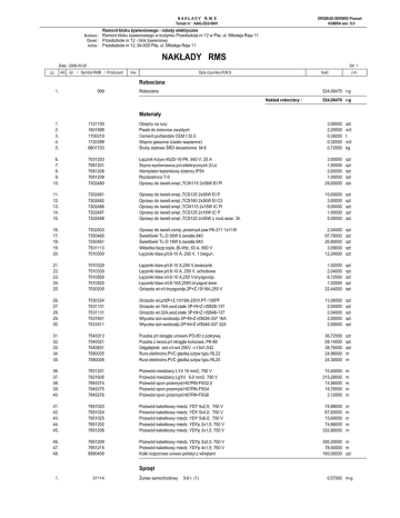 N A K Ł A D Y R, M, S Temat nr : AAG-ZS2-0001 ORGBUD-SERWIS Poznań KOBRA wer. 9.0 Remont bloku Ŝywieniowego - roboty elektryczne Budowa : Remont bloku Ŝywieniowego w budynku Przedszkola nr 12 w Pile, ul. Mikołaja Reja 11 Obiekt : Przedszkole nr 12 - blok Ŝywieniowy Adres : Przedszkole nr 12, 64-920 Piła, ul. Mikołaja Reja 11 NAKŁADY RMS Data : 2008-03-20 Lp. Str: 1 Alt. Gr. / Symbol KMB / Producent Inw. Opis czynnika R,M,S Ilość J.m. Robocizna 1. 999 Robocizna 524,06470 r-g Nakład robocizny : 524,06470 r-g Materiały 1. 2. 3. 4. 5. 1121100 1601899 1700310 1720399 6801703 Obejmy na rury Piaski do betonów zwykłych Cement portlandzki CEM I 32,5 Wapno gaszone (ciasto wapienne) Śruby stalowe ŚRD dwustronne M-8 3,00000 2,20000 0,38200 0,32000 0,72000 szt m3 t m3 kg 6. 7. 8. 9. 10. 7031203 7081201 7081208 7081209 7302480 Łącznik krzyw.4G25-10-PK, 660 V, 25 A Szyna wyrównawca pot.elektrycznych (Cu) Wentylator łazienkowy ścienny IP54 Rozdzielnica T-9 Oprawy do świetl.wnęt.,TCW115 2x36W EI PI 3,00000 1,00000 3,00000 1,00000 29,00000 szt szt szt szt szt 11. 12. 13. 14. 15. 7302481 7302482 7302486 7302487 7302488 Oprawy do świetl.wnęt.,TCS125 2x36W EI P Oprawy do świetl.wnęt.,TCS160 2x36W EI C3 Oprawy do świetl.wnęt.,TCW115 2x18W IC PI Oprawy do świetl.wnęt.,TCS125 2x18W IC P Oprawy do świetl.wnęt.,TCS125 2x36W z mod.awar. 3h 10,00000 3,00000 9,00000 1,00000 5,00000 szt szt szt szt szt 16. 17. 18. 19. 20. 7302503 7350460 7350461 7501113 7510300 Oprawy do świetl.comp.,przemysł.zaw.PK-211 1x11W Świetlówki TL-D 36W b.światła 840 Świetlówki TL-D 18W b.światła 840 Wkładka bezp.topik.,Bi-Wtz, 63 A, 660 V Łączniki klaw.p/t.6-10 A, 250 V, 1 biegun. 2,04000 97,76000 20,80000 3,09000 12,24000 szt szt szt szt szt 21. 22. 23. 24. 25. 7510320 7510330 7510500 7510520 7530200 Łączniki klaw.p/t.6-10 A,250 V,świecznik. Łączniki klaw.p/t.6-10 A, 250 V, schodowe Łączniki klaw.n/t.6-10 A,250 V,bryzgoodp. Łączniki klaw.n/t.6-10A,250V,bryzgod.świe. Gniazda wt.n/t bryzgoodp.2P+Z,10/16A,250 V 1,02000 2,04000 6,12000 1,02000 22,44000 szt szt szt szt szt 26. 27. 28. 29. 30. 7530324 7531101 7531131 7531601 7531611 Gniazdo wt.p/t2P+Z,10/16A,250V,PT-130PF Gniazdo wt.16A,wod.stałe 3P+N+Z nf2626-137 Gniazdo wt.32A,wod.stałe 3P+N+Z nf2646-137 Wtyczka izol.wodoodp.3P+N+Z nf3626-337 16A Wtyczka izol.wodoodp.3P+N+Z nf3646-337 32A 13,26000 2,04000 2,04000 2,00000 2,00000 szt szt szt szt szt 31. 32. 33. 34. 35. 7540013 7540021 7540601 7580025 7580026 Puszka p/t okrągła uniwers.PO-80 z pokrywą Puszka z tworz.p/t okrągła końcowa, PK-60 Odgałęźnik izol.n/t-w/t 250V, n.f.541,542 Rura elektroins.PVC gładka,sztyw.typu RL22 Rura elektroins.PVC gładka,sztyw.typu RL25 36,72000 58,14000 38,76000 24,96000 24,30000 szt szt szt m m 36. 37. 38. 39. 40. 7921201 7921605 7945274 7945275 7945276 Przewód miedziany LYd 16 mm2, 750 V Przewód miedziany LgYd 6,0 mm2, 750 V Przewód opon.przemysł.H07RN-F5G2,5 Przewód opon.przemysł.H07RN-F5G4 Przewód opon.przemysł.H07RN-F5G6 10,40000 215,28000 14,56000 19,76000 3,12000 m m m m m 41. 42. 43. 44. 45. 7951023 7951024 7951025 7951202 7951208 Przewód kabelkowy miedz. YDY 5x2,5; 750 V Przewód kabelkowy miedz. YDY 5x4,0; 750 V Przewód kabelkowy miedz. YDY 5x6,0; 750 V Przewód kabelkowy miedz. YDYp 2x1,5; 750 V Przewód kabelkowy miedz. YDYp 3x1,5; 750 V 74,88000 67,60000 15,60000 74,88000 332,80000 m m m m m 46. 47. 48. 7951209 7951215 8990400 Przewód kabelkowy miedz. YDYp 3x2,5; 750 V Przewód kabelkowy miedz. YDYp 4x1,5; 750 V Kołki rozporowe uniwer.polietyl.z wkrętami 395,20000 m 78,00000 m 160,00000 szt Sprzęt 1. 31114 śuraw samochodowy 5-6 t (1) 0,57000 m-g N A K Ł A D Y R, M, S Temat nr : AAG-ZS2-0001 ORGBUD-SERWIS Poznań KOBRA wer. 9.0 Remont bloku Ŝywieniowego - roboty elektryczne Data : 2008-03-20 Lp. Str: 2 Alt. Gr. / Symbol KMB / Producent 2. 39521 Inw. Opis czynnika R,M,S Samochód skrzyniowy do 5 t (1) UWAGA: Zestawienie obejmuje wyłącznie czynniki RMS występujące w pozycjach kosztorysu sporządzonych metodą szczegółową. - - - Koniec wydruku zestawienia nakładów R, M, S - - - Ilość J.m. 0,57000 m-g FORMULARZ OFERTOWY KOSZTORYS OFERTOWY Budowa : Remont bloku Ŝywieniowego w budynku Przedszkola nr 12 w Pile, ul. Mikołaja Reja 11 Obiekt : Przedszkole nr 12 - blok Ŝywieniowy Adres : Przedszkole nr 12, 64-920 Piła, ul. Mikołaja Reja 11 Remont bloku Ŝywieniowego - roboty elektryczne Inwestor : Urząd Miasta Piły, Wydział Oświaty 64-920 Piła, Pl. Stanisława Staszica 10 Wykonawca : ............................................................................. Adres : ............................................................................. Wartość kosztorysowa robót : ................ zł Podatek VAT .......... % : .................. zł WARTOŚĆ ROBÓT OGÓŁEM : ............... zł Słownie : ........................................................................................................ ........................................................................................................ WIODĄCE NARZUTY I STAWKI KOSZTORYSU Stawka roboczogodziny R-g : ............... zł / r-g Narzut kosztów zakupu materiałów Kz : ............... % Narzut kosztów pośrednich Kp : .......... % od Robocizny [Kp_R] + .......... % od Sprzętu [Kp_S] Narzut zysku Z : ........... % od (R + Kp_R) + ........... % od (M + Kz) + ........... % od (S + Kp_S) Podstawa wyceny : ..................................................................................... Poziom cen : ..................................................................................... Opracowanie : ...................................................... Data : ........ / ....... / ........ Sprawdził : ...................................................... Data : ........ / ....... / ........ ORGBUD-SERWIS Poznań KOBRA wer. 9.0 FORMULARZ OFERTOWY ORGBUD-SERWIS Poznań KOBRA wer. 9.0 Remont bloku Ŝywieniowego - roboty elektryczne Budowa
