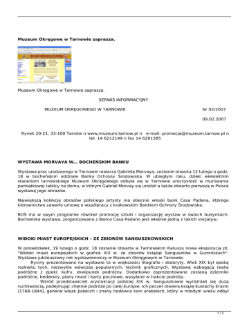 Muzeum Okręgowe w Tarnowie zaprasza. Muzeum Okręgowe w Tarnowie zaprasza. SERWIS INFORMACYJNY MUZEUM OKRĘGOWEGO W TARNOWIE Nr 02/2007 09.02.2007 Rynek 20-21, 33-100 Tarnów n www.muzeum.tarnow.pl n e-mail: [email protected] n tel. 14 6212149 n fax 14 6261585 WYSTAWA MORVAYA W… BOCHEŃSKIM BANKU Wystawa prac urodzonego w Tarnowie malarza Gabriela Morvaya, zostanie otwarta 12 lutego o godz. 18 w bocheńskim oddziale Banku Ochrony Środowiska. W ubiegłym roku, dzieki wieloletnim staraniom tarnowskiego Muzeum Okręgowego odbyła się w Tarnowie uroczystość w murowania pamiątkowej tablicy na domu, w którym Gabriel Morvay się urodził a także otwarto pierwszą w Polsce wystawę jego obrazów. Największą kolekcję obrazów polskiego artysty ma obecnie włoski bank Casa Padana, którego kierownictwo zawarło umowę o współpracy z krakowskim Bankiem Ochrony Środowiska. BOŚ ma w swym programie również promocję sztuki i organizację wystaw w swoich budynkach. Bocheńska wystawa, zorganizowana z Banco Casa Padano jest właśnie jedną z takich inicjatyw. WIDOKI MIAST EUROPEJSKICH – ZE ZBIORÓW SANGUSZKOWSKICH W poniedziałek, 19 lutego o godz. 18 zostanie otwarta w Tarnowskim Ratuszu nowa ekspozycja pt. "Widoki miast europejskich w grafice XIX w. ze zbiorów książąt Sanguszków w Gumniskach". Wystawa jubileuszowy rok wystawienniczy w Muzeum Okręgowym w Tarnowie. Ryciny prezentowane na wystawie to w większości litografie i staloryty. Wiek XIX był epoką rozkwitu tych, niezwykle wówczas popularnych, technik graficznych. Wystawę wzbogacą realia podróżne z epoki: kufry, ekwipunek podróżny. Dodatkowo zaprezentowane zostaną dzienniki podróżne, bedekery, plany miast i karty pocztowe, wysyłane w trakcie podróży. Wśród przedstawicieli arystokracji polskiej XIX w. Sanguszkowie wyróżniali się dużą ruchliwością, podejmując chętnie podróże po całej Europie. Ich poczet otwiera książę Eustachy Erazm (1768-1844), generał wojsk polskich i znany hodowca koni arabskich, który w młodym wieku odbył 1/2 edukacyjną podróż po Europie, Europie latach 1785-1788 zwiedzając Francję oraz Włochy. W Neapolu spotkał się ze Stanisławem Kostką Potockim, najwybitniejszym wówczas w Polsce znawcą sztuk pięknych, a swoje wrażenia opisał w dzienniku podróży zatytułowanym "diariusz ciekawszych rzeczy". Kontynuowali je kolejni przedstawiciele rodziny: Roman Adam Sanguszko, Władysław Hieronim i inni. Nierzadko celem wyjazdów były kuracje. W wieku XIX szybko wzrasta liczba uzdrowisk, do których coraz częściej udają się przedstawiciele wytwornej socjety z całej Europy, a nawet z Ameryki. Do Karlsbadu, Meranu, Nicei, Cannes oraz Vichy przyjeżdżają również Sanguszkowie, nieraz po kilka razy w roku. Władysław i Izabela oraz ich synowie, książęta Roman Damian (1832-1917), Paweł (1834-1876) i Eustachy Sanguszko (1842-1903) są częstymi gośćmi w europejskich uzdrowiskach. Najstarszy z braci, Roman Damian zaczyna odwiedzać kurorty po 1862 r. Dwaj młodsi bracia, ze względu na chorobę płuc (rozwijająca się gruźlica) regularnie wyjeżdżają na południe Europy i do popularnych kurortów austriackich. Grafiki z widokami najbardziej znanych miejsc w Europie, przechowywane obecnie w Muzeum Okręgowym w Tarnowie, są czymś więcej niż tylko historyczną dokumentacją podróży odbywanych przez przedstawicieli tego znakomitego rodu. Dla podróżników były upamiętnieniem konkretnego pobytu i potwierdzeniem związanych z nim przeżyć, które dla współczesnego widza pozostaną tajemnicą, choć można niekiedy domyślać się ich treści -poprzez dobór miejsc i widoków utrwalonych w grafice, ich nabywcy starali się przecież wypowiedzieć swój pozytywny stosunek do tego, co widzieli i przeżyli, wyrazić swoje zainteresowania, entuzjazm i pasje. W dobie, kiedy nie istniała jeszcze fotografia, jak i później, kiedy technika fotografowania, znajdująca się dopiero w zalążku, nie pozwalała na swobodne posługiwanie się aparatem w plenerze, grafika widokowa była niczym innym, jak tylko najbardziej dostępną formą "pamiątki z podróży". Ogólnopolski Konkurs Poezji Romskiej im. Papuszy Muzeum Okręgowe w Tarnowie wraz ze Stowarzyszeniem Kultury Romów w Tarnowie, organizuje Ogólnopolski Konkurs Poezji Romskiej im. Papuszy, w 20-stą rocznicę śmierci znanej poetki romskiej. Papusza, która naprawdę nazywała się Bronisława Wajs, pochodziła z grupy wędrownych Cyganów/Romów. Jej niezwykły talent oraz późniejsza twóczość zostały odkryte przez poetę i znawcę kultury romskiej Jerzego Ficowskiego. Dorobek poetycki Papuszy i jej postać zostały docenione przyznanym w 1958 roku wyróżnieniem-Lubuską Nagrodą Literacką a w 1978 roku nagrodą Ministra Kultury. Dla upamiętnienia jej pamięci adresowany jest do Państwa Konkurs wierszy o tematyce romskiej, w dwóch kategoriach, zaznaczonych w konkursowym regulaminie. Termin ich nadsyłania upływa 31 maja 2007. Szczegółowych informacji udziela Muzeum Etnograficzne w Tarnowie, pod numerem tel: 014 622-06-25. Więcej informacji na stronie www.muzeum.tarnow.pl. 2/2 Powered by TCPDF (www.tcpdf.org)