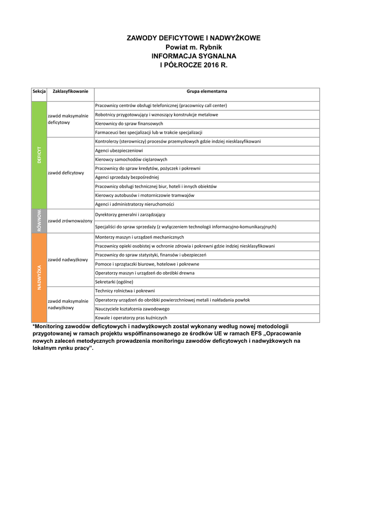 ZAWODY DEFICYTOWE I NADWYŻKOWE Powiat m. Rybnik INFORMACJA SYGNALNA I PÓŁROCZE 2016 R. Sekcja Zaklasyfikowanie Grupa elementarna Pracownicy centrów obsługi telefonicznej (pracownicy call center) zawód maksymalnie deficytowy Robotnicy przygotowujący i wznoszący konstrukcje metalowe Kierownicy do spraw finansowych Farmaceuci bez specjalizacji lub w trakcie specjalizacji DEFICYT Kontrolerzy (sterowniczy) procesów przemysłowych gdzie indziej niesklasyfikowani Agenci ubezpieczeniowi Kierowcy samochodów ciężarowych zawód deficytowy Pracownicy do spraw kredytów, pożyczek i pokrewni Agenci sprzedaży bezpośredniej Pracownicy obsługi technicznej biur, hoteli i innych obiektów RÓWNOWAGA Kierowcy autobusów i motorniczowie tramwajów Agenci i administratorzy nieruchomości Dyrektorzy generalni i zarządzający zawód zrównoważony Specjaliści do spraw sprzedaży (z wyłączeniem technologii informacyjno-komunikacyjnych) Monterzy maszyn i urządzeń mechanicznych Pracownicy opieki osobistej w ochronie zdrowia i pokrewni gdzie indziej niesklasyfikowani NADWYŻKA zawód nadwyżkowy Pracownicy do spraw statystyki, finansów i ubezpieczeń Pomoce i sprzątaczki biurowe, hotelowe i pokrewne Operatorzy maszyn i urządzeń do obróbki drewna Sekretarki (ogólne) Technicy rolnictwa i pokrewni zawód maksymalnie nadwyżkowy Operatorzy urządzeń do obróbki powierzchniowej metali i nakładania powłok Nauczyciele kształcenia zawodowego Kowale i operatorzy pras kuźniczych *Monitoring zawodów deficytowych i nadwyżkowych został wykonany według nowej metodologii przygotowanej w ramach projektu współfinansowanego ze środków UE w ramach EFS „Opracowanie nowych zaleceń metodycznych prowadzenia monitoringu zawodów deficytowych i nadwyżkowych na lokalnym rynku pracy”. ZAWODY DEFICYTOWE I NADWYŻKOWE Powiat rybnicki INFORMACJA SYGNALNA I PÓŁROCZE 2016 R. Sekcja Zaklasyfikowanie Grupa elementarna Operatorzy maszyn do produkcji wyrobów z tworzyw sztucznych Agenci ubezpieczeniowi Inżynierowie mechanicy Kierownicy do spraw logistyki i dziedzin pokrewnych DEFICYT Zaopatrzeniowcy zawód maksymalnie deficytowy Kierownicy do spraw budownictwa Kierownicy do spraw marketingu i sprzedaży Kierownicy do spraw produkcji przemysłowej Programiści aplikacji Analitycy systemów komputerowych Pracownicy centrów obsługi telefonicznej (pracownicy call center) RÓWNOWAGA Projektanci aplikacji sieciowych i multimediów zawód deficytowy Kierowcy autobusów i motorniczowie tramwajów Pomocniczy personel medyczny zawód zrównoważony Psycholodzy i pokrewni Tapicerzy i pokrewni Operatorzy aparatury medycznej Robotnicy czyszczący konstrukcje budowlane i pokrewni zawód nadwyżkowy Kelnerzy Projektanci grafiki i multimediów Pomoce kuchenne Pracownicy do spraw rachunkowości i księgowości Pomoce i sprzątaczki biurowe, hotelowe i pokrewne NADWYŻKA Technicy mechanicy Szwaczki, hafciarki i pokrewni Recepcjoniści hotelowi Inżynierowie górnictwa i metalurgii Monterzy maszyn i urządzeń mechanicznych Operatorzy urządzeń energetycznych zawód maksymalnie nadwyżkowy Praczki ręczne i prasowacze Operatorzy maszyn do produkcji obuwia i pokrewni Operatorzy maszyn i urządzeń do przeróbki mechanicznej kopalin Specjaliści nauk o Ziemi Pracownicy usług domowych Ustawiacze i operatorzy maszyn do obróbki i produkcji wyrobów z drewna Nauczyciele akademiccy *Monitoring zawodów deficytowych i nadwyżkowych został wykonany według nowej metodologii przygotowanej w ramach projektu współfinansowanego ze środków UE w ramach EFS „Opracowanie nowych zaleceń metodycznych prowadzenia monitoringu zawodów deficytowych i nadwyżkowych na lokalnym rynku pracy”.