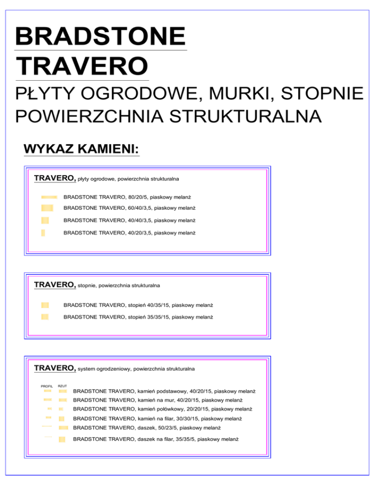 BRADSTONE TRAVERO PŁYTY OGRODOWE, MURKI, STOPNIE POWIERZCHNIA STRUKTURALNA WYKAZ KAMIENI: TRAVERO, płyty ogrodowe, powierzchnia strukturalna BRADSTONE TRAVERO, 80/20/5, piaskowy melanż BRADSTONE TRAVERO, 60/40/3,5, piaskowy melanż BRADSTONE TRAVERO, 40/40/3,5, piaskowy melanż BRADSTONE TRAVERO, 40/20/3,5, piaskowy melanż TRAVERO, stopnie, powierzchnia strukturalna BRADSTONE TRAVERO, stopień 40/35/15, piaskowy melanż BRADSTONE TRAVERO, stopień 35/35/15, piaskowy melanż TRAVERO, system ogrodzeniowy, powierzchnia strukturalna PROFIL RZUT BRADSTONE TRAVERO, kamień podstawowy, 40/20/15, piaskowy melanż BRADSTONE TRAVERO, kamień na mur, 40/20/15, piaskowy melanż BRADSTONE TRAVERO, kamień połówkowy, 20/20/15, piaskowy melanż BRADSTONE TRAVERO, kamień na filar, 30/30/15, piaskowy melanż BRADSTONE TRAVERO, daszek, 50/23/5, piaskowy melanż BRADSTONE TRAVERO, daszek na filar, 35/35/5, piaskowy melanż