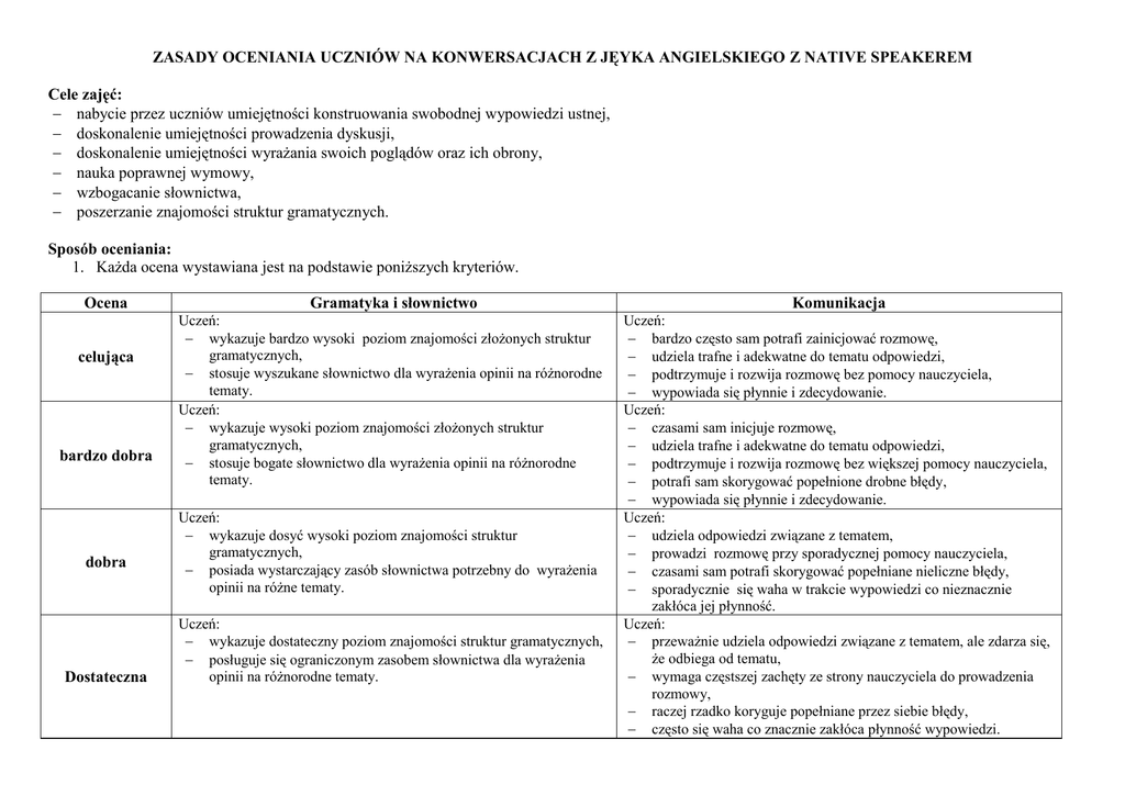 ZASADY OCENIANIA UCZNIÓW NA KONWERSACJACH Z JĘYKA ANGIELSKIEGO Z NATIVE SPEAKEREM Cele zajęć: nabycie przez uczniów umiejętności konstruowania swobodnej wypowiedzi ustnej, doskonalenie umiejętności prowadzenia dyskusji, doskonalenie umiejętności wyrażania swoich poglądów oraz ich obrony, nauka poprawnej wymowy, wzbogacanie słownictwa, poszerzanie znajomości struktur gramatycznych. Sposób oceniania: 1. Każda ocena wystawiana jest na podstawie poniższych kryteriów. Ocena celująca bardzo dobra dobra Dostateczna Gramatyka i słownictwo Komunikacja Uczeń: wykazuje bardzo wysoki poziom znajomości złożonych struktur gramatycznych, stosuje wyszukane słownictwo dla wyrażenia opinii na różnorodne tematy. Uczeń: wykazuje wysoki poziom znajomości złożonych struktur gramatycznych, stosuje bogate słownictwo dla wyrażenia opinii na różnorodne tematy. Uczeń: bardzo często sam potrafi zainicjować rozmowę, udziela trafne i adekwatne do tematu odpowiedzi, podtrzymuje i rozwija rozmowę bez pomocy nauczyciela, wypowiada się płynnie i zdecydowanie. Uczeń: czasami sam inicjuje rozmowę, udziela trafne i adekwatne do tematu odpowiedzi, podtrzymuje i rozwija rozmowę bez większej pomocy nauczyciela, potrafi sam skorygować popełnione drobne błędy, wypowiada się płynnie i zdecydowanie. Uczeń: udziela odpowiedzi związane z tematem, prowadzi rozmowę przy sporadycznej pomocy nauczyciela, czasami sam potrafi skorygować popełniane nieliczne błędy, sporadycznie się waha w trakcie wypowiedzi co nieznacznie zakłóca jej płynność. Uczeń: przeważnie udziela odpowiedzi związane z tematem, ale zdarza się, że odbiega od tematu, wymaga częstszej zachęty ze strony nauczyciela do prowadzenia rozmowy, raczej rzadko koryguje popełniane przez siebie błędy, często się waha co znacznie zakłóca płynność wypowiedzi. Uczeń: wykazuje dosyć wysoki poziom znajomości struktur gramatycznych, posiada wystarczający zasób słownictwa potrzebny do wyrażenia opinii na różne tematy. Uczeń: wykazuje dostateczny poziom znajomości struktur gramatycznych, posługuje się ograniczonym zasobem słownictwa dla wyrażenia opinii na różnorodne tematy. dopuszczająca Uczeń: wykazuje podstawowy poziom znajomości złożonych struktur gramatycznych, posługuje się bardzo ubogim zasobem słownictwa dla wyrażenia opinii na różnorodne tematy. Uczeń: często odbiega od tematu, ma spore trudności w wyrażaniu opinii bez pomocy nauczyciela, wymaga bardzo częstej zachęty do udziału w dyskusji, popełnia wiele błędów w trakcie wypowiedzi, których nie potrafi samodzielnie skorygować, wypowiada się bardzo niepewnie. Nie spełnia ani jednego kryterium dla uzyskania oceny pozytywnej. niedostateczna 2. Nie przewiduje się prac domowych z przedmiotu w związku z tym uczniowie nie mają możliwości zgłaszania nieprzygotowań. 3. Uczniowie mogą zbierać plusy za zaangażowanie w zajęcia na przestrzeni semestru. Na koniec otrzymają ocenę w zależności od liczby uzyskanych plusów. Cel Bdb Db Dst Dop Nast. 12 plusów lub więcej 9-11 7-8 5-6 3-4 2-0 4. Uczniowie bardzo aktywni mogą otrzymać ocenę pozytywną po każdej lekcji zgodną z kryteriami przedstawionymi w punkcie 1.