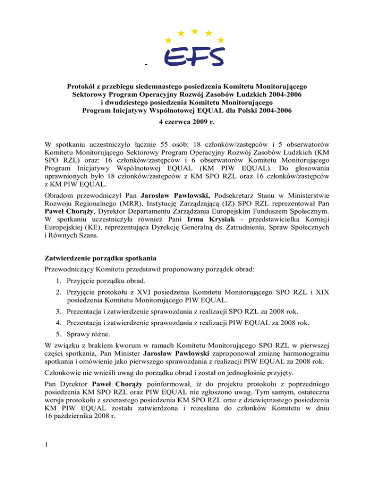Protokół z przebiegu siedemnastego posiedzenia Komitetu Monitorującego Sektorowy Program Operacyjny Rozwój Zasobów Ludzkich 2004-2006 i dwudziestego posiedzenia Komitetu Monitorującego Program Inicjatywy Wspólnotowej EQUAL dla Polski 2004-2006 4 czerwca 2009 r. W spotkaniu uczestniczyło łącznie 55 osób: 18 członków/zastępców i 5 obserwatorów Komitetu Monitorującego Sektorowy Program Operacyjny Rozwój Zasobów Ludzkich (KM SPO RZL) oraz: 16 członków/zastępców i 6 obserwatorów Komitetu Monitorującego Program Inicjatywy Wspólnotowej EQUAL (KM PIW EQUAL). Do głosowania uprawnionych było 18 członków/zastępców z KM SPO RZL oraz 16 członków/zastępców z KM PIW EQUAL. Obradom przewodniczył Pan Jarosław Pawłowski, Podsekretarz Stanu w Ministerstwie Rozwoju Regionalnego (MRR). Instytucję Zarządzającą (IZ) SPO RZL reprezentował Pan Paweł Chorąży, Dyrektor Departamentu Zarządzania Europejskim Funduszem Społecznym. W spotkaniu uczestniczyła również Pani Irma Krysiak - przedstawicielka Komisji Europejskiej (KE), reprezentująca Dyrekcję Generalną ds. Zatrudnienia, Spraw Społecznych i Równych Szans. Zatwierdzenie porządku spotkania Przewodniczący Komitetu przedstawił proponowany porządek obrad: 1. Przyjęcie porządku obrad. 2. Przyjęcie protokołu z XVI posiedzenia Komitetu Monitorującego SPO RZL i XIX posiedzenia Komitetu Monitorującego PIW EQUAL. 3. Prezentacja i zatwierdzenie sprawozdania z realizacji SPO RZL za 2008 rok. 4. Prezentacja i zatwierdzenie sprawozdania z realizacji PIW EQUAL za 2008 rok. 5. Sprawy różne. W związku z brakiem kworum w ramach Komitetu Monitorującego SPO RZL w pierwszej części spotkania, Pan Minister Jarosław Pawłowski zaproponował zmianę harmonogramu spotkania i omówienie jako pierwszego sprawozdania z realizacji PIW EQUAL za 2008 rok. Członkowie nie wnieśli uwag do porządku obrad i został on jednogłośnie przyjęty. Pan Dyrektor Paweł Chorąży poinformował, iż do projektu protokołu z poprzedniego posiedzenia KM SPO RZL oraz PIW EQUAL nie zgłoszono uwag. Tym samym, ostateczna wersja protokołu z szesnastego posiedzenia KM SPO RZL oraz z dziewiętnastego posiedzenia KM PIW EQUAL została zatwierdzona i rozesłana do członków Komitetu w dniu 16 października 2008 r. 1 Prezentacja i zatwierdzenie sprawozdania z realizacji PIW EQUAL za 2008 rok Sprawozdanie z realizacji PIW EQUAL za 2008 r. zostało zaprezentowane przez Pana Dyrektora Pawła Chorążego. Na wstępie Pan Dyrektor poinformował, iż PIW EQUAL jest jednym z dwóch programów, co do których Polska nie wystąpiła o przedłużenie okresu kwalifikowalności. Wyjaśnił, iż w związku ze skutkami kryzysu gospodarczego, jesienią 2008 r. Komisja Europejska umożliwiła krajom członkowskim, które miały trudności z dokończeniem wdrażania poszczególnych programów, wydłużenie ich okresów kwalifikowalności. Pan Dyrektor powiedział, iż ze względu na wysoki stopień wydatkowania w ramach PIW EQUAL, ubieganie się o taką zgodę nie było konieczne. Podsumowując wdrażanie PIW EQUAL w 2008 r., Pan Dyrektor podkreślił, iż był to czas poświęcony w szczególności upowszechnianiu wyników i rezultatów wypracowanych przez poszczególne partnerstwa, a także ich implementowaniu do polityk na poziomie krajowym. W okresie sprawozdawczym zakończono realizację Działania 2 (marzec) i Działania 3 (czerwiec). Prowadzono również czynności związane z ewaluacją projektów oraz wdrażaniem wypracowanych rekomendacji do przedsięwzięć realizowanych w ramach perspektywy 2007-2013. Ponadto, kontynuowano działania o charakterze informacyjnopromocyjnym, w tym przygotowanie i wydawanie publikacji, organizowanie konferencji zamykających oraz inne zadania związane z upowszechnieniem rezultatów. Pan Dyrektor dodał także, iż w 2008 r. kluczowe znaczenie miały działania upowszechniające rezultaty EQUAL, w tym m.in.: seminarium poświęcone osobom 50+ na rynku pracy, II posiedzenie Grupy Strategicznej, podczas której zaprezentowano bariery dla rozwoju ekonomii społecznej i propozycje zmian legislacyjnych wypracowanych w ramach Krajowych Sieci Tematycznych Tematu D oraz konferencja podsumowująca wdrażanie PIW EQUAL w Polsce połączona z wręczeniem statuetek Jaskółki rynku pracy za najbardziej innowacyjne przedsięwzięcia. Ponadto w 2008 r. na Instytucję Zarządzającą PO KL przeniesiono prawa majątkowe do rezultatów PIW EQUAL oraz ich upowszechniania na mocy licencji creative commons. Pan Dyrektor Paweł Chorąży zwrócił również uwagę, iż we wrześniu 2008 r. zakończono realizację projektów uzupełniających, mających na celu upowszechnienie najlepszych praktyk PIW EQUAL z obszarów ekonomii społecznej, rozwoju obszarów wiejskich, kształcenia ustawicznego i gender mainstreaming poprzez media, konferencje i mikrogranty. Następnie Pan Dyrektor przedstawił informacje dotyczące postępu finansowego. Według stanu na 31 grudnia 2008 r. poziom wydatków zrefundowanych w ramach PIW EQUAL wyniósł 102,77% alokacji. Jeśli chodzi o wydatki poświadczone przez Instytucję Płatniczą, poziom ten osiągnął 84,58% w stosunku do alokacji. Pan Dyrektor omówił także kluczowe wskaźniki realizacji PIW EQUAL. Według stanu na 31 grudnia 2008 r. wsparciem od początku realizacji Programu objęto blisko 50 tys. osób, w tym w 2008 r. około 8,5 tys. Ponad 47% osób objętych wsparciem stanowiły kobiety. Wśród przedsiębiorstw objętych wsparciem 88% stanowiły MŚP. Ponadto poinformował, iż powstały 63 przedsiębiorstwa społeczne oraz 29 struktur wspierających ich powstawanie. Podsumowując, Pan Dyrektor wskazał, iż w chwili obecnej trwają działania związane z ostatecznym rozliczeniem i zamknięciem projektów. Sprawozdanie końcowe podsumowujące wdrażanie PIW EQUAL w Polsce zostanie przedstawione podczas ostatniego posiedzenia Komitetu. Pan Minister Jarosław Pawłowski podziękował za preze