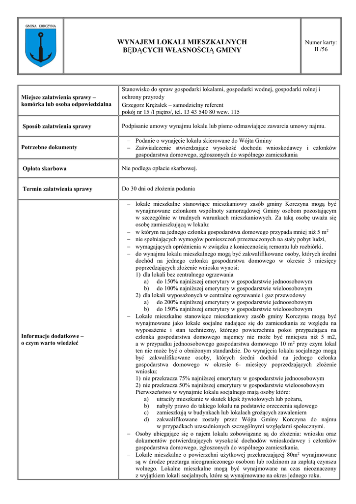 WYNAJEM LOKALI MIESZKALNYCH BĘDĄCYCH WŁASNOŚCIĄ GMINY Numer karty: II /56 Miejsce załatwienia sprawy – komórka lub osoba odpowiedzialna Stanowisko do spraw gospodarki lokalami, gospodarki wodnej, gospodarki rolnej i ochrony przyrody Grzegorz Krężałek – samodzielny referent pokój nr 15 /I piętro/, tel. 13 43 540 80 wew. 115 Sposób załatwienia sprawy Podpisanie umowy wynajmu lokalu lub pismo odmawiające zawarcia umowy najmu. Potrzebne dokumenty Podanie o wynajęcie lokalu skierowane do Wójta Gminy Zaświadczenie stwierdzające wysokość dochodu wnioskodawcy i członków gospodarstwa domowego, zgłoszonych do wspólnego zamieszkania Opłata skarbowa Nie podlega opłacie skarbowej. Termin załatwienia sprawy Do 30 dni od złożenia podania Informacje dodatkowe – o czym warto wiedzieć lokale mieszkalne stanowiące mieszkaniowy zasób gminy Korczyna mogą być wynajmowane członkom wspólnoty samorządowej Gminy osobom pozostającym w szczególnie w trudnych warunkach mieszkaniowych. Za taką osobę uważa się osobę zamieszkującą w lokalu: w którym na jednego członka gospodarstwa domowego przypada mniej niż 5 m2 nie spełniających wymogów pomieszczeń przeznaczonych na stały pobyt ludzi, wymagających opróżnienia w związku z koniecznością remontu lub rozbiórki. do wynajmu lokalu mieszkalnego mogą być zakwalifikowane osoby, których średni dochód na jednego członka gospodarstwa domowego w okresie 3 miesięcy poprzedzających złożenie wniosku wynosi: 1) dla lokali bez centralnego ogrzewania a) do 150% najniższej emerytury w gospodarstwie jednoosobowym b) do 100% najniższej emerytury w gospodarstwie wieloosobowym 2) dla lokali wyposażonych w centralne ogrzewanie i gaz przewodowy a) do 200% najniższej emerytury w gospodarstwie jednoosobowym b) do 150% najniższej emerytury w gospodarstwie wieloosobowym Lokale mieszkalne stanowiące mieszkaniowy zasób gminy Korczyna mogą być wynajmowane jako lokale socjalne nadające się do zamieszkania ze względu na wyposażenie i stan techniczny, którego powierzchnia pokoi przypadająca na członka gospodarstwa domowego najemcy nie może być mniejsza niż 5 m2, a w przypadku jednoosobowego gospodarstwa domowego 10 m2 przy czym lokal ten nie może być o obniżonym standardzie. Do wynajęcia lokalu socjalnego mogą być zakwalifikowane osoby, których średni dochód na jednego członka gospodarstwa domowego w okresie 6- miesięcy poprzedzających złożenie wniosku: 1) nie przekracza 75% najniższej emerytury w gospodarstwie jednoosobowym 2) nie przekracza 50% najniższej emerytury w gospodarstwie wieloosobowym Pierwszeństwo w wynajmie lokalu socjalnego mają osoby które: a) utraciły mieszkanie w skutek klęsk żywiołowych lub pożaru, b) nabyły prawo do takiego lokalu na podstawie orzeczenia sądowego c) zamieszkują w budynkach lub lokalach grożących zawaleniem d) zakwalifikowane zostały przez Wójta Gminy Korczyna do najmu w przypadkach uzasadnionych szczególnymi względami społecznymi. Osoby ubiegające się o najem lokalu zobowiązane są do złożenia: wniosku oraz dokumentów potwierdzających wysokość dochodów wnioskodawcy i członków gospodarstwa domowego, zgłoszonych do wspólnego zamieszkania. Lokale mieszkalne o powierzchni użytkowej przekraczającej 80m2 wynajmowane są w drodze przetargu nieograniczonego osobom lub rodzinom za zapłatą czynszu wolnego. Lokalne mieszkalne mogą być wynajmowane na czas nieoznaczony z wyjątkiem lokali socjalnych, które są wynajmowane na okres jednego roku. Nie przysługuje Tryb odwoławczy Podstawa prawna Formularze do pobrania Art. 21 ust 1 pkt 1 i ust. 2 ustawy z dnia 21 czerwca 2001r. o ochronie praw lokatorów, mieszkaniowym zasobie gminy i o zmianie Kodeksu Cywilnego (Dz. U. z 2005r. Nr 31, poz. 266 z późn. zm.) Uchwała Nr XXXVIII/274/06 Rady Gminy Korczyna z dnia 21 sierpnia 2006r. w sprawie zasad wynajmowania lokali wchodzących w skład mieszkaniowego zasobu Gminy Korczyna Uchwała Nr XXXVIII/273/06 Rady Gminy Korczyna z dnia 21 sierpnia 2006r. w sprawie programu gospodarowania mieszkaniowym zasobem gminy Korczyna w latach 2006-2011. Uchwała Nr IV/30/11 Rady Gminy Korczyna z dnia 15 lutego 2007r. o zmianie uchwały w sprawie programu gospodarowania mieszkaniowym zasobem gminy Korczyna w latach 2006-2011. Zarządzenie Nr 9/10 Wójta Gminy Korczyna z dnia 27.12.2011r. o zmianie zarządzenia w sprawie wysokości stawek czynszu najmu lokali mieszkalnych Wniosek o najem lokalu mieszkalnego/socjalnego Urząd Gminy Korczyna ul. Rynek 18A, 38 - 420 Korczyna, tel. 13 43 540 80, fax 13 43 540 96 e-mail: [email protected] NIP 684 20 20 733 REGON 000548117 Nr konta bankowego: 97 8642 1083 2002 8307 0679 0001 Godziny otwarcia Urzędu: 730 – 1530 Zaktualizował: Grzegorz Krężałek 26.06.2013 Sprawdziła: Elżbieta Rak 04.07.2013 Zatwierdził: Jan Zych 11.07.2013