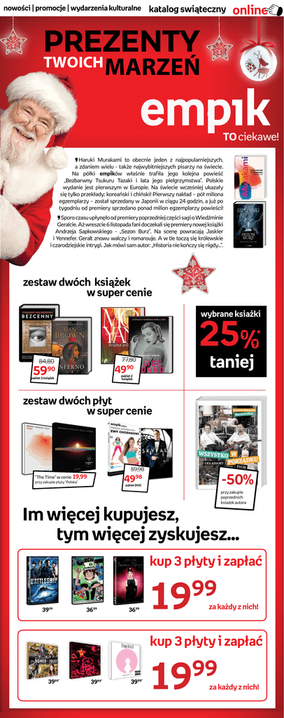 nowości | promocje | wydarzenia kulturalne katalog swiąteczny online PREZENTY TWOICH TO ciekawe! • Haruki Murakami to obecnie jeden z najpopularniejszych, a zdaniem wielu - także najwybitniejszych pisarzy na świecie. Na półki ów właśnie trafiła jego kolejna powieść „Bezbarwny Tsukuru Tazaki i lata jego pielgrzymstwa”. Polskie wydanie jest pierwszym w Europie. Na świecie wcześniej ukazały się tylko przekłady: koreański i chiński! Pierwszy nakład – pół miliona egzemplarzy – został sprzedany w Japonii w ciągu 24 godzin, a już po tygodniu od premiery sprzedano ponad milion egzemplarzy powieści! • Sporo czasu upłynęło od premiery poprzedniej części sagi o Wiedźminie Geralcie. Aż wreszcie 6 listopada fani doczekali się premiery nowej książki Andrzeja Sapkowskiego - „Sezon Burz”. Na scenę powracają Jaskier i Yennefer. Geralt znowu walczy i romansuje. A w tle toczą się królewskie i czarodziejskie intrygi. Jak mówi sam autor: „Historia nie kończy się nigdy…”. zestaw dwóch książek w super cenie wybrane ksiażki 25 taniej 77,80 90 84,80 59 49 90 pakiet 2 książek pakiet 2 książek zestaw dwóch płyt w super cenie 59,98 98 -50% 49 "The Time" w cenie 19,99 przy zakupie płyty "Polska" pakiet DVD przy zakupie poprzednich ksiażek autora Im więcej kupujesz, tym więcej zyskujesz... kup 3 płyty i zapłać 19 99 3999 3699 3699 za każdy z nich! kup 3 płyty i zapłać 39 99* 39 99* 39 99* 19 99 za każdy z nich!