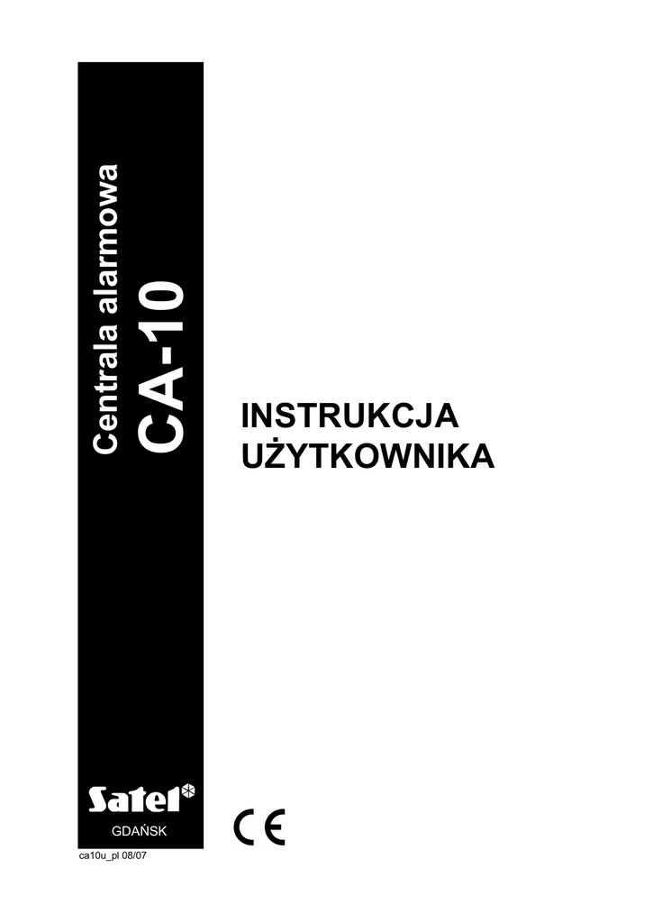 CA-10 Centrala alarmowa GDA SK ca10u_pl 08/07 INSTRUKCJA YTKOWNIKA OSTRZE ENIA Aby unikn problemów w eksploatacji centrali alarmowej zalecane jest zapoznanie si z instrukcj przed przyst pieniem do u ytkowania centrali. Nie wolno ingerowa w konstrukcj , b przeprowadza samodzielnych napraw. Dotyczy to w szczególno ci dokonywania zmian zespo ów i elementów. Czynno ci konserwacyjne b remontowe powinien wykonywa uprawniony personel (instalator serwis firmowy). Centrala wspó pracuje tylko z analogowymi czami abonenckimi. Pod czenie obwodu telefonicznego bezpo rednio do sieci cyfrowej (np. ISDN) powoduje zniszczenie urz dzenia. W przypadku zmiany analogowej sieci telefonicznej na cyfrow nale y skonsultowa si z instalatorem systemu alarmowego. Nale y zwróci szczególn uwag na cz st zaj to linii telefonicznej wykorzystywanej przez central oraz zg aszanie awarii dotycz cych tej linii lub monitoringu. Sytuacje takie nale y niezw ocznie zg asza instalatorowi systemu alarmowego. UWAGA! System alarmowy wyposa ony jest w akumulator. Po okresie eksploatacji nie nale y go wyrzuca , lecz zutylizowa w sposób zgodny z obowi zuj cymi przepisami (dyrektywy Unii Europejskiej 91/157/EEC I 93/86/EEC). Aktualn tre deklaracji zgodno ci EC i certyfikatów mo na pobra ze strony internetowej www.satel.pl SPIS TRE CI Sprawno techniczna systemu alarmowego ..................................................................2 Koszty funkcjonowania systemu alarmowego .................................................................2 Centrala CA-10................................................................................................................2 Czuwanie centrali ............................................................................................................3 Czuwanie pe ne...................................................................................................................... 3 Czuwanie ciche ...................................................................................................................... 3 Cz ciowe za czenie czuwania............................................................................................. 3 Czuwanie cz ciowe przy braku wyj cia z obiektu ................................................................. 3 Obs uga ...........................................................................................................................4 Funkcje diod LED ................................................................................................................... 5 Stany wej dozorowych centrali w manipulatorze LCD ......................................................... 6 Stany sygnalizowane d wi kiem w manipulatorze.................................................................. 6 Sygna y generowane w celu potwierdzenia operacji na manipulatorze ............................................ 6 Sygnalizacja zdarze w systemie.................................................................................................... 6 Has a u ytkowników ............................................................................................................... 6 Za czanie czuwania ................................................................... [HAS O][#] ........................ 7 Szybkie za czanie czuwania ................................................................ [0][#] ........................ 7 Wy czenie czuwania i kasowanie alarmu ................................... [HAS O][#] ........................ 7 Za czenie / wy czenie czuwania przez zegar....................................................................... 8 Informacja telefoniczna o stanie systemu alarmowego ........................................................... 8 Wspó praca centrali z modu em sterowania DTMF (MST-1) ................................................... 9 Funkcje klawiszy manipulatora LCD ............................................................9 Sprawdzenie, w których strefach jest alarm ................................... klawisz Sprawdzenie, które wej cia s naruszone ..................................... klawisz Sprawdzenie, które wej cia spowodowa y alarm ........................... klawisz Sprawdzenie, do której strefy do czony jest manipulator .............. klawisz Zmiana formatu stanu .................................................................... klawisz ........................ 9 ........................ 9 ........................ 9 ........................ 9 ........................ 9 Funkcje „HOLD DOWN” u ytkownika ............................................................................10 Prze czenie do strefy n (GOTO n) ............................................... [1][2][3][4] ...................... 10 Przegl danie pami ci alarmów .................................................................. [5] ...................... 10 Przegl danie pami ci awarii ...................................................................... [6] ...................... 11 Sprawdzanie aktualnej awarii .................................................................... [7] ...................... 12 czenie / wy czenie sygna u gongu (CHIME) ....................................... [8] ...................... 13 Pod wietlenie klawiatury............................................................................ [9] ...................... 13 Alarm po arowy (FIRE) ............................................................................ [ ] ...................... 13 Alarm pomocniczy (AUX)........................................................................... [0] ...................... 13 Alarm napadowy (PANIC).......................................................................... [#] ...................... 13 Funkcje u ytkownika......................................................................................................14 Zmiana has a ............................................................................ [HAS O][