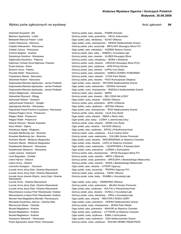 Klubowa Wystawa Ogarów i Gończych Polskich Białystok, 30.08.2008 Wykaz psów zgłoszonych na wystawę: Ilość zgłoszeń: Ardziński Krzysztof - Ełk Gończy polski, pies, otwarta - PAMIR Zimowle Bednarz Agnieszka - Lublin Bielawski Mariusz Paweł - Łódź Gończy polski, suka, pośrednia - HECA Jednorożec Ogar polski, pies, młodzieży - ECHO Olfactus Cieleń Katarzyna - Niemcza Ogar polski, suka, championów - REWIA Nadbużańskie Granie Cieplak Aleksandra - Warszawa Cieślak Juliusz - Warszawa Gończy polski, pies, szczeniąt - BRYLANT Kłusująca Sfora FCI Ogar polski, pies, młodzieży - ACERIS Absens Carens Czernik Bogdan - Kraków Gończy polski, pies, baby - RABAN z Huculskiej Łąki Danielczyk Karolina - Warszawa Dąbkowski Kazimierz - Piątnica Gończy polski, pies, otwarta - ULISES Kłusująca Sfora Gończy polski, suka, młodzieży - BORA z Ekolandu Dąbrowa Tomasz Ilona Dąbrowa- Piastów Gończy polski, suka, otwarta - UROCZA Kłusująca Sfora (FCI) Duda Andrzej - Kolno Ejsmont Jerzy - Płaska Gończy polski, pies, użytkowa - APIS Prima Goniec Gończy polski, pies, otwarta - ŁAPAJ Inny Świat Feculak Rafał - Rzeczenica Gończy polski, pies, młodzieży - NABÓJ GONIEC POMORSKI Frąckiewicz Marek - Barczewo Głowiński Hubert - Barczewo Gończy polski, suka, otwarta - CYGA Park Welski Gończy polski, pies, otwarta - FIGO Rumcajsowe Obejście Grąziowska-Maciela Agnieszka - Janów Podlaski Ogar polski, suka, otwarta - OKTAWA Nadbużańskie Granie Grąziowska-Maciela Agnieszka - Janów Podlaski Grąziowska-Maciela Agnieszka - Janów Podlaski Ogar polski, suka, weteranów - SÓWKA Goniwiatr Ogar polski, suka, championów - RADIOLA Nadbużańskie Granie Hodun Małgorzata - Warszawa Gończy polski, pies, otwarta - NERO Hołowiński Ryszard - Elbląg Idzikowski Robert - Gostynin Jędrychowski Wojciech - Świątki Gończy polski, pies, otwarta - BEJ CZAS NA ŁOWY Ogar polski, suka, otwarta - DASZA Olfactus Gończy polski, pies, pośrednia - BÓR z Elklandu Jędrzejczak Monika - Warszawa Kapuśniak Paweł Paulina Czyżewicz- Warszawa Kidawa-Pagacz Anna - Piaseczno Ogar polski, suka, użytkowa - JEŻYNA Olfactus Ogar polski, pies, championów - RÓG Nadbużańskie Granie Gończy polski, suka, otwarta - ŁAJA Inny Świat Kłagisz Rafał - Piaseczno Kłagisz Rafał - Piaseczno Ogar polski, suka, otwarta - REDA z Rodu Udry Ogar polski, pies, baby - LEŚNY z Jaśminowej Ulicy Kołucki Dariusz - Brześć Kujawski Gończy polski, suka, otwarta - NORA Inny Świat Koss Witold - Dębno Kowalczys Agata - Mrągowo Kowalski Bartłomiej Jan - Brwinów Ogar polski, pies, otwarta - AS-DUR Olfactus Ogar polski, pies, użytkowa - EPOS z Południowej Kniei Gończy polski, suka, użytkowa - AJLA Czarna Seria Kowalski Bartłomiej Jan - Brwinów Kuśnierz Marek - Medynia Głogowska Kuśnierz Marek - Medynia Głogowska Kwiatkowski Sławomir - Warszawa Kwiatkowski Sławomir - Warszawa Lasek Joanna - Katowice Lech Bogusław - Gródek Litwin Hanna - Otwock Łabno Anna - Gliwice Łaniucha Grzegorz - Szczecin Łuczak Anna Jerzy Dyło- Ożarów Mazowiecki Łuczak Anna Jerzy Dyło- Ożarów Mazowiecki Gończy polski, suka, weteranów - CHLUBA Goniec Pomorski Ogar polski, suka, otwarta - MACIERZANKA ze Stadniny Cisowiec Ogar polski, suka, otwarta - ŁAPA ze Stadniny Cisowiec Ogar polski, suka, weteranów - CZUPRYNKA z Fretowej Górki Ogar polski, suka, pośrednia - LUŚNIA z Gończaków Gończy polski, pies, championów - OPUS Kłusująca Sfora FCI Gończy polski, suka, otwarta - ARFA z Elklandu Gończy polski, suka, pośrednia - SROCZKA z Beskidzkiego Matecznika Gończy polski, suka, otwarta - ROSA z Beskidzkiego Matecznika Ogar polski, pies, otwarta - OTROP Ogarusy Ogar polski, suka, szczeniąt - TROPKA Ogarusy FCI Gończy polski, pies, użytkowa - CWAŁ Olfactus Łuczak Anna Jolanta Wójcik, Jerzy Dyło- Ożarów Mazowiecki Łuczak Anna - Ożarów Mazowiecki Łuczak Anna Jerzy Dyło- Ożarów Mazowiecki Łuczak Anna Jerzy Dyło- Ożarów Mazowiecki Mazurkiewicz Łukasz Piotr Wesołowski- Kraków Mazurkiewicz Łukasz Piotr Wesołowski- Kraków Mendel Ada Magdalena Mendel- Pierwoszyno Michejda-Grzylińska Joanna - Ożarów Maz. Młynarczyk Marek - Ostróda Musiał Magdalena - Kraków Musiał Magdalena - Kraków Musiał Magdalena - Kraków Osowiecki Sławomir - Warszawa Gończy polski, suka, baby - RUMBA z Huculskiej Łąki Ogar polski, suka, baby - HARMONIA Olfactus Gończy polski, suka, weteranów - BAJKA Goniec Pomorski Ogar polski, pies, użytkowa - HULTAJ z Południowej Kniei Gończy polski, pies, otwarta - DUNAJ z Huculskiej Łąki Gończy polski, suka, młodzieży - ERIA z Huculskiej Łąki Ogar polski, pies, otwarta - REKTOR Z RODU UDRY Ogar polski, suka, pośrednia - OPERA Nadbużańskie Granie Gończy polski, suka, championów - BONA Park Welski Ogar polski, pies, pośrednia - MAHOŃ ze Stadniny Cisowiec Ogar polski, pies, użytkowa - LITTWOR ze Stadniny Cisowiec Ogar polski, suka, użytkowa - ŻABA z Gończaków Ogar polski, suka, pośrednia - ODA Nadburzańskie Granie Pazio Agnieszka Jacek Pazio- Warszawa Gończy polski, suka, użytkowa - DOLINA HERBU WĘSZYNOS 94 Piechocki Paweł - Włocławek Ogar polski, pies, championów - AMON Olfactus Pierożyński Donat - Ryn Pierożyński Donat - Ryn Gończy polski, suka, pośrednia - CNOTA Olfactus Gończy polski, suka, otwarta - WRITTA Rumcajsowe Obejście Pluto-Prondziński Rafał - Poznań Gończy polski, pies, championów - BERDYSZ Herbu Węszynos Płucieniczak Bartosz - Rawicz Pniewska Maria - Łódź Gończy polski, suka, otwarta - PSOTA Wilczy Pazur Ogar polski, pies, otwarta - BOLS Z WSZYSTKICH SKOKÓW Poduch Marek - Białystok Gończy polski, suka, młodzieży - CZAJKA Prima Goniec Polak Elżbieta - Rzeszów Pośpiech Wojciech - Józefów Ogar polski, suka, otwarta - KORSA Ogar polski, suka, baby - HERA Olfactus Powałowski Janusz - Warszawa Gończy polski, pies, młodzieży - HULTAJ CNOTLIWY NOS Purcel Stanisław - Łomża Gończy polski, p