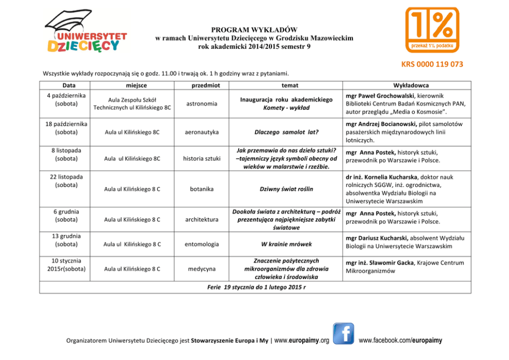 PROGRAM WYKŁADÓW w ramach Uniwersytetu Dziecięcego w Grodzisku Mazowieckim rok akademicki 2014/2015 semestr 9 KRS 0000 119 073 Wszystkie wykłady rozpoczynają się o godz. 11.00 i trwają ok. 1 h godziny wraz z pytaniami. Data 4 października (sobota) miejsce przedmiot temat Aula Zespołu Szkół Technicznych ul Kilińskiego 8C astronomia Inauguracja roku akademickiego Komety -‐ wykład mgr Paweł Grochowalski, kierownik Biblioteki Centrum Badań Kosmicznych PAN, autor przeglądu „Media o Kosmosie”. 18 października (sobota) Aula ul Kilińskiego 8C aeronautyka Dlaczego samolot lat? mgr Andrzej Bocianowski, pilot samolotów pasażerskich międzynarodowych linii lotniczych. 8 listopada (sobota) Aula ul Kilińskiego 8C historia sztuki Jak przemawia do nas dzieło sztuki? –tajemniczy język symboli obecny od wieków w malarstwie i rzeźbie. 22 listopada (sobota) Dziwny świat roślin mgr Anna Postek, historyk sztuki, przewodnik po Warszawie i Polsce. dr inż. Kornelia Kucharska, doktor nauk rolniczych SGGW, inż. ogrodnictwa, absolwentka Wydziału Biologii na Uniwersytecie Warszawskim Aula ul Kilińskiego 8 C botanika 6 grudnia (sobota) Aula ul Kilińskiego 8 C architektura 13 grudnia (sobota) Aula ul Kilińskiego 8 C entomologia W krainie mrówek mgr Dariusz Kucharski, absolwent Wydziału Biologii na Uniwersytecie Warszawskim medycyna Znaczenie pożytecznych mikroorganizmów dla zdrowia człowieka i środowiska mgr inż. Sławomir Gacka, Krajowe Centrum Mikroorganizmów Dookoła świata z architekturą – podróż mgr Anna Postek, historyk sztuki, prezentująca najpiękniejsze zabytki przewodnik po Warszawie i Polsce. światowe 10 stycznia 2015r(sobota) Wykładowca Aula ul Kilińskiego 8 C Ferie 19 stycznia do 1 lutego 2015 r Organizatorem Uniwersytetu Dziecięcego jest Stowarzyszenie Europa i My | www.europaimy.org www.facebook.com/europaimy PROGRAM WARSZTATÓW w ramach Uniwersytetu Dziecięcego Wszystkie zajęcia odbywają się soboty, rozpoczynają się o po wykładzie ok godz. 12:00 i trwają max. 1,30h Miejsce: Zespół Szkół Technicznych i Licealnych DATA 18.pażdziernika (sobota) 8. listopada (sobota) PRZEDMIOT Starożytność 13 grudnia (sobota) Zoologia „Co do nas mówią nasi czworonożni przyjaciele?” Tadeusz Bańkowski Starożytność „Dzień w starożytnym Rzymie” mgr Marek Jurzysta Kryptografia „Zagadki starożytnych szyfrów” Mateusz Kowalski „Biocen” Biologia „Magiczne enzymy. Eksperymenty z użyciem dwóch rodzajów enzymów. Zoologia „Zwierzęta polskich lasów cz. 1” Tadeusz Bańkowski „Dawne gry i zabawy” mgr Marek Jurzysta „Co kryje się za słowami” Mateusz Kowalski Językoznawstwo mgr Olga Barbasiewicz Biologia ”Dlaczego rośliny nie uczą jeść? Eksperyment z chlorofilem i skrobią ,informacje teoretyczne o fotosyntezie. Zoologia „Zwierzęta polskich lasów cz. 1” Tadeusz Bańkowski „Co w herbach piszczy?” – warsztaty heraldyczne mgr Marek Jurzysta Filozofia „Czy można zatrzymać czas?” Mateusz Kowalski Chemia „Czerwona kapusta nie tylko w kuchni. Warsztat o pomiarze odczynów różnych roztworów” „Biocen” „Biocen „ Obyczaje „Czy istnieje Święty Mikołaj?” Tadeusz Bańkowski Historia „Jak to z piratami bywało” mgr Marek Jurzysta Filozofia „Czy Kwiaty Pachną, gdy nikt ich nie wącha?” Mateusz Kowalski Eksperymenty Mateusz Kowalski „Zobacz DNA! Izolacja DNA z własnego policzka, informacje teoretyczne na temat DNA, wspólne składanie szablonu DNA z papieru” Obyczaje 10 stycznia (sobota) WYKŁADOWCA* mgr Marek Jurzysta Genetyka Heraldyka 6 grudnia (sobota) „Tajniki pisma starożytnych Sumerów” Językoznawco-‐paleografia „Tajemnicze alfabety” Pedagogika zabawy 22 listopada (sobota) TEMAT Filozofia, logika „Kuchenne eksperymenty! Eksperymentować można wszędzie, nawet w kuchni. „Biocen” „Sylwester, Nowy Rok, Karnawał i zwyczaje z tym związane” Tadeusz Bańkowski „Quiz na zakończenie spotkań” mgr Marek Jurzysta „Współczesny Sherlock Holmes-‐czyli jak myśli detektyw. Mateusz Kowalski Fizjologia „Tajemnice jedzenia .Jak czujemy smak ,ile jest smaków i czy każdy z nas je tak samo czuje” Botanika „Poznajemy drzewa rosnące w Polsce” „Biocen” Tadeusz Bańkowski