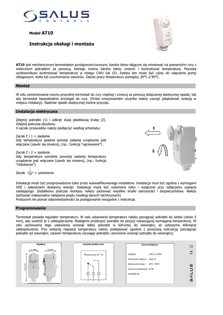 Model AT10 Instrukcja obsługi i montażu AT10 jest mechanicznym termostatem przylgowym/rurowym, bardzo łatwo dającym się montować na powierzchni rury z widocznym pokrętłem za pomocą, którego można bardzo łatwo zmienić i kontrolować temperaturę. Pozwala użytkownikowi kontrolować temperaturę w obiegu CWU lub CO. Zestaw ten może być użyty do włączenia pomp obiegowych, kotła lub uruchomienia zaworów. Zakres pracy temperatury pomiędzy 30°C a 90°C. Montaż W celu zamontowania mocno przyciśnij termostat do rury cieplnej i umocuj za pomocą dołączonej elastycznej opaski, tak aby termostat bezpośrednio przylegał do rury. (Przed umocowaniem czujnika należy usunąć jakąkolwiek izolację w miejscu instalacji). Nadmiar opaski elastycznej można przyciąć. Instalacja elektryczna Zdejmij pokrętło (1) i odkręć dużą plastikową śrubę (2). Zdejmij pokrywę obudowy. 4 zaciski przewodów należy podłączyć według schematu: 1 Zacisk C i 1 = zasilanie Gdy temperatura spadnie poniżej zadanej urządzenie jest włączane (zawór się otwiera), (np.: funkcja “ogrzewanie”) . Zacisk C i 2 = zasilanie Gdy temperatura wzrośnie powyżej zadanej temperatury urządzenie jest włączane (zawór się otwiera), (np.: funkcja “chłodzenie”) Zacisk 2 = uziemienie Instalacja może być przeprowadzona tylko przez wykwalifikowanego instalatora. Instalacja musi być zgodna z wymogami VDE i zaleceniami dostawcy energii. Instalacja może być wykonana tylko i wyłącznie przy odłączeniu zapięcia zasilającego. Dodatkowo podczas montażu należy zachować wszelkie środki ostrożności i bezpieczeństwa. Należy zachować maksymalne natężenia prądu (według danych technicznych) Producent nie ponosi odpowiedzialności za postępowanie niezgodne z instrukcja. Programowanie Termostat posiada regulator temperatury. W celu ustawienia temperatury należy pociągnąć pokrętło do siebie (około 5 mm), aby uwolnić je z zabezpieczenia. Następnie przekręcić pokrętło do pozycji wskazującej wymaganą temperaturę. W celu zachowania tego ustawienia wcisnąć lekko pokrętło w kierunku do wewnątrz, aż usłyszymy kliknięcie zabezpieczenia. Przy kolejnej regulacji temperatury należy postępować zgodnie z powyższą instrukcją (pociągnąć pokrętło od wewnątrz, ustawić temperaturę używając pokrętła i ponownie wcisnąć pokrętło do wewnątrz). GWARANCJA WARUNKI GWARANCJI 1. Producent udziela gwarancji na sprawne działanie produktu w okresie 24 miesięcy od daty zakupu, potwierdzonej pieczęcią, podpisem sprzedawcy oraz dowodem zakupu. 2. W okresie gwarancyjnym zapewnia się użytkownikowi bezpłatną wymianę urządzenia na nowe (ten sam typ/model) lub usunięcie uszkodzeo powstałych z powodu wad fabrycznych. 3. Gwarancja nie obejmuje uszkodzeo powstałych w wyniku: a) Uszkodzeo chemicznych, mechanicznych z winy użytkownika, b) Nieprawidłowego montażu, wykonanego niezgodnie z instrukcją montażu, c) Nie przestrzegania instrukcji obsługi oraz warunków bezpieczeostwa, d) Użytkowania urządzenia niezgodnie z przeznaczeniem. 4. Nabywca traci uprawnienia z tytułu gwarancji w przypadku: a) Uszkodzeo powstałych z winy użytkownika powodujących trwałe pogorszenie jakości urządzenia, b) Niewłaściwe użytkowanie – niezgodnie z instrukcją obsługi i montażu, c) Ingerencji serwisowej osób nieupoważnionych. 5. Wszelkie roszczenia wobec sprzedawcy dotyczące rękojmi I gwarancji regulują przepisy Kodeksu Cywilnego. Zapoznałem (am) się i akceptuję warunki Data sprzedaży: ……………………………………………………………… Pieczątka i podpis sprzedawcy: …………………………………………………………….. Importer: SALUS Controls Plc Salus House Dodworth Business Park Whinby Road Barnsley S75 3SP United Kingdom Dystrybutor firmy Salus: QL CONTROLS, Sp. z o.o. , Sp.k. ul. Rolna 4 43-262 Kobielice tel.: 32 700 74 53 fax: 32 790 44 85 www.salus-controls.pl [email protected] Salus Controls Plc.