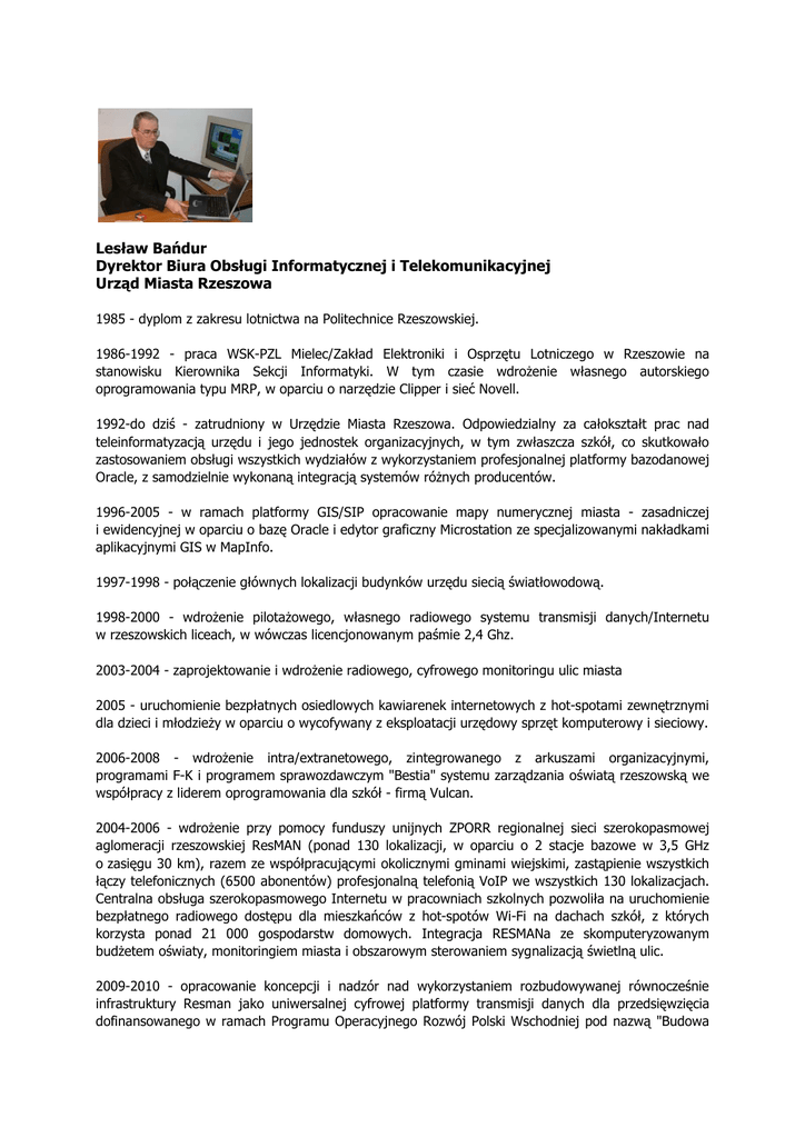 Lesław Bańdur Dyrektor Biura Obsługi Informatycznej i Telekomunikacyjnej Urząd Miasta Rzeszowa 1985 - dyplom z zakresu lotnictwa na Politechnice Rzeszowskiej. 1986-1992 - praca WSK-PZL Mielec/Zakład Elektroniki i Osprzętu Lotniczego w Rzeszowie na stanowisku Kierownika Sekcji Informatyki. W tym czasie wdrożenie własnego autorskiego oprogramowania typu MRP, w oparciu o narzędzie Clipper i sieć Novell. 1992-do dziś - zatrudniony w Urzędzie Miasta Rzeszowa. Odpowiedzialny za całokształt prac nad teleinformatyzacją urzędu i jego jednostek organizacyjnych, w tym zwłaszcza szkół, co skutkowało zastosowaniem obsługi wszystkich wydziałów z wykorzystaniem profesjonalnej platformy bazodanowej Oracle, z samodzielnie wykonaną integracją systemów różnych producentów. 1996-2005 - w ramach platformy GIS/SIP opracowanie mapy numerycznej miasta - zasadniczej i ewidencyjnej w oparciu o bazę Oracle i edytor graficzny Microstation ze specjalizowanymi nakładkami aplikacyjnymi GIS w MapInfo. 1997-1998 - połączenie głównych lokalizacji budynków urzędu siecią światłowodową. 1998-2000 - wdrożenie pilotażowego, własnego radiowego systemu transmisji danych/Internetu w rzeszowskich liceach, w wówczas licencjonowanym paśmie 2,4 Ghz. 2003-2004 - zaprojektowanie i wdrożenie radiowego, cyfrowego monitoringu ulic miasta 2005 - uruchomienie bezpłatnych osiedlowych kawiarenek internetowych z hot-spotami zewnętrznymi dla dzieci i młodzieży w oparciu o wycofywany z eksploatacji urzędowy sprzęt komputerowy i sieciowy. 2006-2008 - wdrożenie intra/extranetowego, zintegrowanego z arkuszami organizacyjnymi, programami F-K i programem sprawozdawczym "Bestia" systemu zarządzania oświatą rzeszowską we współpracy z liderem oprogramowania dla szkół - firmą Vulcan. 2004-2006 - wdrożenie przy pomocy funduszy unijnych ZPORR regionalnej sieci szerokopasmowej aglomeracji rzeszowskiej ResMAN (ponad 130 lokalizacji, w oparciu o 2 stacje bazowe w 3,5 GHz o zasięgu 30 km), razem ze współpracującymi okolicznymi gminami wiejskimi, zastąpienie wszystkich łączy telefonicznych (6500 abonentów) profesjonalną telefonią VoIP we wszystkich 130 lokalizacjach. Centralna obsługa szerokopasmowego Internetu w pracowniach szkolnych pozwoliła na uruchomienie bezpłatnego radiowego dostępu dla mieszkańców z hot-spotów Wi-Fi na dachach szkół, z których korzysta ponad 21 000 gospodarstw domowych. Integracja RESMANa ze skomputeryzowanym budżetem oświaty, monitoringiem miasta i obszarowym sterowaniem sygnalizacją świetlną ulic. 2009-2010 - opracowanie koncepcji i nadzór nad wykorzystaniem rozbudowywanej równocześnie infrastruktury Resman jako uniwersalnej cyfrowej platformy transmisji danych dla przedsięwzięcia dofinansowanego w ramach Programu Operacyjnego Rozwój Polski Wschodniej pod nazwą "Budowa zintegrowanego systemu zarządzania transportem publicznym Rzeszowa i Okolic”. W ramach tego przedsięwzięcia Resman obok obszarowego sterowania sygnalizacją świetlną jest wykorzystywany do obsługi systemu informacji pasażerskiej na przystankach, elektronicznego biletu, sterowanie znakami zmiennej treści, automatami do doładowywania biletów, informacją pogodową. Bezprzewodowy Resman umożliwia dostęp do autobusów komunikacji miejskiej w ruchu, zbieranie danych o pracy instalacji wewnątrz autobusów (pracą autokomputera), monitorowanie ich napełnienia pasażerami, przekazywaniem informacji z autobusów do systemu sygnalizacji świetlnej dla upłynnienia przejazdów komunikacji publicznej na skrzyżowaniach (zielona fala). 2010 - na bazie sieci Resman wdrażanie elektronicznych obiegów dokumentów we wszystkich jednostkach organizacyjnych miasta, połączonych z e-usługami dla mieszkańców, ze szczególnym uwzględnieniem szkół - w tym system elektronicznego naboru i śledzenia obowiązku edukacyjnego, połączony z powstającym portalem edukacyjnym. 2010 - współpraca przy założeniu i aktywny udział w pracach stowarzyszenia samorządów podkarpackich pod nazwą "Podkarpacka sieć szerokopasmowa" - koordynacja i nadzór nad pracami przy studium wykonalności sieci WiMAX dla całego Podkarpacia i nieudolne próby zdobycia dofinansowania unijnego dla realizacji praktycznej projektu.