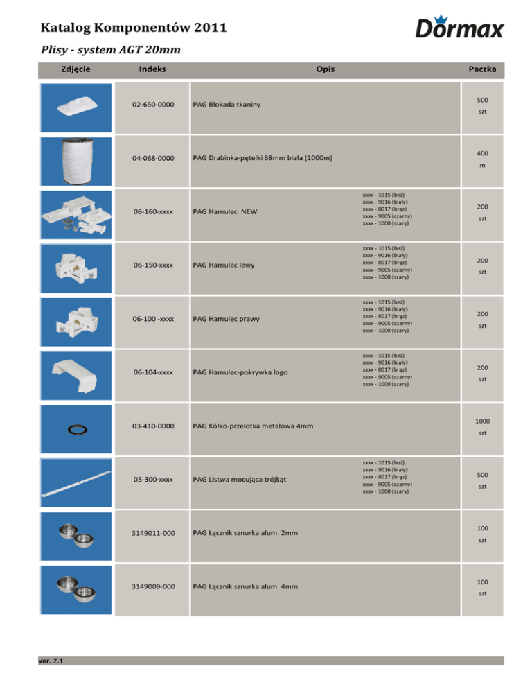 Katalog Komponentów 2011 Plisy - system AGT 20mm Zdjęcie Indeks 02-650-0000 Opis Paczka 500 PAG Blokada tkaniny szt 04-068-0000 400 PAG Drabinka-pętelki 68mm biała (1000m) m 06-160-xxxx 06-150-xxxx 06-100 -xxxx 06-104-xxxx 03-410-0000 PAG Hamulec NEW PAG Hamulec lewy PAG Hamulec prawy PAG Hamulec-pokrywka logo xxxx - 1015 (beż) xxxx - 9016 (biały) xxxx - 8017 (brąz) xxxx - 9005 (czarny) xxxx - 1000 (szary) 200 xxxx - 1015 (beż) xxxx - 9016 (biały) xxxx - 8017 (brąz) xxxx - 9005 (czarny) xxxx - 1000 (szary) 200 xxxx - 1015 (beż) xxxx - 9016 (biały) xxxx - 8017 (brąz) xxxx - 9005 (czarny) xxxx - 1000 (szary) 200 xxxx - 1015 (beż) xxxx - 9016 (biały) xxxx - 8017 (brąz) xxxx - 9005 (czarny) xxxx - 1000 (szary) 200 szt szt szt szt 1000 PAG Kółko-przelotka metalowa 4mm szt 03-300-xxxx 3149011-000 PAG Listwa mocująca trójkąt PAG Łącznik sznurka alum. 2mm xxxx - 1015 (beż) xxxx - 9016 (biały) xxxx - 8017 (brąz) xxxx - 9005 (czarny) xxxx - 1000 (szary) 500 szt 100 szt 3149009-000 PAG Łącznik sznurka alum. 4mm 100 szt ver. 7.1 Katalog Komponentów 2011 Plisy - system AGT 20mm Zdjęcie Indeks 02-160-xxxx 01-900-xxxx 01-901-0000 Opis PAG Mocowanie sznurka PAG Mocowanie wachlarza Paczka xxxx - 1015 (beż) xxxx - 9016 (biały) xxxx - 8017 (brąz) xxxx - 9005 (czarny) xxxx - 1000 (szary) 500 xxxx - 1015 (beż) xxxx - 9016 (biały) xxxx - 8017 (brąz) xxxx - 9005 (czarny) xxxx - 1000 (szary) 10 szt szt 10 PAG Mocowanie wachlarza-płytka mocująca szt 02-300-0000 10 PAG Napinacz sznurka szt 02-301-0000 10 PAG Napinacz sznurka M3 szt 02-215-0000 100 PAG Napinacz sznurka z tworzywa szt 02-380-0000 250 PAG Napinacz żyłki szt P5420 1000 PAG Nit-oczko do tkaniny szt P5250 1000 PAG Nit-oczko do zatyczek szt 02-400-xxxx ver. 7.1 PAG Pokrywa szyny (4,5m) xxxx - 1015 (beż) xxxx - 9016 (biały) xxxx - 8017 (brąz) xxxx - 9005 (czarny) xxxx - 1000 (szary) 1134 m Katalog Komponentów 2011 Plisy - system AGT 20mm Zdjęcie Indeks 02-450-xxxx 02-100-xxxx 02-460-xxxx 02-425-xxxx 02-383-0000 Opis PAG Pokrywa szyny BO (4,5m) PAG Pokrywa szyny BO wewn. (4,5m) PAG Pokrywa szyny wsuwana (50mb) PAG Profil łączący PVC (4,5m) Paczka xxxx - 1015 (beż) xxxx - 9016 (biały) xxxx - 8017 (brąz) xxxx - 9005 (czarny) xxxx - 1000 (szary) 1134 xxxx - 1015 (beż) xxxx - 9016 (biały) xxxx - 8017 (brąz) xxxx - 9005 (czarny) xxxx - 1000 (szary) 1134 xxxx - 1015 (beż) xxxx - 9016 (biały) xxxx - 8017 (brąz) xxxx - 9005 (czarny) xxxx - 1000 (szary) 50 xxxx - 1015 (beż) xxxx - 9016 (biały) xxxx - 8017 (brąz) xxxx - 9005 (czarny) xxxx - 1000 (szary) 45 m m m m 1000 PAG Prowadzenie sznurka szt 02-350-0000 1000 PAG Przelotka sznurka szt 02-360-xxxx 06-410-0000 PAG Przelotka żyłki PAG Rączka - końcówka xxxx - 1015 (beż) xxxx - 9016 (biały) xxxx - 8017 (brąz) xxxx - 9005 (czarny) xxxx - 1000 (szary) 1000 szt 50 szt 06-410-0000-A PAG Rączka - końcówka A 100 szt 06-400-9016 PAG Rączka - rurka 15x2mm biała (4m) 40 m ver. 7.1 Katalog Komponentów 2011 Plisy - system AGT 20mm Zdjęcie Indeks 06-400-1000 Opis PAG Rączka - rurka 15x2mm szara (4m) Paczka 40 m 6000015-B PAG Rączka - zaślepka rurki biała 100 szt 6000015-CZ PAG Rączka - zaślepka rurki czarna 100 szt 6000015-P PAG Rączka - zaślepka rurki szara 100 szt 93001295 PAG Rączka regulowana - końcówka 50 szt 06-401-9016 PAG Rączka regulowana - rurka 19mm biała 96 m 06-401-9006 PAG Rączka regulowana - rurka 19mm silve 96 m 98989845 PAG Rączka regulowana - śrubka M5x8 50 szt 93001343 PAG Rączka regulowana - zatyczka rurki 200 szt 03-040-0000* PAG Sprężyna sznurka standard (4,7cm) 100 szt ver. 7.1 Katalog Komponentów 2011 Plisy - system AGT 20mm Zdjęcie Indeks 03-030-0000 Opis Paczka 50 PAG Sprężyna trójkąt długa (11,8cm) szt 03-020-0000 50 PAG Sprężyna żyłki (4,3mm) szt patrz przewodnik kolorów ZH008000xxx 1000 PAG Sznurek 0,8mm (1000m) m 01-300-xxxx 01-100-xxxx 01-200-xxxx 01-700-xxxx 02-500-0000 PAG Szyna elektryczna 27mm (4,5m) PAG Szyna główna (4,5m) PAG Szyna płaska (4,5m) PAG Szyna wzmocniona (4,5m) PAG Taśma mocująca z klejem (50m) xxxx - 1015 (beż) xxxx - 9016 (biały) xxxx - 8017 (brąz) xxxx - 9005 (czarny) xxxx - 1000 (szary) 54 xxxx - 1015 (beż) xxxx - 9016 (biały) xxxx - 8017 (brąz) xxxx - 9005 (czarny) xxxx - 1000 (szary) 270 xxxx - 1015 (beż) xxxx - 9016 (biały) xxxx - 8017 (brąz) xxxx - 9005 (czarny) xxxx - 1000 (szary) 270 xxxx - 1015 (beż) xxxx - 9016 (biały) xxxx - 8017 (brąz) xxxx - 9005 (czarny) xxxx - 1000 (szary) 162 m m m m 700 m 01-130-0000 PAG Tulejka zaciskowa 3mm 500 szt 01-135-0000 PAG Tulejka zaciskowa 4mm 500 szt ver. 7.1 Katalog Komponentów 2011 Plisy - system AGT 20mm Zdjęcie Indeks 06-300-0000 Opis PAG Uchwyt bezbarwny Paczka 500 szt 06-300-0000-A PAG Uchwyt bezbarwny A 500 szt 3145127-001 PAG Wieszak bez wiercenia biały 100 szt 3145127-060 PAG Wieszak bez wiercenia brązowy 100 szt 3145127-049 PAG Wieszak bez wiercenia czarny 100 szt 3145127-010 PAG Wieszak bez wiercenia szary 100 szt 3141050-001 PAG Wieszak bez wiercenia-nakrętka biała 100 szt 3141050-060 PAG Wieszak bez wiercenia-nakrętka brąz 100 szt 3100157-000 PAG Wieszak bez wiercenia-nakrętka M3 100 szt 3100148-000 PAG Wieszak bez wiercenia-nakrętka M4 100 szt ver. 7.1 Katalog Komponentów 2011 Plisy - system AGT 20mm Zdjęcie Indeks 03-400-xxxx 03-040-xxxx 03-041-xxxx 03-220-xxxx 03-120-xxxx 03-122-xxxx 02-300-xxxx 02-210-xxxx 02-200-xxxx 02-303-9016 Opis PAG Wieszak kątowy PAG Wieszak klip PAG Wieszak klip 27mm PAG Wspornik 15x60mm PAG Wspornik 20x40mm PAG Wspornik 30mm kolor PAG Zatyczka szyny elektrycznej PAG Zatyczka szyny głównej PAG Zatyczka szyny płaskiej PAG Zatyczka szyny wzmocnionej biała Paczka xxxx - 1015 (beż) xxxx - 9016 (biały) xxxx - 8017 (brąz) xxxx - 9005 (czarny) xxxx - 1000 (szary) 100 xxxx - 1015 (beż) xxxx - 9016 (biały) xxxx - 8017 (brąz) xxxx - 9005 (czarny) xxxx - 1000 (szary) 1000 xxxx - 1015 (beż) xxxx - 9016 (biały) xxxx - 8017 (brąz) xxxx - 9005 (czarny) xxxx -