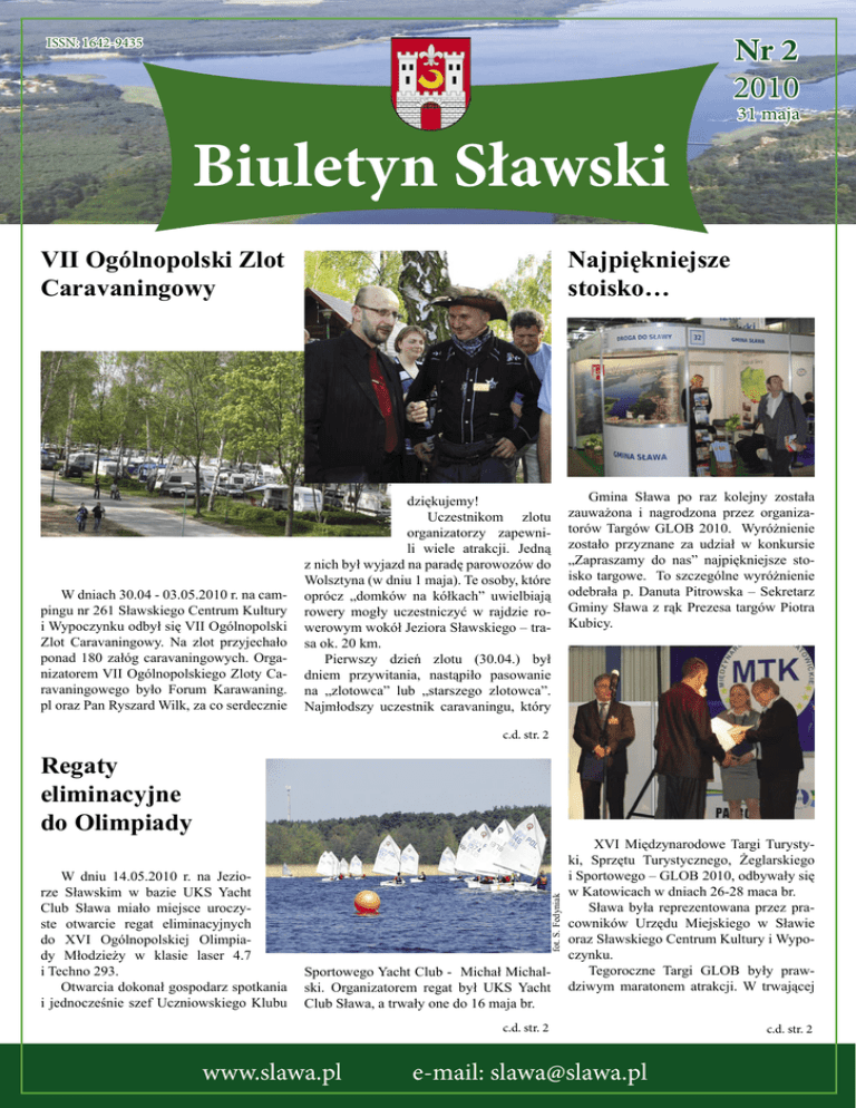 Nr 2 2010 ISSN: 1642-9435 31 maja Biuletyn Sławski VII Ogólnopolski Zlot Caravaningowy W dniach 30.04 - 03.05.2010 r. na campingu nr 261 Sławskiego Centrum Kultury i Wypoczynku odbył się VII Ogólnopolski Zlot Caravaningowy. Na zlot przyjechało ponad 180 załóg caravaningowych. Organizatorem VII Ogólnopolskiego Zloty Caravaningowego było Forum Karawaning. pl oraz Pan Ryszard Wilk, za co serdecznie Najpiękniejsze stoisko… dziękujemy! Uczestnikom zlotu organizatorzy zapewnili wiele atrakcji. Jedną z nich był wyjazd na paradę parowozów do Wolsztyna (w dniu 1 maja). Te osoby, które oprócz „domków na kółkach” uwielbiają rowery mogły uczestniczyć w rajdzie rowerowym wokół Jeziora Sławskiego – trasa ok. 20 km. Pierwszy dzień zlotu (30.04.) był dniem przywitania, nastąpiło pasowanie na „zlotowca” lub „starszego zlotowca”. Najmłodszy uczestnik caravaningu, który Gmina Sława po raz kolejny została zauważona i nagrodzona przez organizatorów Targów GLOB 2010. Wyróżnienie zostało przyznane za udział w konkursie „Zapraszamy do nas” najpiękniejsze stoisko targowe. To szczególne wyróżnienie odebrała p. Danuta Pitrowska – Sekretarz Gminy Sława z rąk Prezesa targów Piotra Kubicy. c.d. str. 2 W dniu 14.05.2010 r. na Jeziorze Sławskim w bazie UKS Yacht Club Sława miało miejsce uroczyste otwarcie regat eliminacyjnych do XVI Ogólnopolskiej Olimpiady Młodzieży w klasie laser 4.7 i Techno 293. Otwarcia dokonał gospodarz spotkania i jednocześnie szef Uczniowskiego Klubu fot. S. Fedyniak Regaty eliminacyjne do Olimpiady Sportowego Yacht Club - Michał Michalski. Organizatorem regat był UKS Yacht Club Sława, a trwały one do 16 maja br. XVI Międzynarodowe Targi Turystyki, Sprzętu Turystycznego, Żeglarskiego i Sportowego – GLOB 2010, odbywały się w Katowicach w dniach 26-28 maca br. Sława była reprezentowana przez pracowników Urzędu Miejskiego w Sławie oraz Sławskiego Centrum Kultury i Wypoczynku. Tegoroczne Targi GLOB były prawdziwym maratonem atrakcji. W trwającej c.d. str. 2 www.slawa.pl e-mail: [email protected] c.d. str. 2 2 Biuletyn Sławski Nr 2/2010 VII Ogólnopolski Zlot Caravaningowy Regaty eliminacyjne do Olimpiady brał udział w pasowaniu miał trzy miesiące. Dnia 1 maja 2010 r. o godzinie 19:00 rozpoczęła się wspólna kolacja przy ognisku i muzyce biesiadnej. Wszystkich uczestników caravaningu przywitał Burmistrz Sławy – Cezary Sadrakuła, organizator zlotu Pan Ryszard Wilk oraz Dyrektor Sławskiego Centrum Kultury i Wypoczynku – Piotr Kokorniak. Miasto Sława jest bardzo wdzięczne organizatorom zlotu, za to że tak liczna grupa miłośników caravaningu przyjechała do Sławy. Poznała nasze miasto i mamy nadzieję, że jeszcze nie raz nas odwiedzi. Dzień 2 maja 2010 r. był dniem na sportowo. Uczestnicy caravaningu zamienili swoje campingi i campery na rowery i ruszyli na wycieczkę wokół Jeziora Sławskiego. Tego dnia chętni mogli popływać statkiem wycieczkowym „Lubuszanin II” po jeziorze. 3 maja 2010 r. na pożegnanie ściągnięto flagę państwową oraz flagę Karawaning.pl Czterodniowy zlot minął w ciepłej, rodzinnej atmosferze. Podczas weekendu majowego na terenie Sławskiego Centrum Kultury i Wypoczynku gościło 576 wczasowiczów. Wszystkim bardzo serdecznie dziękujemy za przybycie i zainteresowanie zlotem. Organizatorom dziękujemy za zaangażowanie i organizację. Szczególne podziękowania organizatorom zlotu uczestnicy umieścili na stronie karawaning.pl Dzień Zwycięstwa w Sławie Szkoły Podstawowej, Gimnazjum i Zespołu Szkół Ponadgimnazjalnych ze Sławy. Po mszy, przedstawiciele władz samorządowych oraz sławska społeczność udała się na Plac Pamięci Narodowej. Oprawę muzyczną oraz nagłośnienie zapewniło Sławskie Centrum Kultury i Wypoczynku. Podczas uroczystości patriotycznej Burmistrz Sławy wygłosił okolicznościowe przemówienie. Pod pomnikiem wiązanki złożyli: Bur- 9 maja br. w 65. rocznicę zakończenia II wojny światowej, w Sławie uroczyście obchodzono Dzień Zwycięstwa. Uroczystości rozpoczęły się mszą św. o godz. 10-ej w kościele p.w. Miłosierdzia Bożego. Oprawę muzyczną uświetnił sławski chór Cantate Deo, który wykonał: Rotę, Gaude Mater Polonia, Bogarodzicę, Ave Maryja, a na koniec Boże coś Polskę. W homilii, podczas mszy sprawowanej w intencji ojczyzny, proboszcz podkreślił ważność święta oraz nawiązywał do naszej, jakże trudnej i ciężkiej historii. Podczas uroczystości nie zabrakło pocztów sztandarowych reprezentowanych przez delegacje: Związku Kombatantów, Ochotniczej Straży Pożarnej ze Sławy, BURMISTRZ SŁAWY przyjmuje: w poniedziałki w godz. 12.00 -14.00 Katarzyna Faliszewska SCKiW mistrz Sławy – Cezary Sadrakuła, Przewodniczący Rady Miejskiej – Aleksander Polański, Mieczysław Boks – Przewodniczący Komisji Inicjatyw Gospodarczych i Promocji Gminy, Związek Sybiraków, Związek Kombatantów, przedstawiciele Starostwa Powiatowego oraz delegacje poszczególnych szkół. PRZEWODNICZĄCY RADY MIEJSKIEJ przyjmuje: w poniedziałki w godz. 8.00- 14.00 MMN Już w lipcu br. rusza XVI Ogólnopolska Olimpiada Młodzieży w Sportach Letnich – LUBUSKIE 2010 - największa młodzieżowa impreza sportowa w kraju. W tym roku o medale sportowcy będą rywalizować w województwie lubuskim. Zakończenie Olimpiady odbędzie się w Sławie w sierpniu br. MMN Najpiękniejsze stoisko… przez trzy dni imprezie wzięło udział blisko 300 wystawców! Między innymi biura podróży, regiony turystyczne, touroperatorzy, ośrodki odnowy i rekreacji. Warto dodać, że turysta „śląski” jest dobrym klientem…, który wymaga, ale też docenia walory turystyczne danego regionu. Stoisko sławskie przez cały okres trwania targów cieszyło się ogromnym zainteresowaniem. „To przede wszystkim ważne spotkanie z potencjalnym klientem czyli w naszym przypadku turystą. Śląsk to region o olbrz