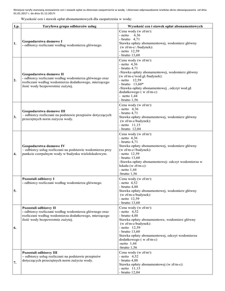 Niniejsze taryfy stanowią zestawienie cen i stawek opłat za zbiorowe zaopatrzenie w wodę i zbiorowe odprowadzanie ścieków okres obowiązywania od dnia 01.01.2017 r. do dnia 31.12.2017r Wysokość cen i stawek opłat abonamentowych dla zaopatrzenia w wodę: Lp. Taryfowa grupa odbiorców usług 1. Gospodarstwa domowe I - odbiorcy rozliczani według wodomierza głównego. 2. Gospodarstwa domowe II - odbiorcy rozliczani według wodomierza głównego oraz rozliczani według wodomierza dodatkowego, mierzącego ilość wody bezpowrotnie zużytej. 3. 4. Gospodarstwa domowe III – odbiorcy rozliczani na podstawie przepisów dotyczących przeciętnych norm zużycia wody. Gospodarstwa domowe IV – odbiorcy usług rozliczani na podstawie wodomierza przy punkcie czerpalnym wody w budynku wielolokalowym. Pozostali odbiorcy I - odbiorcy rozliczani według wodomierza głównego. 5. Pozostali odbiorcy II - odbiorcy rozliczani według wodomierza głównego oraz rozliczani według wodomierza dodatkowego, mierzącego ilość wody bezpowrotnie zużytej. 6. 7. Pozostali odbiorcy III – odbiorcy usług rozliczani na podstawie przepisów dotyczących przeciętnych norm zużycia wody. Wysokość cen i stawek opłat abonamentowych Cena wody (w zł/mᶟ): - netto 4,36 - brutto 4,71 Stawka opłaty abonamentowej, wodomierz główny (w zł/m-c/./budynek): - netto 12,59 - brutto 13,60 Cena wody (w zł/mᶟ): - netto 4,36 - brutto 4,71 -Stawka opłaty abonamentowej, wodomierz główny (w zł/m-c/wod.gł./budynek): - netto 12,59 - brutto 13,60* -Stawka opłaty abonamentowej , odczyt wod.gł. dodatkowego ( w zl/m-c) - netto 1,44 - brutto 1,56 Cena wody (w zł/mᶟ): - netto 4,36 - brutto 4,71 Stawka opłaty abonamentowej, wodomierz główny (w zł/m-c/budynek): - netto 11,15 - brutto 12,04 Cena wody (w zł/mᶟ): - netto 4,36 - brutto 4,71 Stawka opłaty abonamentowej, wodomierz główny (w zł/m-c//budynek): - netto 12,59 - brutto 13,60 -Stawka opłaty abonamentowej- odczyt wodomierza w lokalu (w zł/m-c): - netto 1,44 -brutto 1,56 Cena wody (w zł/mᶟ): - netto 4,52 - brutto 4,88 Stawka opłaty abonamentowej, wodomierz główny (w zł/m-c/budynek): - netto 12,59 - brutto 13,60 Cena wody (w zł/mᶟ): - netto 4,52 - brutto 4,88 Stawka opłaty abonamentowe, wodomierz główny (w zł/m-c/budynek): - netto 12,59 - brutto 13,60 Stawka opłaty abonamentowej, odczyt wodomierza dodatkowego ( w zł/m-c) -netto 1,44 -brutto 1,56 Cena wody (w zł/mᶟ): - netto 4,52 - brutto 4,88 Stawka opłaty abonamentowej (w zł/m-c): - netto 11,15 - brutto 12,04 Niniejsze taryfy stanowią zestawienie cen i stawek opłat za zbiorowe zaopatrzenie w wodę i zbiorowe odprowadzanie ścieków okres obowiązywania od dnia 01.01.2017 r. do dnia 31.12.2017r Wysokość cen i stawek opłat abonamentowych dla odprowadzania ścieków: L.p. 1. 2. Taryfowa grupa odbiorców usług Wysokość cen i stawek opłat abonamentowych Cena usługi odprowadzania ścieków (w zł/mᶟ): - netto 4,86 - brutto 5,25 Gospodarstwa domowe I – odbiorcy rozliczani według wodomierza głównego lub Stawka opłaty abonamentowej, wodomierz główny urządzenia pomiarowego. (w zł/m-c/budynek): - netto 7,51 - brutto 8,11 Cena usługi odprowadzania ścieków (w zł/mᶟ): - netto 4,86 Gospodarstwa domowe II - brutto 5,25 - odbiorcy rozliczani według wodomierza głównego lub Stawka opłaty abonamentowej, wodomierz główny urządzenia pomiarowego oraz rozliczani według wodomierza (w zł/m-c/budynek): dodatkowego, mierzącego ilość wody bezpowrotnie zużytej. - netto 7,51 - brutto 8,11 3. Gospodarstwa domowe III – odbiorcy rozliczani na podstawie przepisów dotyczących przeciętnych norm zużycia wody¹).* 4. Gospodarstwa domowe IV – odbiorcy usług rozliczani na podstawie wodomierza przy punkcie czerpalnym wody w budynku wielolokalowym. Cena usługi odprowadzania ścieków (w zł/mᶟ): - netto 4,86 - brutto 5,25 Stawka opłaty abonamentowej, wodomierz główny (w zł/m-c/budynek): - netto 6,07 - brutto 6,56 Cena usługi odprowadzania ścieków (w zł/mᶟ): - netto 4,86 - brutto 5,25 Stawka opłaty abonamentowej, wodomierz główny (w zł/m-c/budynek): - netto 7,51 - brutto 8,11 Stawka opłaty abonamentowej, odczyt wodomierza gł. lub urz. pom.w lokalu (w zł/m-c) -netto 1,44 -brutto 1,56 Cena usługi odprowadzania ścieków (w zł/mᶟ): - netto 6,02 - brutto 6,50 Stawka opłaty abonamentowej, wodomierz główny (w zł/m-c/ budynek): - netto 7,51 - brutto 8,11 5. Pozostali odbiorcy I - odbiorcy rozliczani według wodomierza głównego lub urządzenia pomiarowego. 6. Cena usługi odprowadzania ścieków (w zł/mᶟ): - netto 6,02 Pozostali odbiorcy II - brutto 6,50 - odbiorcy rozliczani według wodomierza głównego lub Stawka opłaty abonamentowej, wodomierz główny urządzenia pomiarowego oraz rozliczani według wodomierza (w zł/m-c/budynek): dodatkowego, mierzącego ilość wody bezpowrotnie zużytej. - netto 7,51 - brutto 8,11 7. Cena usługi odprowadzania ścieków (w zł/mᶟ): - netto 6,02 - brutto 6,50 Stawka opłaty abonamentowej, wodomierz główny (w zł/m-c/odbiorca): - netto 6,07 - brutto 6,56 Pozostali odbiorcy III – odbiorcy usług rozliczani na podstawie przepisów dotyczących przeciętnych norm zużycia wody. ¹*) nazwę dla grupy Gospodarstwa domowe III zastosowano adekwatnie do nazwy grupy stosowanej dla zbiorowego zaopatrzenia w wodę , ze względu na sposób rozliczeń zużycia wody. Do stawek opłaty wymienionych w w/w tabelach dolicza się obowiązujący w dniu sprzedaży podatek VAT, zgodnie z odrębnymi przepisami (stawka podatku VAT do dnia 31 grudnia 2016 r. wynosi 8 %).
