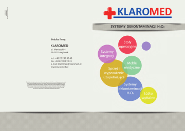 PL/04.2013 © KLAROMED Wszelkie prawa zastrzeżone. SYSTEMY DEKONTAMINACJI H2O2 Siedziba firmy: KLAROMED ul. Moniuszki 4 05-070 Sulejówek tel.: +48 22 299 30 40 fax: +48 22 783 19 31 e-mail: [email protected] www.klaromed.pl Wszystkie informacje zawarte w tym dokumencie mogą ulec zmianie bez wcześniejszego powiadomienia. Żadna część niniejszego opracowania nie może być kopiowana lub przesyłana w jakiejkolwiek formie i w jakikolwiek sposób bez pisemnej zgody. Wszystkie marki, nazwy i nazwy produktów w niniejszym dokumencie są znakami towarowymi lub zastrzeżonymi znakami towarowymi. Informacje handlowe zamieszczone w dokumencie nie stanowią oferty handlowej w rozumieniu Kodeksu Cywilnego (art. 66 KC, art. 543 KC), lecz są zaproszeniem do składania ofert kupna. Stoły operacyjne Systemy integracji Meble medyczne Sprzęt i wyposażenie uzupełniające Systemy dekontaminacji H2O2 Łóżka szpitalne DEKONTAMINACJA STREF I POWIERZCHNI P GAZOWEJ FORMY NADTLENKU WODORU I PRZY UŻYCIU Problem zakażeń szpitalnych .................................................... 4 Opis technologii HPV ................................................................ 6 Bioquell Z-2 ............................................................................ 10 Bioquell Q-10 .......................................................................... 14 Bioquell Clarus C .................................................................... 16 Bioquell L3 .............................................................................. 18 Bioquell WIC-1 ........................................................................ 20 Bioguell C2C-1 ........................................................................ 22 PROBLEM ZAKAŻEń SZPITALNYCH Zakażenia szpitalne wywoływane przez drobnoustroje bytujące w placówkach służby zdrowia, stanowią jeden z najpoważniejszych problemów, przed którymi stają obecnie pracownicy szpitali. Wiele gatunków bakterii posiada zdolność przetrwania w środowisku szpitalnym przez długi okres czasu zarówno w formie wegetatywnej oraz w postaci przetrwalników. Acinetobacter baumannii Clostridium difficile Staphylococcus aureus MRSA Enterococcus VRE Serra"a marcescens Zakażenia szpitalne Inne bakterie i grzyby Problem ten dotyczy zarówno Bloków Operacyjnych, Oddziałów Intensywnej Opieki Medycznej jak i sal, na których przebywają pacjenci z obniżoną odpornością immunologiczną oraz izolatek i sal łóżkowych. Istnieje wiele procedur, które mają za zadanie dezaktywację patogenów zasiedlających wszelkiego rodzaju powierzchnie w pomieszczeniach szpitalnych, gdyż transmisja drobnoustrojów ze środowiska stanowi jedną z głównych przyczyn zakażeń. Jak wykazują badania, wszystkie miejsca mające kontakt z rękoma pacjentów oraz personelu medycznego skażone są groźnymi dla zdrowia szczepami bakterii i grzybów. Konwencjonalne metody, takie jak dezynfekcja powierzchni przez zmywanie i przecieranie przy użyciu preparatów alkoholowych, związków chloru, amin, czwartorzędowych związków amoniowych, aldehydów, a także fumigacja formaldehydem czy stosowanie lamp emitujących promieniowanie UV coraz częściej okazują się niewystarczające. Obecny postęp w technologii pozwala na osiąganie coraz wyższego poziomu dezaktywacji drobnoustrojów. Sanityzacja do 2 log Dezynfekcja do 5 log Sterylizacja Dekontaminacja do 6 log Technologia, w której jako czynnika biobójczego używa się gazowej formy nadtlenku wodoru pozwala na redukcję patogenów o 6 log, czyli uzyskiwanie skuteczności na poziomie procesu sterylizacji przeprowadzanego w tradycyjnych autoklawach. 4 Zakażenia szpitalne stanowią poważny problem dla placówek służby zdrowia. Chorobotwórcze patogeny bytujące w środowisku szpitalnym prowadzą do coraz częstszego pojawiania się powikłań wydłużających pobyt pacjentów w szpitalu, a w najgorszych wypadkach mogą powodować przedwczesne zgony. Mimo wprowadzania coraz doskonalszych procedur związanych z reżimem dezynfekcji dłoni przez personel medyczny, jak również dokładnym odkażaniem sprzętu i powierzchni przez personel sprzątający, uzyskanie lepszych rezultatów nie jest możliwe bez pomocy najnowszych technologii. Dodatkowym aspektem związanym z występowaniem zakażeń szpitalnych jest kwestia obciążenia budżetu placówki. Koszt całkowity jest niezwykle trudny do oszacowania, ponieważ jest on rozłożony pomiędzy różne elementy struktury szpitalnej. Przy sumowaniu kosztów, pod uwagę należy brać nie tylko wydatki związane z leczeniem bezpośrednim, ale również koszty zamykania sal, zwiększenia ilości używanych środków do dezynfekcji, zwiększenia ochrony pacjentów, którzy mieli kontakt z osobą zakażoną, a pod względem administracyjnym koszty związane z odszkodowaniami dla pacjentów oraz ewentualność płacenia wyższych składek ubezpieczenia placówki. Podczas szacowania całkowitych kosztów związanych z występowaniem zakażeń szpitalnych pod uwagę należy brać wszystkie szczeble systemu szpitalnego, a nie uwzględniać jedynie bezpośrednie koszty leczenia pacjenta. Wyższa składka ubezpieczenia placówki Obniżenie ilości zakażeń szpitalnych w placówce o 1% Odszkodowania dla pacjentów Pośrednie koszty leczenia Zmniejszenie kosztów leczenia o 7-10% Bezpośrednie koszty leczenia Od 5 do 10 na 100 hospitalizowanych pacjentów narażonych jest na powikłania związane z zakażeniami szpitalnymi! Same bezpośrednie koszty leczenia zakażeń szpitalnych w Polsce wynoszą 800 mln zł rocznie - na podstawie raportu do programu „Stop Zakażeniom Szpitalnym. Program Promocji Higieny Szpitalnej” - „Zakażenia szpitalne w Polsce – stan wiedzy na kwiecień 2011” autorstwa: dr hab. med. Małgorzata Bulanda Prof. UJ – Prezes Polskiego Towarzystwa Zakażeń Szpitalnych, Katedra Mikrobiologii Uniwersytetu Jagiellońskiego Colleguim Medicum w Krakowie prof. n. farm. 