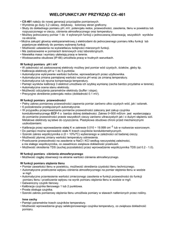 WIELOFUNKCYJNY PRZYRZĄD CX–461 • CX-461 należy do nowej generacji przyrządów pomiarowych. • Wyróżnia go duży 3,2 calowy, dotykowy, kolorowy ekran graficzny. • Służy do dokładnego pomiaru pH, mV, potencjału redox, przewodności, zasolenia, tlenu w powietrzu lub rozpuszczonego w cieczy, ciśnienia atmosferycznego oraz temperatury. • Możliwy jednoczesny pomiar 1 do 4 wybranych funkcji z jednoczesną obserwacją wszystkich wyników na ekranie. • Można zakupić głowicę wieloparametrową z elektrodami do jednoczesnego pomiaru kilku funkcji lub pojedyncze elektrody do pomiaru wybranej funkcji. • Możliwość ustawienia na wyświetlaczu kolejności mierzonych funkcji. • Ma zastosowanie w pomiarach terenowych oraz laboratoryjnych. • Niewielka masa i wymiary ułatwiają pracę w terenie. • Wodoszczelna obudowa (IP-66) umożliwia pracę w trudnych warunkach. W funkcji pomiaru pH i mV • W zależności od zastosowanej elektrody możliwy jest pomiar wód czystych, ścieków, gleby itp. • Kalibracja elektrody pH w 1 do 5 punktów. • Automatyczne wykrywanie wartości buforów, wprowadzanych przez użytkownika. • Automatyczna zmiana pamiętanej wartości wzorca pH wraz ze zmianą temperatury. • Automatyczna lub ręczna kompensacja temperatury. • Pamięć wyników kalibracji 3 elektrod umożliwia ich szybką wymianę (cecha bardzo przydatna w terenie). • Automatyczna ocena stanu elektrody. • Możliwość odczytania parametrów elektrody (buffer i slope). • Precyzyjne określenie potencjału redox (dokładność 0.1 mV). W funkcji pomiaru przewodności • Pełny zakres pomiarowy przewodności zapewnia pomiar zarówno ultra czystych wód, jak i solanek. • 6 podzakresów przełączanych automatycznie. • W przypadku przeprowadzania pomiarów przewodności zalecany jest zakup czujnika konduktometrycznego ECF-1 o bardzo dobrej dokładności. Zakres 0÷500 mS/cm jest wystarczający do pomiarów przewodności prawie wszystkich cieczy zarówno ultraczystych jak i o dużym stężeniu soli. Metalowe elektrody są łatwe do czyszczenia. Plastykowa obudowa chroni przed mechanicznymi uszkodzeniami. • Kalibracja przez wprowadzenie stałej K w zakresie 0.010 ÷ 19.999 cm -1 lub w roztworze wzorcowym. • Do pamięci można wprowadzić stałe K trzech czujników konduktometrycznych. • Szeroki zakres współczynnika α (0 ÷ 10%/ºC) wybieranego w zależności od badanej cieczy. • Możliwość płynnej zmiany wartości temperatury odniesienia. • Przeliczanie przewodności na zasolenie w NaCl i KCl według rzeczywistej zależności, a nie stałego współczynnika, co zasadniczo zwiększa dokładność przeliczeń. • Możliwość określenia TDS (suchej pozostałości) przez wprowadzenie współczynnika TDS (od 0.2 - 1.0). W funkcji pomiaru ciśnienia atmosferycznego • Możliwość ciągłej obserwacji na ekranie wartości ciśnienia atmosferycznego. W funkcji pomiaru stężenia tlenu • Pomiar zawartości tlenu w powietrzu, możliwość określenia czystości tlenu technicznego. • Automatyczne przeliczenie wpływu ciśnienia atmosferycznego na pomiar stężenia tlenu w wodzie w mg/l. • Automatyczne przeniesienie wartości zmierzonego zasolenia w funkcji przewodności do funkcji pomiaru tlenu i przeliczenie wpływu na wynik pomiaru stężenia tlenu w wodzie w mg/l. • Galwaniczny czujnik tlenowy. • Kalibracja czujnika tlenowego 1 lub 2 punktowa. • Prosta obsługa czujnika. • Szeroki zakres pomiarowy stężenia tlenu umożliwia pomiary w stawach natlenionych przez rośliny. Inne cechy • Pamięć parametrów trzech czujników temperatury. • Możliwość wprowadzenia grupy selekcjonowanego czujnika temperatury, co zwiększa dokładność pomiaru. • Funkcja zegara z kalendarzem. • Pamięć wewnętrzna do 2000 wyników, zbieranych w bankach. • Pamiętanie wyników pojedynczo lub seryjnie z czasem i datą. • Pamięć wyników i charakterystyk elektrod niezależna od zasilania. • Pamiętanie terminu następnej kalibracji. • Możliwość wyboru języka wyświetlanych informacji: polski, angielski lub niemiecki. • Zasilanie poprzez akumulatory ( 2x1,5 V) lub zasilacz (6V/500mA). • Ładowanie akumulatorów bez wyjmowania z przyrządu. • Czas pracy ciągłej bez doładowania akumulatorów do 18 godzin w zależności od wybranej jasności podświetlenia wyświetlacza. • Możliwość połączenia z PC poprzez wyjście RS-232 (lub USB przez adapter - w opcji). • Przyrząd sprzedawany jest z czujnikiem temperatury, użytkownik może dokupić wybrane elektrody. • Przyrząd spełnia wymogi GLP. • Gwarancja na przyrząd 24 miesiące. Dane techniczne Funkcja Zakres Dokładność ( 1 cyfra) Komp. temp. Imped. wejściowa Zakres ciśn. atm. Wymiary (mm) pH mV -2.000 ÷ 16.000 pH ±1999.9 mV ±0.002 pH ±0.1 mV -5 ¸ 110 ºC 1012W 12 10 W Przewodność, zasolenie 0 ÷ 1999.9 mS/cm 0 ÷ 200 g KCl 0 ÷ 250 g NaCl ±0.1% > 20 mS/cm: ±0,25% -5 70 ºC O2 (mg/l) O2 (%) powietrze Temperatura woda 0 ÷ 60 mg/l 0 ÷ 100% 0 ÷ 600% -50.0 ÷ 199.9ºC ±0.1 mg/l ±0,2% ±1% ±0.1 ºC* 0 ¸ 40 ºC 0 ¸ 40 ºC - - - 800 ¸ 1100 hPa L=149 W=82 H=22 - * Dokładność przyrządu. Całkowita dokładność jest sumą dokładności przyrządu i samego czujnika. 41-814 ZABRZE ul. W. Witosa 10 tel. 32 273 81 06, fax 32 273 81 14 [email protected] www.elmetron.pl
