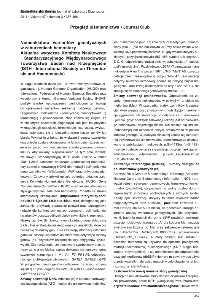 diagnostyka laboratoryjna Journal of Laboratory Diagnostics 2011 • Volume 47 • Number 3 • 357-366 Przegląd piśmiennictwa • Journal Club Nomenklatura wariantów genetycznych w zaburzeniach hemostazy. Aktualne wytyczne Komitetu Naukowego i Standaryzacyjnego Międzynarodowego Towarzystwa Badań nad Krzepnięciem (ISTH - International Society on Thrombosis and Haemostasis) W ciągu ostatnich dziesięciu lat dwie międzynarodowe organizacje, t.j. Human Genome Organisation (HUGO) oraz International Federation of Human Genetics Societies przy współpracy z Human Genome Variation Society (HGVS) podjęły wysiłek wprowadzenia ujednoliconej terminologii do opisywania wariantów sekwencji ludzkiego genomu. Diagnostyka molekularna (genetyczna) zaadoptowała tę terminologię z powodzeniem, choć zdarza się często, że w niektórych obszarach diagnostyki, tak jest na przykład w koagulologii, stosuje się terminologię historyczną, zwyczajową, opierającą się o idiosynkratyczne nazwy genów lub białek. Wynika to z faktu, że większość genów czynników krzepnięcia została sklonowana w latach osiemdziesiątych, jeszcze przed wprowadzeniem standaryzowanej nomenklatury. Aby uniknąć nieporozumień na tym polu, Komitet Naukowy i Standaryzacyjny ISTH wydał kolejno w latach 2001 i 2003 zalecenia dotyczące ujednoliconej nomenklatury opartej o konwencję HGVS dla mutacji i polimorfizmów genu czynnika von Willebranda (vWF) oraz antygenów płytkowych. Cytowany artykuł opisuje pokrótce aktualne zalecenia Komitetu Nomenklatury Genetycznej HUGO (Gene Nomenclature Committee - HGNC) w odniesieniu do diagnostyki genetycznej zaburzeń hemostazy. Ponadto na stronie internetowej czasopisma (http://onlinelibrary.wiley.com/ doi/10.1111/jth.2011.9.issue-4/issuetoc) dostępne są, jako załączniki, przykłady poprawnej pisowni oraz szczegółowe notacje dla konkretnych mutacji genowych, polimorfizmów i wariantów poszczególnych białek czynników krzepnięcia. Nazwy genów. Symboliczny opis każdego genu składa się z kilku liter alfabetu łacińskiego oraz cyfr arabskich, które odnoszą się do nazwy genu i nie zawierają informacji odnośnie gatunku. Stosuje się natomiast hierarchię dotycząca rodziny genów (np. czynników krzepnięcia czy antygenów płytkowych). Dla odróżnienia, że stosowany symboliczny opis dotyczy genu a nie białka, zapisu dokonuje się kursywą; geny czynników krzepnięcia II, V i VIII: F2, F5 i F8, odpowiednio; geny glikoprotein płytkowych: GP1BA, GP1BB i GP6. W przypadku pseudogenów dodatkowo na końcu stosuje się literę P; pseudogeny dla vWF lub białka S, odpowiednio: VWFP and PROSP. Zmiany sekwencji DNA. Adenina (A) z kodonu startowego dla każdego białka (ATG – kodon dla aminokwasu metioniny) jest numerowana jako +1; kolejny 5’-nukleotyd jest numerowany jako -1 (nie ma nukleotydu 0). Przy opisie zmian w sekwencji DNA podawana jest litera „c.” gdy zmiana dotyczy nukleotydu; pozycja nukleotydu: 567, 456; symbol nukleotydu: A, T, C, G, odpowiednio; rodzaj zmiany: substytucja „>”, delecja „del”, insercja „ins”. Przykładowo: c.567A>T oznacza zamianę nukleotydu A na T w pozycji 567; c.345_7del3TAG oznacza delecje trzech nukleotydów w pozycji 345-347. Jeśli mutacja dotyczy sekwencji intronowej, podaje się pozycję najbliższego egzonu oraz liczbę nukleotydów od niej: c.456 +2T>C. Nie stosuje się w terminologii genetycznej strzałek „→”. Zmiany sekwencji aminokwasów. Odpowiednio do zasady numerowania nukleotydów, w pozycji +1 znajduje się metionina (Met). W przypadku białek czynników krzepnięcia, które ulegają postranslacyjnym modyfikacjom, sekwencje sygnałowe lub sekwencje propetydów są numerowane ujemnie, gdyż początek sekwencji liczony jest od pierwszego aminokwasu dojrzałego białka. Nie stosuje sią strzałek (substytucje) ani oznaczeń pozycji aminokwasu w postaci indeksu górnego. W praktyce klinicznej zaleca się oznaczenia trzyliterowe dla aminokwasów, jednoliterowe są akceptowane w publikacjach naukowych: p.Gly143Ser (p.G143S). Insercje i delecje oznacza się podając pozycje flankujących aminokwasów, odpowiednio: p.Lys45_Leu46insGlnSer (p.K_45L46insQS). Sekwencje referencyjne (RefSeq) i numery dostępu do polimorfizmów genowych (rs) Amerykańskie Centrum Biotechnologii i Informacji (American National Centre for Biotechnology Information - NCBI) prowadzi rejestr sekwencji genomowych, transkryptomowych i białek (peptydów), co pozwala na wolny dostęp do zintegrowanych informacji pochodzących z różnych źródeł. Każdy opis sekwencji, dotyczy to także wyników badań diagnostycznych oraz publikacji, powinien zawierać numer RefSeq dla DNA lub białka, na podstawie którego dokonano analizy wariantow genetycznych. Dla przykładu, wynik badania mutacji dla genu VWF powinien zawierać: pozycję nukleotydu liczoną od „A” dla kodonu Met, pozycję aminokwasu liczoną od Met oraz sekwencje referencyjne dla nukleotydów (RefSeq NM_000552.x) i aminokwasów (RefSeq NP_000543.x). Numery dostępu (rs; RefSNP accesion numbers) są używane do opisania pojedynczej mutacji (polimorfizmu) nukleotydowego (SNP; single nucleotide polymorphism) i są odnośnikiem do odpowiedniej bazy polimorfizmow (dbSNP).Numery rs powinny być użyte przede wszystkim do opisu mutacji w celu ułatwienia jej jednoznacznej identyfikacji. Zastosowanie nowej nomenklatury genetycznej Dostęp do aktualizowanej bazy danych czynnikow krzepnięcia prowadzonej przez ISTH (CoagBase) http://www.isth. org/default/index.cfm/standards/coagbase/ ułatwia wpro357 Przegląd piśmiennictwa wadzenia nowej, wystandaryzowanej nomenklatury do opisu wariantów genetycznych czynników krzepnięcia. Według: Goodeve AC, Reitsma PH, McVey JH, on behalf of the Working Group on Nomenclature of the Scientific and Standardisation Committee of the International Society on Thrombosis and Haemostasis. Nomenclature of genetic variants in hemostasis. J 