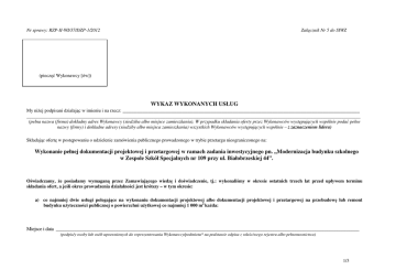 Nr sprawy: RZP-II-WI/37/DZP-1/2012 (piecz Zał cznik Nr 5 do SIWZ Wykonawcy [ów]) WYKAZ WYKONANYCH USŁUG My ni ej podpisani działaj c w imieniu i na rzecz: ____________________________________________________________________________________ ______________________________________________________________________________________________________________________________________________ (pełna nazwa (firma) dokładny adres Wykonawcy (siedziba albo miejsce zamieszkania). W przypadku składania oferty przez Wykonawców wyst puj cych wspólnie poda pełne nazwy (firmy) i dokładne adresy (siedziby albo miejsca zamieszkania) wszystkich Wykonawców wyst puj cych wspólnie – z zaznaczeniem lidera) Składaj c ofert w post powaniu o udzielenie zamówienia publicznego prowadzonego w trybie przetargu nieograniczonego na: Wykonanie pełnej dokumentacji projektowej i przetargowej w ramach zadania inwestycyjnego pn. ,,Modernizacja budynku szkolnego w Zespole Szkół Specjalnych nr 109 przy ul. Białobrzeskiej 44”. O wiadczamy, e posiadamy wymagan przez Zamawiaj cego wiedz i do wiadczenie, tj.: wykonali my w okresie ostatnich trzech lat przed upływem terminu składania ofert, a je li okres prowadzenia działalno ci jest krótszy – w tym okresie: a) co najmniej dwie usługi polegaj ce na wykonaniu dokumentacji projektowej albo dokumentacji projektowej i przetargowej na przebudow lub remont budynku u yteczno ci publicznej o powierzchni u ytkowej co najmniej 1 000 m2 ka da: Miejsce i data ____________________________________________________________________________________________________________________________ (podpis/y osoby lub osób uprawnionych do reprezentowania Wykonawcy/podmiotu* na podstawie odpisu z wła ciwego rejestru albo pełnomocnictwa) 1/3 Nr sprawy: RZP-II-WI/37/DZP-1/2012 Lp 1 Nazwa i siedziba Zamawiaj cego/Odbiorcy (aktualne dane) z którym Wykonawca/podmiot, zawarł umow 2 Zał cznik Nr 5 do SIWZ Nazwa zamówienia Opis przedmiotu zamówienia, ze wskazaniem rodzaju opracowania oraz z podaniem rodzaju robót obj tych przedmiotowym opracowaniem, a tak e powierzchni u ytkowej i rodzaju budynku, dla którego wykonana była ww. dokumentacja. data rozpocz cia data zako czenia 3 4 5 6 Terminy realizacji 1 2 oraz Miejsce i data ____________________________________________________________________________________________________________________________ (podpis/y osoby lub osób uprawnionych do reprezentowania Wykonawcy/podmiotu* na podstawie odpisu z wła ciwego rejestru albo pełnomocnictwa) 2/3 Nr sprawy: RZP-II-WI/37/DZP-1/2012 Zał cznik Nr 5 do SIWZ b) co najmniej jednej usługi polegaj cej na wykonaniu dokumentacji projektowej albo dokumentacji projektowej i przetargowej na przebudow lub remont budynku u yteczno ci publicznej o warto ci zamówienia co najmniej 150.000,00 zł brutto. Lp. 1 Nazwa i siedziba Zamawiaj cego/Odbiorcy (aktualne dane) z którym Wykonawca/podmiot, zawarł umow Nazwa zamówienia Opis przedmiotu zamówienia, ze wskazaniem rodzaju opracowania oraz z podaniem rodzaju robót obj tych przedmiotowym opracowaniem, a tak e rodzaju budynku, dla którego wykonana była ww. dokumentacja. 2 3 4 Warto brutto wykonanego zamówienia (dokumentacji projektowej albo dokumentacji projektowej i przetargowej) podana w walucie, w której zostało dokonane rozliczenie pomi dzy Wykonawc /podmiotem a Zamawiaj cym/Odbiorc 5 Terminy wykonania data rozpocz cia data zako czenia 6 7 1 2 Uwaga! W przypadku gdy Wykonawca b dzie polega na wiedzy i do wiadczeniu innych podmiotów, do Oferty nale y zał czy pisemne zobowi zanie tych podmiotów do oddania mu do dyspozycji niezb dnych zasobów w zakresie wiedzy i do wiadczenia na okres korzystania z nich przy wykonaniu zamówienia. Miejsce i data ____________________________________________________________________________________________________________________________ (podpis/y osoby lub osób uprawnionych do reprezentowania Wykonawcy/podmiotu* na podstawie odpisu z wła ciwego rejestru albo pełnomocnictwa) 3/3