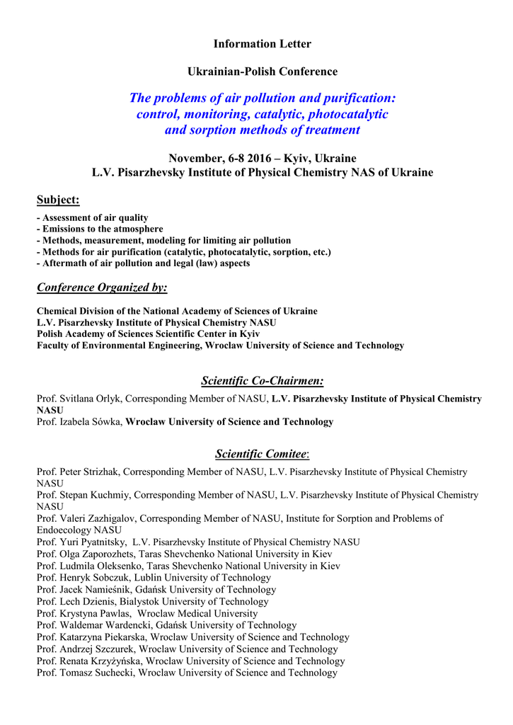 Information Letter Ukrainian-Polish Conference The problems of air pollution and purification: control, monitoring, catalytic, photocatalytic and sorption methods of treatment November, 6-8 2016 – Kyiv, Ukraine L.V. Pisarzhevsky Institute of Physical Chemistry NAS of Ukraine Subject: - Assessment of air quality - Emissions to the atmosphere - Methods, measurement, modeling for limiting air pollution - Methods for air purification (catalytic, photocatalytic, sorption, etc.) - Aftermath of air pollution and legal (law) aspects Conference Organized by: Chemical Division of the National Academy of Sciences of Ukraine L.V. Pisarzhevsky Institute of Physical Chemistry NASU Polish Academy of Sciences Scientific Center in Kyiv Faculty of Environmental Engineering, Wroclaw University of Science and Technology Scientific Co-Chairmen: Prof. Svitlana Orlyk, Сorresponding Member of NASU, L.V. Pisarzhevsky Institute of Physical Chemistry NASU Prof. Izabela Sówka, Wroclaw University of Science and Technology Scientific Comitee: Prof. Peter Strizhak, Сorresponding Member of NASU, L.V. Pisarzhevsky Institute of Physical Chemistry NASU Prof. Stepan Kuchmiy, Сorresponding Member of NASU, L.V. Pisarzhevsky Institute of Physical Chemistry NASU Prof. Valeri Zazhigalov, Сorresponding Member of NASU, Institute for Sorption and Problems of Endoecology NASU Prof. Yuri Pyatnitsky, L.V. Pisarzhevsky Institute of Physical Chemistry NASU Prof. Olga Zaporozhets, Taras Shevchenko National University in Kiev Prof. Ludmila Oleksenko, Taras Shevchenko National University in Kiev Prof. Henryk Sobczuk, Lublin University of Technology Prof. Jacek Namieśnik, Gdańsk University of Technology Prof. Lech Dzienis, Bialystok University of Technology Prof. Krystyna Pawlas, Wroclaw Medical University Prof. Waldemar Wardencki, Gdańsk University of Technology Prof. Katarzyna Piekarska, Wroclaw University of Science and Technology Prof. Andrzej Szczurek, Wroclaw University of Science and Technology Prof. Renata Krzyżyńska, Wroclaw University of Science and Technology Prof. Tomasz Suchecki, Wroclaw University of Science and Technology Prof. Józef Pastuszka, Silesian University of Technology Prof. Jacek Piekarski, Koszalin University of Technology Prof. Henryk Wasąg, Lublin University of Technology Dr hab. inż. Wioletta Rogula-Kozłowska, Institute of Environmental Engineering, Polish Academy of Sciences in Zabrze Dr hab. inż. Artur Badyda, Warsaw University of Technology Dr hab. inż. Mariusz Korczyński, Wroclaw University of Environmental and Life Sciences Dr hab. Maciej Górka, University of Wroclaw Dr hab. inż. Sebastian Opaliński, Wroclaw University of Environmental and Life Sciences Dr hab. Justyna Rybak, Wroclaw University of Science and Technology Organising Committee: Prof. S. Soloviev (Chair) Dr. N. Vlasenko (Secretary) Dr. G. Kosmambetova Dr. Ye. Gubareni Dr. V. Shvalagin M. Sc. U. Miller M. Sc. Y. Bezyk M. Sc. Ł.Pachurka Key Data: Submission of applications (indicating title and author of the report) – up to October, 10 2016 Submission of Abstracts – up to October, 20 2016 Registration is carried out only by e-mail: [email protected] The working languages of the Conference are Ukrainian, Polish and English.