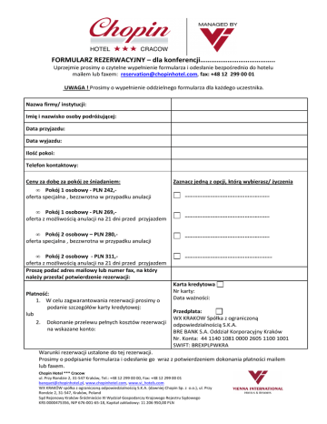 FORMULARZ REZERWACYJNY – dla konferencji………………………………….. Uprzejmie prosimy o czytelne wypełnienie formularza i odesłanie bezpośrednio do hotelu mailem lub faxem: [email protected], fax: +48 12 299 00 01 UWAGA ! Prosimy o wypełnienie oddzielnego formularza dla każdego uczestnika. Nazwa firmy/ instytucji: Imię i nazwisko osoby podróżującej: Data przyjazdu: Data wyjazdu: Ilość pokoi: Telefon kontaktowy: Ceny za dobę za pokój ze śniadaniem: Zaznacz jedną z opcji, którą wybierasz/ życzenia • Pokój 1 osobowy - PLN 242,oferta specjalna , bezzwrotna w przypadku anulacji ………………………………………………….. • Pokój 1 osobowy - PLN 269,oferta z możliwością anulacji na 21 dni przed przyjazdem ………………………………………………….. • Pokój 2 osobowy – PLN 280,oferta specjalna , bezzwrotna w przypadku anulacji ………………………………………………….. • Pokój 2 osobowy - PLN 311,oferta z możliwością anulacji na 21 dni przed przyjazdem Proszę podać adres mailowy lub numer fax, na który należy przesłać potwierdzenie rezerwacji: Płatność: 1. W celu zagwarantowania rezerwacji prosimy o podanie szczegółów karty kredytowej: lub 2. Dokonanie przelewu pełnych kosztów rezerwacji na wskazane konto: ……………………………………………………. Karta kredytowa Nr karty: Data ważności: Przedpłata: WX KRAKOW Spółka z ograniczoną odpowiedzialnością S.K.A. BRE BANK S.A. Oddział Korporacyjny Kraków Nr. Konta: 44 1140 1081 0000 2605 1100 1001 SWIFT: BREXPLPWKRA Warunki rezerwacji ustalone do tej rezerwacji. Prosimy o podpisanie formularza i odesłanie go wraz z potwierdzeniem dokonania płatności mailem lub faxem. Chopin Hotel *** Cracow ul. Przy Rondzie 2, 31-547 Kraków, Tel.: +48 12 299 00 00, Fax: +48 12 299 00 01 [email protected], www.chopinhotel.com, www.vi_hotels.com WX KRAKÓW spółka z ograniczoną odpowiedzialnością S.K.A. (dawniej Chopin Sp. z o.o.), ul. Przy Rondzie 2, 31-547, Kraków, Poland Sąd Rejonowy Kraków-Śródmieście XI Wydział Gospodarczy Krajowego Rejestru Sądowego KRS 0000475356, NIP 676-001-65-18, Kapitał zakładowy: 11 206 950,00 PLN