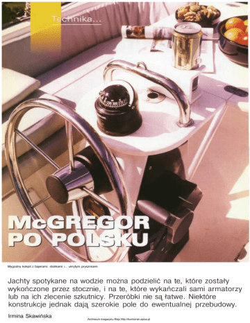 Wygodny kokpit z bajerami: stolikami i... ukrytym prysznicem Jachty spotykane na wodzie można podzielić na te, które zostały wykończone przez stocznie, i na te, które wykańczali sami armatorzy lub na ich zlecenie szkutnicy. Przeróbki nie są łatwe. Niektóre konstrukcje jednak dają szerokie pole do ewentualnej przebudowy. Irmina Skawińska Archiwum magazynu Rejs http://kormoran.aplus.pl Kambuz z funkcjonalnym barkiem Laminatowa zabudowa WC ułatwia sprzątnie W jednostkach „stoczniowych" tuje niewielkie zanurzenie; umieszczony w podwójnym dnie balast zabudowa wykonana jest na ogół z laminatu - obniża to koszty, ułat- wodny zapewnia stateczność i ułatwia transport po opróżnieniu komór. wia i przyspiesza montaż jachtu. Te Jacht zabudowany został w stowalory oraz łatwość utrzymania jaczni wklejkami z laminatu. Znalazła chtu w czystości przyciągają firmy się tam podwójna koja pod wanną czarterujące. Jednak po spędzeniu kokpitu, jedna pojedyncza koja na lekilku dni na takim jachcie żeglarze wej burcie i podwójna koja, powstadochodzą do wniosku, że kambuz mógłby wyglądać trochę inaczej, jąca po opuszczeniu laminowanego jaskółki mogłyby mieć inny kształt, stołu. Po jednym sezonie z rodziną głębokość i może coś jeszcze trzeba J znajomymi na Mazurach armator podjął decyzję o zmianie zabudowy byłoby zmienić... Drugą grupę stanowią jachty, jachtu. gdzie możliwa jest, z zachowaniem wymogów konstrukcyjnych, duża Przebudowa dowolność zabudowy jachtu. Armator może dowolnie decydować • Największą widoczną zmianą o kształcie i wielkości kambuza było dodanie przestrzeni pakunkoczy jaskółek. Stąd też każdy taki wej. Stąd w części dziobowej, pod jacht jest jedyny w swoim rodzaju. forpikiem, zamontowana została duża, wygodna szafa na ubrania. Jest na tyle duża, że swobodnie mieści Pod różne upodobania się w niej pościel z koi dziobowej. Przykładem takiego rozwiązania Niewygodne plastikowe oparcia, montowane na burtach, wymieniomoże być prezentowany przez nas jacht, sprowadzony z zagranicy i wyne zostały na jaskółki, których kształt kończony w podwarszawskim warpodporządkowany został wymagasztacie szkutniczym. niom ergonomii. Nie są może tak Opisywana amerykańska kon„pojemne", ale spełniają swoje zastrukcja to nietypowy na naszych danie - rzeczy można szybko pochować. Usytuowana za ścianką kabiwodach jacht typu McGregor, o dłuny sanitarnej wisząca szafka narożna gości ponad 8 m, szerokości około jest idealnym schowkiem na podrę2,50 m i wysokości stania w kabinie czne ubrania, w której również zna- 1,80 m. Obrotowy miecz gwaran- Archiwum magazynu Rejs http://kormoran.aplus.pl Praktyczność, wygoda, estetyka - wariant „wypoczynkowy" wnętrza Wielofunkcyjny, składany stolik bez kłopotu pozwala zamienić jadalnię w sypialnię lazło się miejsce na radio dobrej marki. Aby ograniczyć straty po ewentualnym włamaniu do jachtu, zainstalowano przenośne radio samochodowe wraz z kieszenią. W dbałości o jakość dźwięku zamontowano specjalne głośniki, odporne na działanie wilgoci. Dwa z nich zamontowano w kabinie, dwa kolejne w kokpicie. • Rozplanowanie wnętrza kabiny przemyślane zostało od nowa. Teraz może w niej spać 6 osób. Na pilersie zamontowany został stół o dość nietypowej konstrukcji - może być on obracany, opuszczany, podnoszony lub częściowo złożony. W zależności od potrzeb mamy więc jadalnię lub dwie podwójne, wygodne koje. • Sam kambuz uległ również zmianie. Do pierwotnej zabudowy dodano dużą, wygodną szafkę na naczynia (wiązało się to z częścioArchiwum magazynu Rejs http://kormoran.aplus.pl wym wycięciem wklejki pod kuchnią). Dopasowane zostało lico, które wniosło więcej ciepła w kambuzie i przypomina o trendach zabudowy, kiedy to królowały mahoń i dąb. Szafki zaprojektowano tak, iż nie ma niebezpieczeństwa, że w czasie pływania w kambuzie porządek zrobi się sam. Poprawiono też ergonomię samego miejsca przyrządzania posiłków - wszystkie niezbędne rzeczy są pod ręką. Pojawił się też nowy ważny element wyposażenia - barek. l tak jak reszta rzeczy jego zawartość jest łatwo dostępna. • Zabudowę drewnianą wykonano ze sklejki wodoodpornej, fornirowanej sosną drobnosłoistą. W dbałości o styl wykończenie krawędzi jaskółek i szafek wykonane zostało z mahoniu. Aby zabezpieczyć drewno przed wpływem wilgoci zostało ono bardzo dokładnie polakierowane. W „ostatnim" momencie armator zmienił kolor zabudowy - ca• łość polakierowana została lakierem barwiącym w kolorze jasnego dębu. • W bakistach pod kojami zamontowano szereg pomp i dwa zbiorniki: jeden ze stali kwasoodpornej na wodę pitną, dopasowany do kształtu dna, i drugi, katalogowy, plastikowy na fekalia. Ta dbałość o ekologię przydać się może w portach na Zachodzie, gdzie urządzenia odsysające nieczystości dostępne są na kei - u nas niestety nie ma ich w portach. W kranach jest woda pitna i zaburtowa. Ze względu na to, iż dno kabiny sanitarnej, jak również prysznicowej, znajduje się poniżej poziomu wody, zainstalowano pompę, która samoczynnie wtacza się w czasie korzystania z prysznica. Kabina sanitarna wykonana została w całości z laminatu, co stanowi duże ułatwienie w utrzymaniu czystości i zapewnia szczelność tego pomieszczenia. Jacht wyposażony jest również w pompę zęzową. • Na pokładzie też pojawiły się pewne istotne zmiany. Zamontowano zmodernizowany, otwarty kosz dziobowy umożliwiający wchodzenie i wychodzenie na keję z podwójnie składaną drabinką do wody. Wykonany został również duży, stały stół kokpitowy, montowany na słupku koła sterowego. W czasie pływania, po złożeniu teleskopowej nogi i skrzydeł, „mebel" nie przeszkadza żeglarzom. Stolik wykonano z tworzywa sztucznego, mogą przy nim biesiadować cztery osoby. Cała obsługa jachtu sprowad