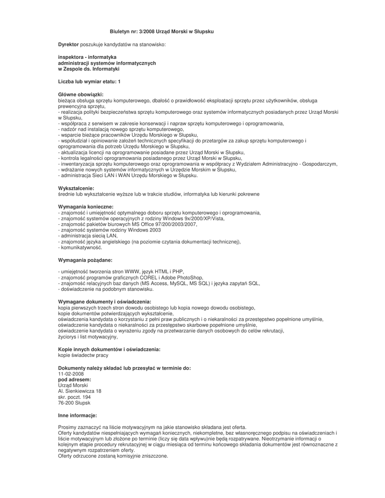 Biuletyn nr: 3/2008 Urz ąd Morski w Słupsku Dyrektor poszukuje