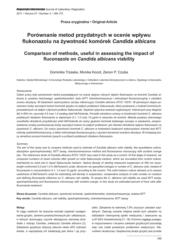 diagnostyka laboratoryjna Journal of Laboratory Diagnostics 2011 • Volume 47 • Number 2 • 169-175 Praca oryginalna • Original Article Porównanie metod przydatnych w ocenie wpływu flukonazolu na żywotność komórek Candida albicans Comparison of methods, useful in assessing the impact of fluconazole on Candida albicans viability Dominika Trzaska, Monika Kocot, Zenon P. Czuba Katedra i Zakład Mikrobiologii i Immunologii Wydziału Lekarskiego z Oddziałem Lekarsko-Dentystycznym w Zabrzu, Śląskiego Uniwersytetu Medycznego w Katowicach Streszczenie Celem pracy było porównanie metod pozwalających na ocenę wpływu różnych stężeń flukonazolu na komórki Candida albicans tj. posiewu ilościowego, spektrofotometrii, testu MTT, chemiluminescencji i mikroskopii fluorescencyjnej z udziałem oranżu akrydyny. W badaniach wykorzystano szczep referencyjny Candida albicans ATCC 10231. W pierwszym etapie porównano liczby wyrosłych kolonii komórek grzyba na stałych podłożach Sabourauda, które posiewano z hodowli kontrolnych, prowadzonych na stałym i płynnym podłożu Sabourauda. Gęstości optyczne zawiesin wyjściowych, mierzonych przy długości fali λ=550 nm, wynosiły 0,5 oraz 1,0 według skali McFarlanda. Ponadto określono zmiany w liczebności komórek C. albicans poddanych działaniu flukonazolu w stężeniach 0,1; 1,0 oraz 10 µg/ml w stosunku do kontroli. Metoda posiewu ilościowego umożliwiła określenie przydatności skali McFarlanda do oceny gęstości komórek badanego szczepu w zawiesinie, przeprowadzenie analizy porównawczej liczby wyrosłych kolonii na stałych podłożach, jak również określenie wpływu flukonazolu na żywotność C. albicans. Do oceny żywotności komórek C. albicans w hodowlach badanych wykorzystano również test MTT, metodę spektrofotometryczną, a także mikroskopię fluorescencyjną z użyciem barwienia oranżem akrydyny. W niniejszej pracy określono procent komórek żywych w próbach poddanych działaniu flukonazolu. Summary The aim of this study was to compare methods used to estimate of Candida albicans cells viability, like quantitative culture, absorption spectrophotometry, MTT assay, chemiluminescence method and fluorescence microscopy with acridine orange dye. The references strain of Candida albicans ATCC 10231 was used in this study as a control. At first stage of research, we compared numbers of yeast colonies after growth on solid Sabourauda medium, which we inoculated from control culture, maintained on solid and in liquid Sabourauda medium. Optical density of starting measured suspension at 550 nm wavelength conformed 0,5 and 1,0 in McFarland’s scale. Moreover we specyfied changes in number of C. albicans cells, treated of fluconazole in concentrations 0,1; 1,0 and 10 µg/ml, according to the control. The solid medium culture allowed us to assess usefulness of McFarland’s scale for estimating cell density in suspension, comperative analysis of cells number on medium and defining fluconazole influence on C. albicans cell viability. To assess the C. albicans cell viability we used MTT assay, spectrophotometry and fluorescence microscopy with acridine orange. In this study we estimated percent of lives cells after fluconazole treatment. Słowa kluczowe:Candida albicans, żywotność komórek, spektrofotometria, chemiluminescencja, analiza MTT Key words:Candida albicans, cell viability, spectrophotometry, chemiluminescence, MTT assay Wstęp W ciągu ostatnich lat znacznie wzrosła częstość występowania grzybic, zarówno powierzchniowych jak i układowych, w których dominujący czynnik etiologiczny stanowią drożdżaki z rodzaju Candida, zwłaszcza Candida albicans [1]. Zakażenia grzybicze dotyczą obecnie około 40% ludności świata, a najczęstszą ich lokalizacją jest skóra i jej przy- datki. Zakażenia te stanowią 7,9% przyczyn zakażeń szpitalnych. Zajmują czwarte miejsce wśród tych zakażeń na oddziałach intensywnej opieki medycznej i obarczone są w 67-83% śmiertelnością [11, 16]. Pomimo ciągłego postępu w rozpoznawaniu i leczeniu zakażeń grzybiczych pozostają więc one nadal poważnym problemem medycznym. Warunkiem skutecznej i bezpiecznej terapii grzybic jest przede 169 Porównanie metod przydatnych w ocenie wpływu flukonazolu na żywotność komórek Candida albicans wszystkim właściwe rozpoznawanie infekcji, połączone z identyfikacją patogennych grzybów, a także właściwy wybór skutecznej i akceptowanej przez chorego metody leczenia. Równie ważna jest odpowiednia profilaktyka, polegająca głównie na usuwaniu czynników predysponujących do zakażenia. Podstawowa diagnostyka mykologiczna obejmuje badanie mikroskopowe materiału biologicznego pobranego od pacjenta, hodowlę na podłożu agarowym oraz identyfikację biochemiczną z użyciem testów opartych na auksanografii węglowodanowej i związków azotowych (testy przyswajania węgla i azotu z określonych związków organicznych) oraz ocenie zdolności wytwarzania określonych enzymów. Uzupełnieniem diagnostyki może być także badanie histologiczne wycinka pobranego z miejsca zajętego przez kolonie grzyba, ocena przeciwciał przeciwgrzybiczych we krwi pacjenta (test immunoenzymatyczny - ELISA) [7, 15] oraz wykrycie materiału genetycznego grzyba z wykorzystaniem technik biologii molekularnej (w tym PCR, real-time PCR) [5, 7, 15, 17, 18]. Metody te dają jednak jedynie wynik jakościowy. Dlatego też celem niniejszej pracy była ocena przydatności posiewu ilościowego na podłożu agarowym w ocenie żywotności komórek C. albicans poddanych działaniu flukonazolu oraz porównanie tej metody z innymi, nie wykorzystywanymi rutynowo w diagnostyce mykologicznej tj. z testem MTT, barwieniem oranżem akrydyny i oznaczaniem ATP metodą chemiluminescencji [6, 8, 10, 19]. Materiały i metody Badany szczep i warunki hodowli Do badań wykorzystano szczep referencyjny Candida albicans ATCC 10231, pochodzący z Ame