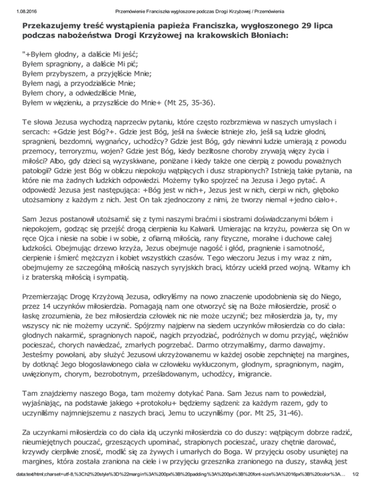 1.08.2016 Przemówienie Franciszka wygłoszone podczas Drogi Krzyżowej / Przemówienia Przekazujemy treść wystąpienia papieża Franciszka, wygłoszonego 29 lipca podczas nabożeństwa Drogi Krzyżowej na krakowskich Błoniach: "+Byłem głodny, a daliście Mi jeść; Byłem spragniony, a daliście Mi pić; Byłem przybyszem, a przyjęliście Mnie; Byłem nagi, a przyodzialiście Mnie; Byłem chory, a odwiedziliście Mnie, Byłem w więzieniu, a przyszliście do Mnie+ (Mt 25, 35-36). Te słowa Jezusa wychodzą naprzeciw pytaniu, które często rozbrzmiewa w naszych umysłach i sercach: +Gdzie jest Bóg?+. Gdzie jest Bóg, jeśli na świecie istnieje zło, jeśli są ludzie głodni, spragnieni, bezdomni, wygnańcy, uchodźcy? Gdzie jest Bóg, gdy niewinni ludzie umierają z powodu przemocy, terroryzmu, wojen? Gdzie jest Bóg, kiedy bezlitosne choroby zrywają więzy życia i miłości? Albo, gdy dzieci są wyzyskiwane, poniżane i kiedy także one cierpią z powodu poważnych patologii? Gdzie jest Bóg w obliczu niepokoju wątpiących i dusz strapionych? Istnieją takie pytania, na które nie ma żadnych ludzkich odpowiedzi. Możemy tylko spojrzeć na Jezusa i Jego pytać. A odpowiedź Jezusa jest następująca: +Bóg jest w nich+, Jezus jest w nich, cierpi w nich, głęboko utożsamiony z każdym z nich. Jest On tak zjednoczony z nimi, że tworzy niemal +jedno ciało+. Sam Jezus postanowił utożsamić się z tymi naszymi braćmi i siostrami doświadczanymi bólem i niepokojem, godząc się przejść drogą cierpienia ku Kalwarii. Umierając na krzyżu, powierza się On w ręce Ojca i niesie na sobie i w sobie, z ofiarną miłością, rany fizyczne, moralne i duchowe całej ludzkości. Obejmując drzewo krzyża, Jezus obejmuje nagość i głód, pragnienie i samotność, cierpienie i śmierć mężczyzn i kobiet wszystkich czasów. Tego wieczoru Jezus i my wraz z nim, obejmujemy ze szczególną miłością naszych syryjskich braci, którzy uciekli przed wojną. Witamy ich i z braterską miłością i sympatią. Przemierzając Drogę Krzyżową Jezusa, odkryliśmy na nowo znaczenie upodobnienia się do Niego, przez 14 uczynków miłosierdzia. Pomagają nam one otworzyć się na Boże miłosierdzie, prosić o łaskę zrozumienia, że bez miłosierdzia człowiek nic nie może uczynić; bez miłosierdzia ja, ty, my wszyscy nic nie możemy uczynić. Spójrzmy najpierw na siedem uczynków miłosierdzia co do ciała: głodnych nakarmić, spragnionych napoić, nagich przyodziać, podróżnych w domu przyjąć, więźniów pocieszać, chorych nawiedzać, zmarłych pogrzebać. Darmo otrzymaliśmy, darmo dawajmy. Jesteśmy powołani, aby służyć Jezusowi ukrzyżowanemu w każdej osobie zepchniętej na margines, by dotknąć Jego błogosławionego ciała w człowieku wykluczonym, głodnym, spragnionym, nagim, uwięzionym, chorym, bezrobotnym, prześladowanym, uchodźcy, imigrancie. Tam znajdziemy naszego Boga, tam możemy dotykać Pana. Sam Jezus nam to powiedział, wyjaśniając, na podstawie jakiego +protokołu+ będziemy sądzeni: za każdym razem, gdy to uczyniliśmy najmniejszemu z naszych braci, Jemu to uczyniliśmy (por. Mt 25, 31-46). Za uczynkami miłosierdzia co do ciała idą uczynki miłosierdzia co do duszy: wątpiącym dobrze radzić, nieumiejętnych pouczać, grzeszących upominać, strapionych pocieszać, urazy chętnie darować, krzywdy cierpliwie znosić, modlić się za żywych i umarłych do Boga. W przyjęciu osoby usuniętej na margines, która została zraniona na ciele i w przyjęciu grzesznika zranionego na duszy, stawką jest data:text/html;charset=utf-8,%3Ch2%20style%3D%22margin%3A%200px%3B%20padding%3A%200px%3B%20font-size%3A%2016px%3B%20color%3A… 1/2 1.08.2016 Przemówienie Franciszka wygłoszone podczas Drogi Krzyżowej / Przemówienia nasza wiarygodność jako chrześcijan.W przyjęciu usuniętego na margines, w przyjęciu grzesznika zranionego na duszy; wtedy stawką jest nasza wiarygodność. Nie wtedy gdy mówimy o pojęciach, poglądach. Dziś ludzkość potrzebuje mężczyzn i kobiet, a szczególnie ludzi młodych, takich jak wy, którzy nie chcą przeżywać swojego życia połowicznie, młodych gotowych poświęcić swoje życie w bezinteresownej służbie braciom najuboższym i najsłabszym, na wzór Chrystusa, który oddał się całkowicie dla naszego zbawienia. W obliczu zła, cierpienia, grzechu, dla ucznia Jezusa jedyną możliwą odpowiedzią jest dar z siebie, a nawet dar własnego życia, na wzór Chrystusa; to jest postawa służby. Jeśli ktoś, kto nazywa siebie chrześcijaninem, nie żyje, aby służyć, służy tylko, aby żyć. Swoim życiem zapiera się Jezusa Chrystusa. Dzisiejszego wieczoru, drodzy młodzi, Pan ponownie zaprasza was, byście stawali się aktywnymi bohaterami służby; pragnie was uczynić konkretną odpowiedzią na potrzeby i cierpienia ludzkości; chce, abyście byli znakiem Jego miłosiernej miłości dla naszych czasów! Aby wypełnić tę misję, wskazuje On wam drogę osobistego zaangażowania i poświęcenia samych siebie: jest to Droga Krzyżowa. Droga Krzyżowa jest drogą szczęścia pójścia za Chrystusem aż do końca, w często dramatycznych okolicznościach życia codziennego; jest to droga, która nie boi się niepowodzeń, marginalizacji lub samotności, ponieważ wypełnia serce człowieka pełnią Jezusa. Droga Krzyżowa jest drogą życia i stylu Boga, którą Jezus prowadzi także pośród ścieżek społeczeństwa czasami podzielonego, niesprawiedliwego i skorumpowanego. Droga Krzyżowa jest jedyną, która zwycięża grzech, zło i śmierć, ponieważ doprowadza do promiennego światła zmartwychwstania Chrystusa, otwierając horyzonty życia nowego i pełnego. Jest to droga nadziei i przyszłości. Kto nią podąża z hojnością i wiarą, daje ludzkości nadzieję i przyszłość. Szczodrze, z hojnością i wiarą. Wtedy siejemy nadzieję. Chciałbym, abyście byli siewcami nadziei. Drodzy młodzi