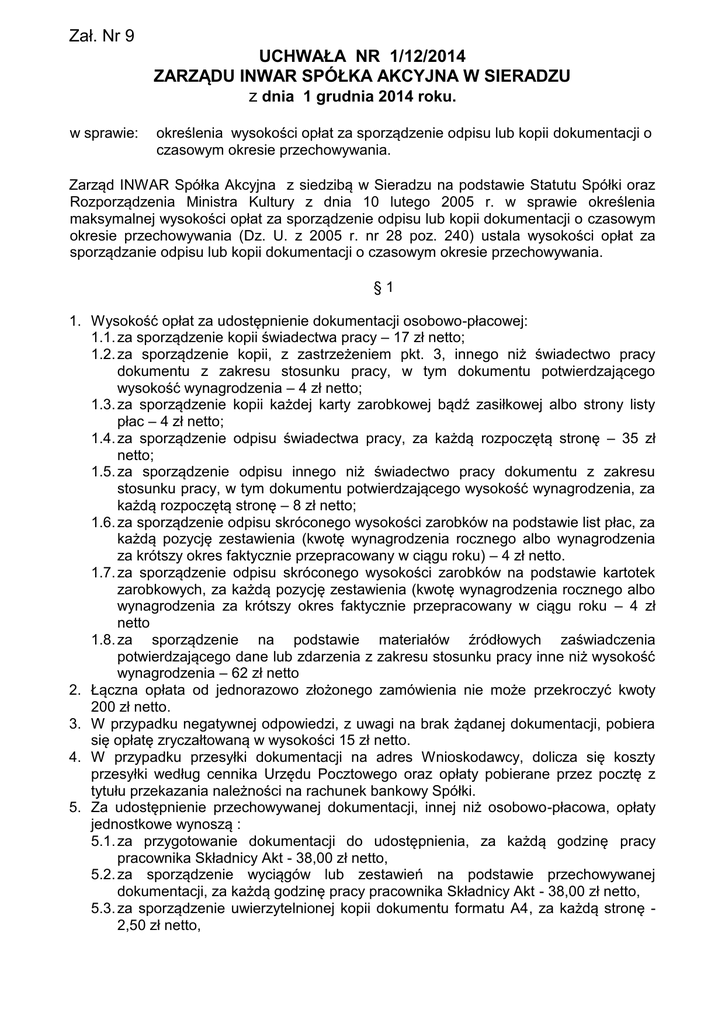 Zał. Nr 9 UCHWAŁA NR 1/12/2014 ZARZĄDU INWAR SPÓŁKA AKCYJNA W SIERADZU z dnia 1 grudnia 2014 roku. w sprawie: określenia wysokości opłat za sporządzenie odpisu lub kopii dokumentacji o czasowym okresie przechowywania. Zarząd INWAR Spółka Akcyjna z siedzibą w Sieradzu na podstawie Statutu Spółki oraz Rozporządzenia Ministra Kultury z dnia 10 lutego 2005 r. w sprawie określenia maksymalnej wysokości opłat za sporządzenie odpisu lub kopii dokumentacji o czasowym okresie przechowywania (Dz. U. z 2005 r. nr 28 poz. 240) ustala wysokości opłat za sporządzanie odpisu lub kopii dokumentacji o czasowym okresie przechowywania. §1 1. Wysokość opłat za udostępnienie dokumentacji osobowo-płacowej: 1.1. za sporządzenie kopii świadectwa pracy – 17 zł netto; 1.2. za sporządzenie kopii, z zastrzeżeniem pkt. 3, innego niż świadectwo pracy dokumentu z zakresu stosunku pracy, w tym dokumentu potwierdzającego wysokość wynagrodzenia – 4 zł netto; 1.3. za sporządzenie kopii każdej karty zarobkowej bądź zasiłkowej albo strony listy płac – 4 zł netto; 1.4. za sporządzenie odpisu świadectwa pracy, za każdą rozpoczętą stronę – 35 zł netto; 1.5. za sporządzenie odpisu innego niż świadectwo pracy dokumentu z zakresu stosunku pracy, w tym dokumentu potwierdzającego wysokość wynagrodzenia, za każdą rozpoczętą stronę – 8 zł netto; 1.6. za sporządzenie odpisu skróconego wysokości zarobków na podstawie list płac, za każdą pozycję zestawienia (kwotę wynagrodzenia rocznego albo wynagrodzenia za krótszy okres faktycznie przepracowany w ciągu roku) – 4 zł netto. 1.7. za sporządzenie odpisu skróconego wysokości zarobków na podstawie kartotek zarobkowych, za każdą pozycję zestawienia (kwotę wynagrodzenia rocznego albo wynagrodzenia za krótszy okres faktycznie przepracowany w ciągu roku – 4 zł netto 1.8. za sporządzenie na podstawie materiałów źródłowych zaświadczenia potwierdzającego dane lub zdarzenia z zakresu stosunku pracy inne niż wysokość wynagrodzenia – 62 zł netto 2. Łączna opłata od jednorazowo złożonego zamówienia nie może przekroczyć kwoty 200 zł netto. 3. W przypadku negatywnej odpowiedzi, z uwagi na brak żądanej dokumentacji, pobiera się opłatę zryczałtowaną w wysokości 15 zł netto. 4. W przypadku przesyłki dokumentacji na adres Wnioskodawcy, dolicza się koszty przesyłki według cennika Urzędu Pocztowego oraz opłaty pobierane przez pocztę z tytułu przekazania należności na rachunek bankowy Spółki. 5. Za udostępnienie przechowywanej dokumentacji, innej niż osobowo-płacowa, opłaty jednostkowe wynoszą : 5.1. za przygotowanie dokumentacji do udostępnienia, za każdą godzinę pracy pracownika Składnicy Akt - 38,00 zł netto, 5.2. za sporządzenie wyciągów lub zestawień na podstawie przechowywanej dokumentacji, za każdą godzinę pracy pracownika Składnicy Akt - 38,00 zł netto, 5.3. za sporządzenie uwierzytelnionej kopii dokumentu formatu A4, za każdą stronę 2,50 zł netto, 6. 7. 8. 9. 5.4. za sporządzenie uwierzytelnionej kopii dokumentu formatu A3, za każdą stronę 3.00 zł netto, 5.5. za sporządzenie uwierzytelnionej kopii dokumentu formatu A2, za każdą stronę 4,50 zł netto, 5.6. za sporządzenie uwierzytelnionej kopii dokumentu formatu A1, za każdą stronę 6.50 zł netto, 5.7. za sporządzenie uwierzytelnionej kopii dokumentu formatu A0, za każdą stronę 10.00 zł netto, W uzasadnionych przypadkach dopuszcza się możliwość obniżenia ceny lub jej umorzenie. Za przygotowanie i wysłanie oryginalnych przechowywanych dokumentów dla osób fizycznych i podmiotów wykazujących interes prawny w ich uzyskaniu, pobiera się każdorazowo opłatę jednostkową zgodnie z ust. 5, pkt. 1). W przypadku braku możliwości wydania części oryginałów dokumentów, za sporządzenie ich uwierzytelnionych kopii, pobiera się opłatę, jak wyżej. Do sumy cen jednostkowych z ust.5, dodaje się koszt poniesionych opłat pocztowych oraz podatek VAT §2 Uchwała wchodzi w życie z dniem 2 stycznia 2015 roku.