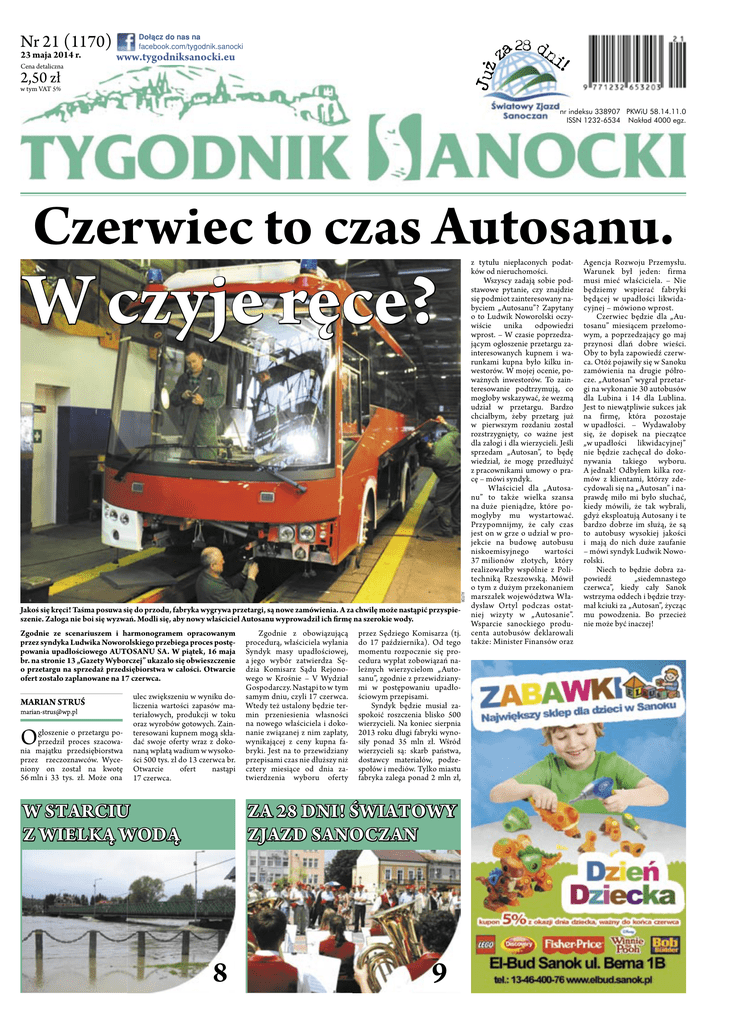 Nr 21 (1170) 23 maja 2014 r. Cena detaliczna Dołącz do nas na facebook.com/tygodnik.sanocki 28 www.tygodniksanocki.eu 2,50 zł w tym VAT 5% nr indeksu 338907 PKWiU 58.14.11.0 ISSN 1232-6534 Nakład 4000 egz. Czerwiec to czas Autosanu. W czyje ręce? AUTOR Jakoś się kręci! Taśma posuwa się do przodu, fabryka wygrywa przetargi, są nowe zamówienia. A za chwilę może nastąpić przyspieszenie. Załoga nie boi się wyzwań. Modli się, aby nowy właściciel Autosanu wyprowadził ich �rmę na szerokie wody. Zgodnie ze scenariuszem i harmonogramem opracowanym przez syndyka Ludwika Noworolskiego przebiega proces postępowania upadłościowego AUTOSANU SA. W piątek, 16 maja br. na stronie 13 „Gazety Wyborczej” ukazało się obwieszczenie o przetargu na sprzedaż przedsiębiorstwa w całości. Otwarcie ofert zostało zaplanowane na 17 czerwca. O głoszenie o przetargu poprzedził proces szacowania majątku przedsiębiorstwa przez rzeczoznawców. Wyceniony on został na kwotę 56 mln i 33 tys. zł. Może ona ulec zwiększeniu w wyniku doliczenia wartości zapasów materiałowych, produkcji w toku oraz wyrobów gotowych. Zainteresowani kupnem mogą składać swoje oferty wraz z dokonaną wpłatą wadium w wysokości 500 tys. zł do 13 czerwca br. Otwarcie ofert nastąpi 17 czerwca. W STARCIU Z WIELKĄ WODĄ Zgodnie z obowiązującą procedurą, właściciela wyłania Syndyk masy upadłościowej, a jego wybór zatwierdza Sędzia Komisarz Sądu Rejonowego w Krośnie – V Wydział Gospodarczy. Nastąpi to w tym samym dniu, czyli 17 czerwca. Wtedy też ustalony będzie termin przeniesienia własności na nowego właściciela i dokonanie związanej z nim zapłaty, wynikającej z ceny kupna fabryki. Jest na to przewidziany przepisami czas nie dłuższy niż cztery miesiące od dnia zatwierdzenia wyboru oferty przez Sędziego Komisarza (tj. do 17 października). Od tego momentu rozpocznie się procedura wypłat zobowiązań należnych wierzycielom „Autosanu”, zgodnie z przewidzianymi w postępowaniu upadłościowym przepisami. Syndyk będzie musiał zaspokoić roszczenia blisko 500 wierzycieli. Na koniec sierpnia 2013 roku długi fabryki wynosiły ponad 35 mln zł. Wśród wierzycieli są: skarb państwa, dostawcy materiałów, podzespołów i mediów. Tylko miastu fabryka zalega ponad 2 mln zł, ZA 28 DNI! ŚWIATOWY ZJAZD SANOCZAN 8 9 z tytułu niepłaconych podatków od nieruchomości. Wszyscy zadają sobie podstawowe pytanie, czy znajdzie się podmiot zainteresowany nabyciem „Autosanu”? Zapytany o to Ludwik Noworolski oczywiście unika odpowiedzi wprost. – W czasie poprzedzającym ogłoszenie przetargu zainteresowanych kupnem i warunkami kupna było kilku inwestorów. W mojej ocenie, poważnych inwestorów. To zainteresowanie podtrzymują, co mogłoby wskazywać, że wezmą udział w przetargu. Bardzo chciałbym, żeby przetarg już w pierwszym rozdaniu został rozstrzygnięty, co ważne jest dla załogi i dla wierzycieli. Jeśli sprzedam „Autosan”, to będę wiedział, że mogę przedłużyć z pracownikami umowy o pracę – mówi syndyk. Właściciel dla „Autosanu” to także wielka szansa na duże pieniądze, które pomogłyby mu wystartować. Przypomnijmy, że cały czas jest on w grze o udział w projekcie na budowę autobusu niskoemisyjnego wartości 37 milionów złotych, który realizowałby wspólnie z Politechniką Rzeszowską. Mówił o tym z dużym przekonaniem marszałek województwa Władysław Ortyl podczas ostatniej wizyty w „Autosanie”. Wsparcie sanockiego producenta autobusów deklarowali także: Minister Finansów oraz Agencja Rozwoju Przemysłu. Warunek był jeden: firma musi mieć właściciela. – Nie będziemy wspierać fabryki będącej w upadłości likwidacyjnej – mówiono wprost. Czerwiec będzie dla „Autosanu” miesiącem przełomowym, a poprzedzający go maj przynosi dlań dobre wieści. Oby to była zapowiedź czerwca. Otóż pojawiły się w Sanoku zamówienia na drugie półrocze. „Autosan” wygrał przetargi na wykonanie 30 autobusów dla Lubina i 14 dla Lublina. Jest to niewątpliwie sukces jak na firmę, która pozostaje w upadłości. – Wydawałoby się, że dopisek na pieczątce „w upadłości likwidacyjnej” nie będzie zachęcał do dokonywania takiego wyboru. A jednak! Odbyłem kilka rozmów z klientami, którzy zdecydowali się na „Autosan” i naprawdę miło mi było słuchać, kiedy mówili, że tak wybrali, gdyż eksploatują Autosany i te bardzo dobrze im służą, że są to autobusy wysokiej jakości i mają do nich duże zaufanie – mówi syndyk Ludwik Noworolski. Niech to będzie dobra zapowiedź „siedemnastego czerwca”, kiedy cały Sanok wstrzyma oddech i będzie trzymał kciuki za „Autosan”, życząc mu powodzenia. Bo przecież nie może być inaczej! 2 Z TYGODNIA NA TYDZIEŃ NOTOWANIA Polityczna agitacja na Rynku Oto kolejny komunikat z tygodni(k)owej giełdy: Przed wyborami do Parlamentu Europejskiego przeżywamy istny najazd znanych polityków. W ostatni weekend w Sanoku goGANIMY: Władze Powiatu za to, że ciągle nie potra�ą zagrać ścił Antoni Macierewicz z PiS-u, a w środę pojawili się Jarosław w jednej drużynie z Miastem, nawet wtedy, gdy gra idzie o dużą Gowin z Polski Razem i grupa przedstawicieli SLD, na czele z sestawkę. Okazją do wspólnego występu było zaproszenie przez kretarzem generalnym Krzysztofem Gawkowskim. starostę Sebastiana Niżnika nowego wiceministra sportu Bogdana Uljasza do odwiedzenia Powiatu Sanockiego. Pan minister przyjechał, zwiedził niektóre obiekty sportowe w Zagórzu i Sanoku, spotkał się z przedstawicielami środowiska sportowego, z burmistrzem Zagórza i grupą radnych powiatowych. W spotkaniu nie uczestniczyli niezaproszeni do udziału w nim przedstawiciele władz miasta Sanoka, mimo iż burmistrz Wojciech Blecharczyk, wiedząc o planowanym przyjeździe pana ministra, o takie spotkanie bezpośrednio w ministerstwie zabiegał. A 