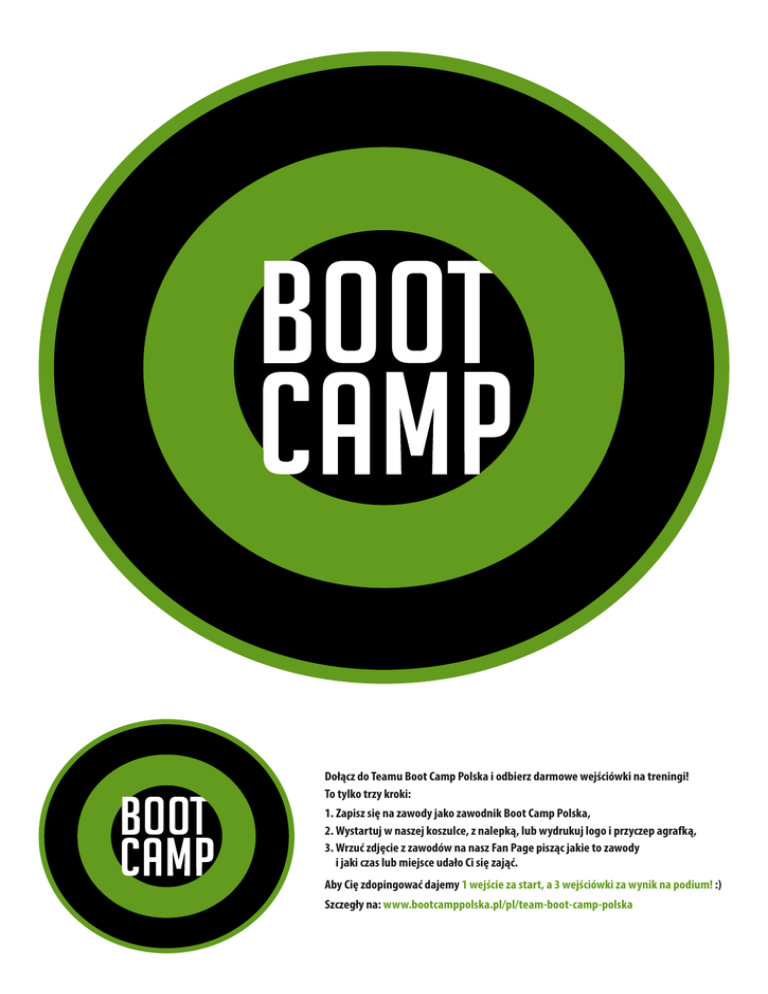Dołącz do Teamu Boot Camp Polska i odbierz darmowe wejściówki na treningi! To tylko trzy kroki: 1. Zapisz się na zawody jako zawodnik Boot Camp Polska, 2. Wystartuj w naszej koszulce, z nalepką, lub wydrukuj logo i przyczep agrafką, 3. Wrzuć zdjęcie z zawodów na nasz Fan Page pisząc jakie to zawody i jaki czas lub miejsce udało Ci się zająć. Aby Cię zdopingować dajemy 1 wejście za start, a 3 wejściówki za wynik na podium! :) Szczegły na: www.bootcamppolska.pl/pl/team-boot-camp-polska