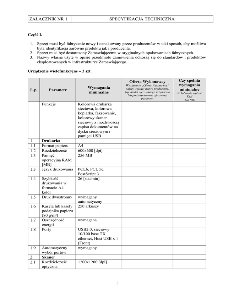 ZAŁĄCZNIK NR 1 SPECYFIKACJA TECHNICZNA Część I. 1. Sprzęt musi być fabrycznie nowy i oznakowany przez producentów w taki sposób, aby możliwa była identyfikacja zarówno produktu jak i producenta. 2. Sprzęt musi być dostarczony Zamawiającemu w oryginalnych opakowaniach fabrycznych. 3. Nazwy własne użyte w opisie przedmiotu zamówienia odnoszą się do standardów i produktów eksploatowanych w infrastrukturze Zamawiającego. Urządzenie wielofunkcyjne – 3 szt. Oferta Wykonawcy L.p. Parametr Funkcje 1. 1.1 1.2 1.3 1.3 1.4 1.5 1.6 1.7 1.8 1.9 2. 2.1 Drukarka Format papieru Rozdzielczość Pamięć operacyjna RAM [MB] Język drukowania Szybkość drukowania w formacie A4 kolor Druk dwustronny Kaseta lub kasety podajnika papieru (80 g/m²) Oszczędność energii Porty Automatyczny wybór portów Skaner Rozdzielczość optyczna W kolumnie „Oferta Wykonawcy” należy wpisać: nazwę producenta, typ, model oferowanego urządzenia lub podzespołu oraz oferowany parametr. Wymagania minimalne Kolorowa drukarka sieciowa, kolorowa kopiarka, faksowanie, kolorowy skaner sieciowy z możliwością zapisu dokumentów na dysku sieciowym i pamięci USB A4 600x600 [dpi] 256 MB PCL6, PCL 5c, PostScript 3 26 [str./min] wymagany automatyczny 250 arkuszy wymagana USB2.0, sieciowy 10/100 base TX ethernet, Host USB x 1 (Front) wymagany 1200x1200 [dpi] 1 Czy spełnia wymagania minimalne W kolumnie wpisać TAK lub NIE 2.3 Podawanie dokumentów (podajnik RADF) na 50 arkuszy Format 2.4 Skanowanie do: 3. 3.1 3.2 5.6 Kopiowanie Rozdzielczość Szybkość kopiowania Zoom FAX Złącza Pozostałe parametry Kable przyłączeniowe Normatywny cykl pracy wymagany Sterowniki Gramatura papieru Panel sterujący z wyświetlaczem LCD Zasilanie drukarki 5.7 Głośność 5.8 Dokumentacja 5.9 Gwarancja 2.2 3.3 4. 4.1 5. 5.1 5.2 5.3 5.4 5.5 tak PDF, JPEG, XPS, TWAIN FTP, HTTP, pamięci USB, e-mail, do folderu (CIFS) 600x600 [dpi] 30 [str./min] 30-300% RJ11 x 2 (Line/Tel) USB, RJ45; każdy 3 m (wydajność miesięczna) [stron A4] 40 000 zgodne z Win 7, Win10 Od 60 do 220 g/m2 Opisy w języku polskim 230V, 50 Hz, kabel zasilający 3 m; podczas pracy: max. 55 dB(A) podręcznik użytkowania w języku polskim, sterowniki i narzędzia programowe 36 miesięcy, z możliwością zgłaszania awarii 5 dni w tygodniu, tj. poniedziałek – piątek z wyłączeniem dni ustawowo wolnych od pracy, w godz. 7-18, z czasem naprawy w ciągu 10 dni roboczych od przyjęcia zgłoszenia. Wykonawca na własny koszt zapewni transport urządzeń do i z serwisu 2 Drukarka mono A4 – 1 sztuka Oferta Wykonawcy L.p. 1 2 3 4 5 6 7 8 9 10 11 12 13 14 15 Parametr Drukarka laserowa mono Format papieru Rozdzielczość Pamięć operacyjna RAM [MB] Język drukowania Emulacja czcionki Szybkość drukowania w formacie A4 Druk dwustronny Kaseta lub kasety podajnika papieru (80 g/m²) Oszczędność energii Gramatura papieru Interfejs Zasilanie Kable przyłączeniowe Miesięczne obciążenie (średnie) Kompatybilność z systemami operacyjnymi W kolumnie „Oferta Wykonawcy” należy wpisać: nazwę producenta, typ, model oferowanego urządzenia lub podzespołu oraz oferowany parametr. Wymagania minimalne A4 1200 x 1200[dpi] 256 MB PCL5e, PCXL, Postscript 3 Emulation, XPS, Epson FX, IBM PPR Epson FX, IBM-PPR 47 [str./min] wymagany automatyczny 500 arkuszy wymagana Od 64 do 253 g/m2 10/100/1000 baseT, High Speed USB x 2 (1x type A & 1 x type B 230V, 50 Hz USB, RJ45, zasilający; każdy 3 m 20 000 stron/miesiąc Windows 10 (32-bit & 64-bit) 3 Czy spełnia wymagania minimalne W kolumnie wpisać TAK lub NIE 16 Gwarancja 36 miesięcy, z możliwością zgłaszania awarii 5 dni w tygodniu, tj. poniedziałek – piątek z wyłączeniem dni ustawowo wolnych od pracy, w godz. 7-18, z czasem naprawy w ciągu 10 dni roboczych od przyjęcia zgłoszenia. Wykonawca na własny koszt zapewni transport urządzeń do i z serwisu Część II. Oprogramowanie Wykonawca dostarczy następujące oprogramowanie (licencje/sublicencje): 1) CorelDRAW Graphics Suite X8 PL - 1 szt, 2) Adobe Acrobat DC 2015 Pro PL WIN GOV. – 2 szt. 4