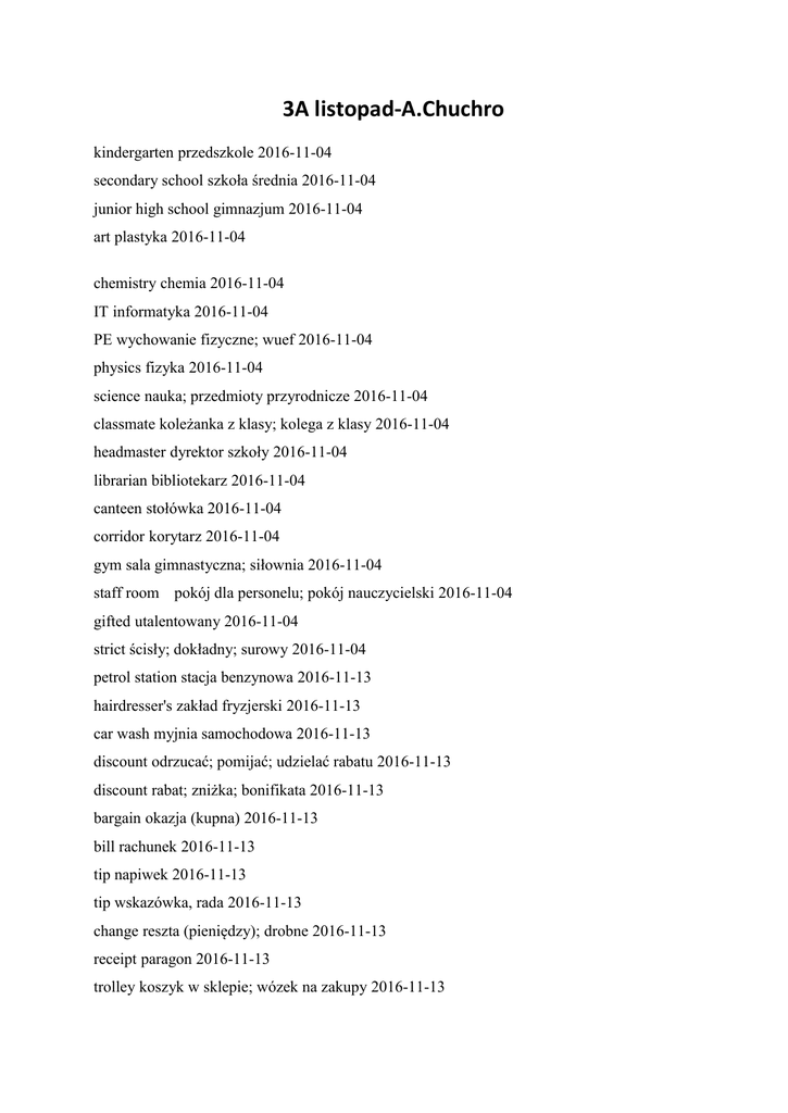 3A listopad-A.Chuchro kindergarten przedszkole 2016-11-04 secondary school szkoła średnia 2016-11-04 junior high school gimnazjum 2016-11-04 art plastyka 2016-11-04 chemistry chemia 2016-11-04 IT informatyka 2016-11-04 PE wychowanie fizyczne; wuef 2016-11-04 physics fizyka 2016-11-04 science nauka; przedmioty przyrodnicze 2016-11-04 classmate koleżanka z klasy; kolega z klasy 2016-11-04 headmaster dyrektor szkoły 2016-11-04 librarian bibliotekarz 2016-11-04 canteen stołówka 2016-11-04 corridor korytarz 2016-11-04 gym sala gimnastyczna; siłownia 2016-11-04 staff room pokój dla personelu; pokój nauczycielski 2016-11-04 gifted utalentowany 2016-11-04 strict ścisły; dokładny; surowy 2016-11-04 petrol station stacja benzynowa 2016-11-13 hairdresser's zakład fryzjerski 2016-11-13 car wash myjnia samochodowa 2016-11-13 discount odrzucać; pomijać; udzielać rabatu 2016-11-13 discount rabat; zniżka; bonifikata 2016-11-13 bargain okazja (kupna) 2016-11-13 bill rachunek 2016-11-13 tip napiwek 2016-11-13 tip wskazówka, rada 2016-11-13 change reszta (pieniędzy); drobne 2016-11-13 receipt paragon 2016-11-13 trolley koszyk w sklepie; wózek na zakupy 2016-11-13 handmade ręcznie zrobiony (wykonany); ręczna robota 2016-11-13 queue kolejka 2016-11-13 queue stać w kolejce 2016-11-13 missing zaginiony; brakujący 2016-11-13 complaint skarga; narzekanie; reklamacja 2016-11-13 broken-down wyczerpany; schorowany; załamany; uszkodzony; zepsuty 2016-11-13 price cena 2016-11-13 delayed opóźniony 2016-11-19 departure odjazd; wyjazd; odlot 2016-11-19 cancelled odwołany; anulowany 2016-11-19 gate brama 2016-11-19 platform peron 2016-11-19 return ticket bilet powrotny 2016-11-19 boarding pass karta pokładowa 2016-11-19 book bukować; rezerwować 2016-11-19 disgusting obrzydliwy 2016-11-19 excursion wycieczka 2016-11-19 miss spóźnić się na; nie trafić; tęsknić 2016-11-19 souvenir pamiątka 2016-11-19 take off startować (o samolocie) 2016-11-19 take off zdjąć, rozebrać (ubranie) 2016-11-19 allow pozwalać (coś robić); zezwalać; dopuszczać 2016-11-26 comb czesać się 2016-11-26 downstairs na dół po schodach; na dole 2016-11-26 wall ściana; mur 2016-11-26 carpet dywan 2016-11-26 rug dywanik 2016-11-26 attic poddasze; strych 2016-11-26 curtain firanka; zasłona; kurtyna 2016-11-26 armchair fotel 2016-11-26 cosy przytulny 2016-11-26 bungalow domek parterowy 2016-11-26 deposit depozyt; zaliczka; zadatek 2016-11-26 mansion rezydencja 2016-11-26 blinds żaluzje 2016-11-26 windowsill parapet 2016-11-26 mirror lustro 2016-11-26