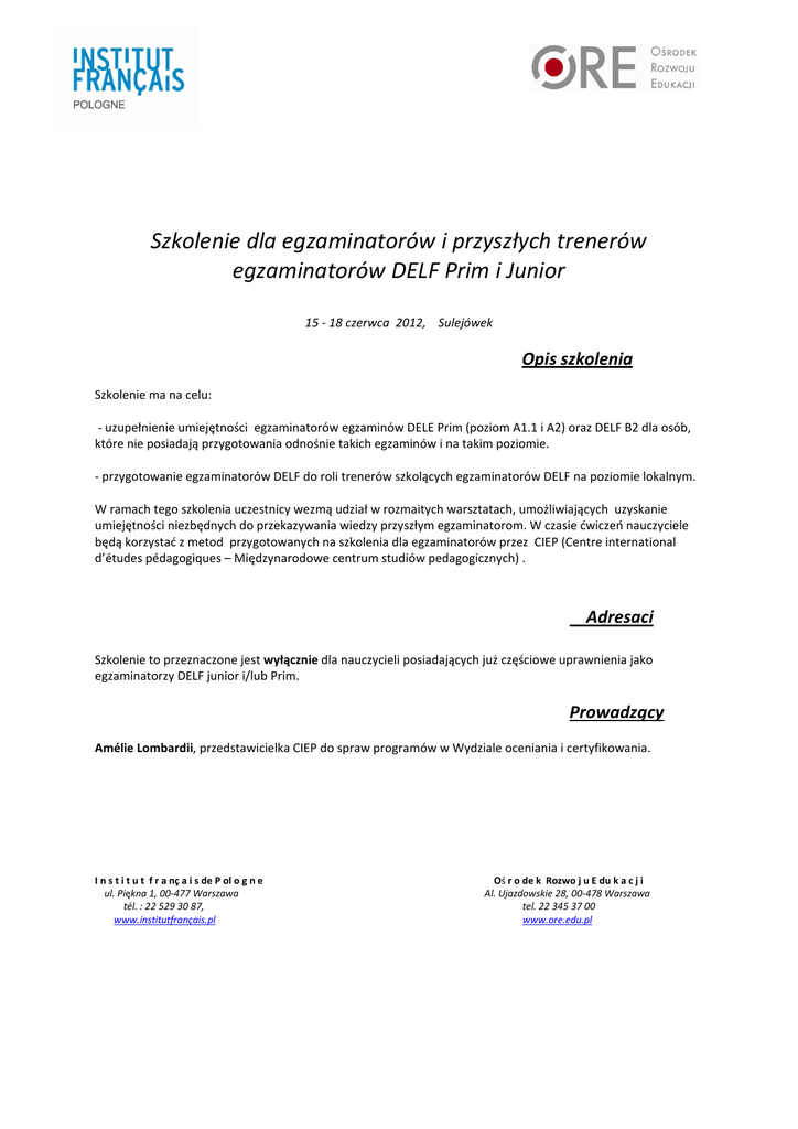 Szkolenie dla egzaminatorów i przyszłych trenerów egzaminatorów DELF Prim i Junior 15 - 18 czerwca 2012, Sulejówek Opis szkolenia Szkolenie ma na celu: - uzupełnienie umiejętności egzaminatorów egzaminów DELE Prim (poziom A1.1 i A2) oraz DELF B2 dla osób, które nie posiadają przygotowania odnośnie takich egzaminów i na takim poziomie. - przygotowanie egzaminatorów DELF do roli trenerów szkolących egzaminatorów DELF na poziomie lokalnym. W ramach tego szkolenia uczestnicy wezmą udział w rozmaitych warsztatach, umożliwiających uzyskanie umiejętności niezbędnych do przekazywania wiedzy przyszłym egzaminatorom. W czasie ćwiczeń nauczyciele będą korzystać z metod przygotowanych na szkolenia dla egzaminatorów przez CIEP (Centre international d’études pédagogiques – Międzynarodowe centrum studiów pedagogicznych) . Adresaci Szkolenie to przeznaczone jest wyłącznie dla nauczycieli posiadających już częściowe uprawnienia jako egzaminatorzy DELF junior i/lub Prim. Prowadzący Amélie Lombardii, przedstawicielka CIEP do spraw programów w Wydziale oceniania i certyfikowania. I n s t i t u t f r a nç a i s de P ol o g n e ul. Piękna 1, 00-477 Warszawa tél. : 22 529 30 87, www.institutfrançais.pl Oś r o de k Rozwo j u E du k a c j i Al. Ujazdowskie 28, 00-478 Warszawa tel. 22 345 37 00 www.ore.edu.pl Cele główne Uczestnicy szkolenia powinni umieć: - poprawiać i sprawdzać egzaminy DELF Prim i Junior - przygotować do takiej funkcji innych nauczycieli. Cele szczegółowe Umiejętności i kwalifikacje Egzaminator DELF- DALF Trener egzaminatorów DELF Egzaminator oceniający DELF Scolaire/Junior, Tous publics i Pro Szkoleniowiec przygotowujący do funkcji egzaminatora DELF innych nauczycieli Cele szczegółowe • Prezentacja egzaminów DELF-DALF oraz określenie roli szkoleniowca. • Prezentacja nowych egzaminów: DELF PRIM i DELF PRO. • Uaktualnienie informacji odnośnie Europejskiego systemu opisu kształcenia językowego i poziomów językowych. • Definicja poziomu językowego, wskazówki i zadania. • Prezentacja głównych zasad oceniania w czasie egzaminów DELF –DALF: filozofia DELF –DALF, pozytywne ocenianie, założenia metodyczne, kryteria… • Zrozumienie założeń i przebiegu ustnego DELF. • Analiza tabeli służącej do ewaluacji egzaminu. • Prezentacja standardów obowiązujących egzaminatorów. • Zapewnienie obiektywnej oceny egzaminu ustnego. • Analiza opisu poziomów językowych. • Ocenianie egzaminu pisemnego i ustnego. • Porównanie i ujednolicenie ocen. • Rozwiązywanie trudnych przypadków. • Prezentacja narzędzi, ćwiczeń i zasobów przydatnych w pracy trenerów. • Ustalenie kryteriów jakie spełnić musi dobre szkolenie. • Przygotowanie vademecum trenera DELF. • Trudności związane z organizacją szkolenia dla przyszłych egzaminatorów. • Charakterystyka przyszłych egzaminatorów. • Przygotowanie programu szkolenia. • Praktyczne ćwiczenia w jaki sposób prowadzić zajęcia jako trener. Program Piątek 15 czerwca 13.00 – 14.00 14.00 – 16.00 Obiad Powitanie uczestników. Prezentacja działalności CIEP oraz egzaminów DELFDALF oraz oczekiwań związanych z rolą trenera. Europejski system opisu kształcenia językowego (wykorzystywany w trakcie dalszych zajęć) - Aktualizacja wiedzy. - W jaki sposób poprowadzić zajęcia o Europejskim systemie opisu kształcenia językowego i jakie dokumenty do tego wykorzystać? 16.00 – 16.15 16.15 – 18.15 18.15 – 19.00 Przerwa na kawę DELF Prim poziom A1.1 - Analiza opisu poziomu A1.1. - Analiza egzaminu (rozumienie ze słuchu, rozumienie tekstu pisanego, wypowiedź ustna i wypowiedź pisemna). - Analiza tabeli służącej do ewaluacji. - Ocena wypowiedzi pisemnej i ustnej: porównanie i ujednolicenie ocen. Kolacja Sobota 16 czerwca 7.30 – 8.30 8.30 -10.30 10.30 – 11.00 11.00 – 12.30 12.30 – 13.30 13.30 – 15.30 Śniadanie DELF Prim poziom A1.1 (ciąg dalszy) - Porównanie opisu A1.1 i A1. - Ocena wypowiedzi pisemnej i ustnej: porównanie i ujednolicenie ocen. Przerwa na kawę DELF Prim poziom A2 - Analiza opisu poziomu A2. - Ocena wypowiedzi pisemnej i ustnej: porównanie i ujednolicenie ocen. Obiad DELF Prim poziom A2 (ciąg dalszy) Klasyfikacja zadań egzaminu DELF Junior i Tous publics - Aktualizacja wiedzy. - Jak rozumieć zadania? 15.30 – 16.00 16.00 – 17.30 18.00 -19.00 Przerwa na kawę Zadania grupowe - Organizowanie zadań grupowych. - Ocenianie zadań grupowych: poprawianie i korygowanie rozumienia tekstu pisemnego – poziom B1 i rozumienia ze słuchu – poziom B2. Kolacja Niedziela 17 czerwca 7.30 – 8.30 8.30 -10.30 10.30 – 11.00 11.00 – 12.30 12.30 – 13.30 13.30 – 15.30 15.30 – 16.00 16.00 – 17.30 18.00 – 19.00 Śniadanie Ocena wypowiedzi ustnej - Analiza tabeli oceny wypowiedzi ustnej - Analiza fragmentów egzaminów ustnych DELF. - Rola egzaminatora (dobre praktyki). Przerwa na kawę Ocena wypowiedzi ustnej (ciąg dalszy) - Przygotowanie do egzaminu ustnego od strony praktycznej (zarządzanie czasem, dokumenty). - Ocena wypowiedzi ustnej na różnych poziomach językowych. Obiad Ocena wypowiedzi ustnej (ciąg dalszy) Przerwa na kawę Ocena wypowiedzi pisemnej - Analiza tabeli oceny wypowiedzi pisemnej (A1 i A2): rozumienie opisu każdego poziomu językowego i zagadnień właściwych dla każdego poziomu. - Praktyczna analiza przypadków z poziomu A1 i A2. - Ocena wypowiedzi pisemnej. Kolacja Poniedziałek 18 czerwca 7.30 – 8.15 8.15 -10.15 10.15 – 10.30 10.30 – 12.15 12.15 – 13.00 13.00 – 15.00 Śniadanie Ocena wypowiedzi pisemnej (ciąg dalszy): - Rozumienie opisu wypowiedzi pisemnej (B1 i B2) i zagadnień właściwych dla każdego poziomu. - Praktyczna analiza przypadków z poziomu B1 i B2. - Ocena wypowiedzi pisemnej. Przerwa na kawę Przygotowanie szkolenia na poziomie lokalnym - Narzędzia i zasoby, jakimi mogą dysponować trenerzy. - Trudności jakie mogą pojawić się 
