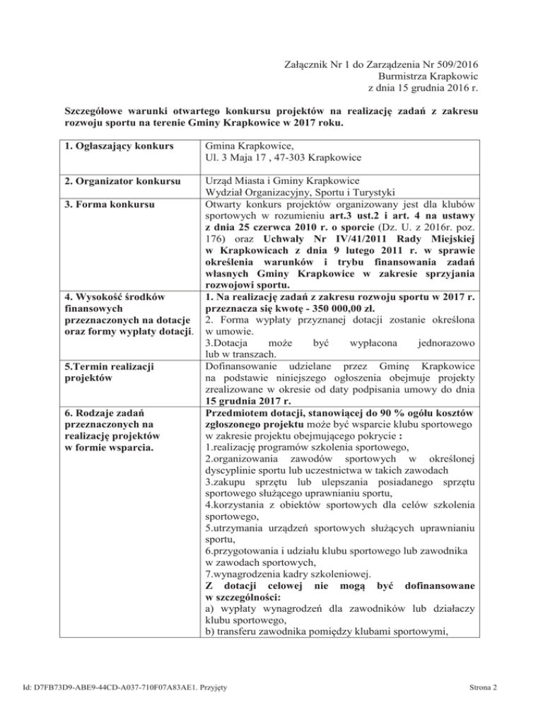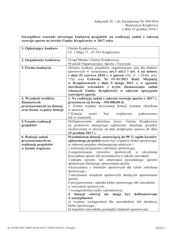 Zał cznik Nr 1 do Zarz dzenia Nr 509/2016 Burmistrza Krapkowic z dnia 15 grudnia 2016 r. Szczegółowe warunki otwartego konkursu projektów na realizacj zada rozwoju sportu na terenie Gminy Krapkowice w 2017 roku. z zakresu 1. Ogłaszaj cy konkurs Gmina Krapkowice, Ul. 3 Maja 17 , 47-303 Krapkowice 2. Organizator konkursu Urz d Miasta i Gminy Krapkowice Wydział Organizacyjny, Sportu i Turystyki Otwarty konkurs projektów organizowany jest dla klubów sportowych w rozumieniu art.3 ust.2 i art. 4 na ustawy z dnia 25 czerwca 2010 r. o sporcie (Dz. U. z 2016r. poz. 176) oraz Uchwały Nr IV/41/2011 Rady Miejskiej w Krapkowicach z dnia 9 lutego 2011 r. w sprawie okre lenia warunków i trybu finansowania zada własnych Gminy Krapkowice w zakresie sprzyjania rozwojowi sportu. 1. Na realizacj zada z zakresu rozwoju sportu w 2017 r. przeznacza si kwot - 350 000,00 zł. 2. Forma wypłaty przyznanej dotacji zostanie okre lona w umowie. 3.Dotacja mo e by wypłacona jednorazowo lub w transzach. Dofinansowanie udzielane przez Gmin Krapkowice na podstawie niniejszego ogłoszenia obejmuje projekty zrealizowane w okresie od daty podpisania umowy do dnia 15 grudnia 2017 r. Przedmiotem dotacji, stanowi cej do 90 % ogółu kosztów zgłoszonego projektu mo e by wsparcie klubu sportowego w zakresie projektu obejmuj cego pokrycie : 1.realizacj programów szkolenia sportowego, 2.organizowania zawodów sportowych w okre lonej dyscyplinie sportu lub uczestnictwa w takich zawodach 3.zakupu sprz tu lub ulepszania posiadanego sprz tu sportowego słu cego uprawnianiu sportu, 4.korzystania z obiektów sportowych dla celów szkolenia sportowego, 5.utrzymania urz dze sportowych słu cych uprawnianiu sportu, 6.przygotowania i udziału klubu sportowego lub zawodnika w zawodach sportowych, 7.wynagrodzenia kadry szkoleniowej. Z dotacji celowej nie mog by dofinansowane w szczególno ci: a) wypłaty wynagrodze dla zawodników lub działaczy klubu sportowego, b) transferu zawodnika pomi dzy klubami sportowymi, 3. Forma konkursu 4. Wysoko rodków finansowych przeznaczonych na dotacje oraz formy wypłaty dotacji. 5.Termin realizacji projektów 6. Rodzaje zada przeznaczonych na realizacj projektów w formie wsparcia. Id: D7FB73D9-ABE9-44CD-A037-710F07A83AE1. Przyjęty Strona 2 c) zapłaty kar, mandatów i innych opłat sankcyjnych nało onych na klub sportowy lub osoby w nim zrzeszone, d) zobowi zania klubu sportowego z tytułu zaci gni tej po yczki, kredytu lub wykupu papierów warto ciowych oraz kosztów obsługi zadłu enia, koszty które wnioskodawca poniósł na realizacj przedsi wzi cia przed zawarciem umowy o udzielnie pomocy. 7. Warunki finansowe jakie powinien spełnia projekt i obj te nim przedsi wzi cia 8.Warunki uczestnictwa w konkursie wnioskodawcy (warunki merytoryczne) 1. Wymagany jest co najmniej 10% wkład własny klubu sportowego, rozumiany jako potwierdzony dokumentami finansowo-ksi gowymi wkład finansowy pochodz cy z innego ni bud et Gminy Krapkowice ródła finansowania. 2. W przypadku własnego wkładu finansowego pochodz cego z innego ni rodki klubu ródła dofinansowania, nale y fakt ten wykaza dokumentem potwierdzaj cym wysoko zabezpieczonej kwoty dofinansowania z imiennym oznaczeniem nazwy projektu (np. umowa, dokument potwierdzaj cy wysoko rodków przeznaczonych na realizacj projektu wystawiony przez podmiot współuczestnicz cy w finansowaniu projektu lub o wiadczenie klubu sportowego o zło eniu wniosku do innego podmiotu celem zabezpieczenia wkładu własnego z innego ródła ni bud et Gminy Krapkowice). 3. Finansowy wkład własny klubu sportowego winien zosta udokumentowany na rachunku klubu wskazanym do przekazania dotacji lub zaewidencjonowany w rejestrach kasowych. W przypadku otrzymania rodków, których mowa w ust. 2, podstaw udokumentowania jest umowa. 4. W roku bud etowym klub sportowy w trybie niniejszego ogłoszenia o konkursie mo e otrzyma z bud etu Gminy Krapkowice dotacj na wi cej ni jeden projekt pod warunkiem, e ka dy z projektów obj ty jest oddzielnym wnioskiem, umow , dotacj . Oferty na realizacj projektów w ramach konkursu mog składa kluby sportowe, o których mowa art.3 ust.2 i art. 4 ustawy z dnia 25 czerwca 2010 r. o sporcie (Dz. U. z 2016r. poz. 176) nie nale ce do sektora finansów publicznych i niedziałaj ce w celu osi gni cia zysku, które na terenie Gminy Krapkowice prowadz działalno sportow . 9. Miejsce w którym mo na zapozna si ze szczegółowymi warunkami konkursu i materiałami informacyjnymi o przedmiocie konkursu Urz d Miasta i Gminy Krapkowice ul. 3 Maja 17 , 47-303 Krapkowice Wydział Organizacyjny, Sportu i Turystyki (pokój nr 18) , tel. 77/ 44 66 822 lub w Biuletynie Informacji Publicznej na stronie internetowej www.bip.krapkowice.pl (zakładka organizacje pozarz dowe) 10. Miejsce, sposób i termin składania ofert Oferty projektów nale y zło y : 1. osobi cie lub za pomoc poczty na adres: Urz d Miasta Id: D7FB73D9-ABE9-44CD-A037-710F07A83AE1. Przyjęty Strona 3 i Gminy Krapkowice, ul. 3 Maja 17, 47-303 Krapkowice (sekretariat) do dnia 09 stycznia 2017 r. do godz. 17:00, 2. na formularzu stanowi cym zał cznik nr 1 do Uchwały Nr IV/41/2011 Rady Miejskiej w Krapkowicach z dnia 9 lutego 2011 r. w sprawie okre lania warunków i trybu finansowania zada własnych Gminy Krapkowice w zakresie sprzyjania rozwojowi sportu (Dz. Urz. Woj. Opolskiego z 2011 r. Nr 32, pó n. 411), 11.Wymogi formalne 12. Tryb rozpatrywania ofert Do wniosku nale y doł czy : 1. statut klubu lub inny dokument okre laj cy przedmiot działalno ci klubu sportowego; 2. aktualny odpis z rejestru lub odpowiednio wyci g ewidencji lub inne dokumenty potwierdzaj ce status prawny klubu sportowego i umocowanie osób go reprezentuj cych; 3. licencj lub inny dokument uprawiaj cy do udziału w rozgrywkach i zawodach odpowiedniego polskiego zwi zku sportowego lub podmiotu działaj cego w jego imieniu; 4. sprawozdanie merytoryczne za 2016 r. lub za okres działalno ci dla podmiotów nowopowstałych;