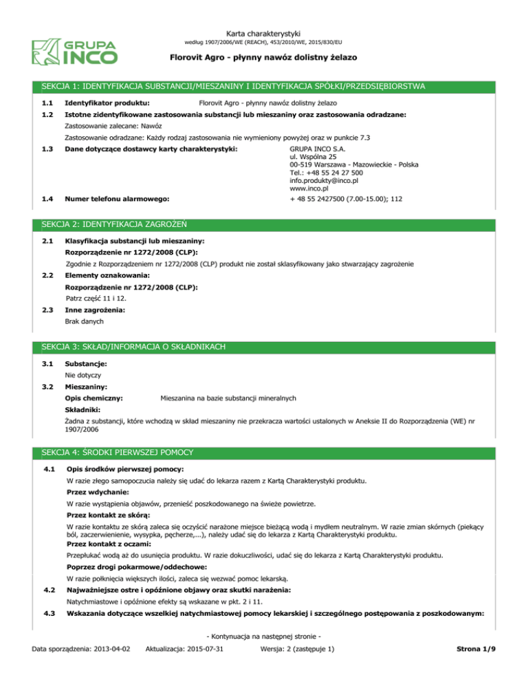 Karta charakterystyki według 1907/2006/WE (REACH), 453/2010/WE, 2015/830/EU Florovit Agro - płynny nawóz dolistny żelazo SEKCJA 1: IDENTYFIKACJA SUBSTANCJI/MIESZANINY I IDENTYFIKACJA SPÓŁKI/PRZEDSIĘBIORSTWA 1.1 Identyfikator produktu: Florovit Agro - płynny nawóz dolistny żelazo 1.2 Istotne zidentyfikowane zastosowania substancji lub mieszaniny oraz zastosowania odradzane: Zastosowanie zalecane: Nawóz Zastosowanie odradzane: Każdy rodzaj zastosowania nie wymieniony powyżej oraz w punkcie 7.3 1.3 Dane dotyczące dostawcy karty charakterystyki: GRUPA INCO S.A. ul. Wspólna 25 00-519 Warszawa - Mazowieckie - Polska Tel.: +48 55 24 27 500 [email protected] www.inco.pl 1.4 Numer telefonu alarmowego: + 48 55 2427500 (7.00-15.00); 112 SEKCJA 2: IDENTYFIKACJA ZAGROŻEŃ 2.1 Klasyfikacja substancji lub mieszaniny: Rozporządzenie nr 1272/2008 (CLP): Zgodnie z Rozporządzeniem nr 1272/2008 (CLP) produkt nie został sklasyfikowany jako stwarzający zagrożenie 2.2 Elementy oznakowania: Rozporządzenie nr 1272/2008 (CLP): Patrz część 11 i 12. 2.3 Inne zagrożenia: Brak danych SEKCJA 3: SKŁAD/INFORMACJA O SKŁADNIKACH 3.1 Substancje: Nie dotyczy 3.2 Mieszaniny: Opis chemiczny: Mieszanina na bazie substancji mineralnych Składniki: Żadna z substancji, które wchodzą w skład mieszaniny nie przekracza wartości ustalonych w Aneksie II do Rozporządzenia (WE) nr 1907/2006 SEKCJA 4: ŚRODKI PIERWSZEJ POMOCY 4.1 Opis środków pierwszej pomocy: W razie złego samopoczucia należy się udać do lekarza razem z Kartą Charakterystyki produktu. Przez wdychanie: W razie wystąpienia objawów, przenieść poszkodowanego na świeże powietrze. Przez kontakt ze skórą: W razie kontaktu ze skórą zaleca się oczyścić narażone miejsce bieżącą wodą i mydłem neutralnym. W razie zmian skórnych (piekący ból, zaczerwienienie, wysypka, pęcherze,...), należy udać się do lekarza z Kartą Charakterystyki produktu. Przez kontakt z oczami: Przepłukać wodą aż do usunięcia produktu. W razie dokuczliwości, udać się do lekarza z Kartą Charakterystyki produktu. Poprzez drogi pokarmowe/oddechowe: W razie połknięcia większych ilości, zaleca się wezwać pomoc lekarską. 4.2 Najważniejsze ostre i opóźnione objawy oraz skutki narażenia: Natychmiastowe i opóźnione efekty są wskazane w pkt. 2 i 11. 4.3 Wskazania dotyczące wszelkiej natychmiastowej pomocy lekarskiej i szczególnego postępowania z poszkodowanym: - Kontynuacja na następnej stronie - Data sporządzenia: 2013-04-02 Aktualizacja: 2015-07-31 Wersja: 2 (zastępuje 1) Strona 1/9 Karta charakterystyki według 1907/2006/WE (REACH), 453/2010/WE, 2015/830/EU Florovit Agro - płynny nawóz dolistny żelazo SEKCJA 4: ŚRODKI PIERWSZEJ POMOCY (Ciąg dalszy) Brak danych SEKCJA 5: POSTĘPOWANIE W PRZYPADKU POŻARU 5.1 Środki gaśnicze: 5.2 Produkt niepalny, dzięki swoim właściwościom w normalnych warunkach postępowania, magazynowania i użytkowania nie stwarza zagrożenia pożarem. W razie zapalenia się produktu na skutek niewłaściwego postępowania, magazynowania lub użytkowania można zastosować jakikolwiek rodzaj gaśnic (proszek ABC, woda, ...) Szczególne zagrożenia związane z substancją lub mieszaniną: 5.3 Ze względu na stopień łatwopalności, produkt nie stanowi zagrożenia dla pożaru w normalnych warunkach przechowywania, postępowania i użytkowania. Informacje dla straży pożarnej: W zależności od rozmiarów pożaru może się okazać konieczne zastosowanie kompletnej odzieży ochronnej i autonomicznego sprzętu do oddychania. Należy mieć do dyspozycji minimalny zasób urządzeń awaryjnych i środków działania (koce przeciwpożarowe, podręczna apteczka, ...) zgodnie z Dyrektywą 89/654/EC. Dodatkowe postanowienia: Działać zgodnie z Wewnętrznym Planem Awaryjnym i ulotkami informacyjnymi opisującymi postępowanie w razie wypadków i innych sytuacji awaryjnych. Unieszkodliwić wszystkie źródła zapłonu. W razie pożaru, schłodzić naczynia i zbiorniki służące do przechowywania produktów podatnych na zapalenie, wybuch lub wybuch BLEVE na skutek wysokich temperatur. Nie dopuścić, aby produkty wykorzystane do gaszenia pożaru dostały się do zbiornika z wodą. SEKCJA 6: POSTĘPOWANIE W PRZYPADKU NIEZAMIERZONEGO UWOLNIENIA DO ŚRODOWISKA 6.1 Indywidualne środki ostrożności, sprzęt ochronny i procedury w sytuacjach awaryjnych: Odizolować miejsca ulatniania się gazów, o ile czynność ta nie stanowi zagrożenia dla osób, które ją wykonują. 6.2 Środki ostrożności w zakresie ochrony środowiska: 6.3 Produkt nie został sklasyfikowany jako niebezpieczny. Nie dopuścić do skażenia wód gruntowych i powierzchniowych, cieków wodnych, gleby, kanalizacji. Metody i materiały zapobiegające rozprzestrzenianiu się skażenia i służące do usuwania skażenia: Zaleca się: Wchłonąć rozlany produkt za pomocą piasku lub neutralnego absorbentu i przenieść go w bezpieczne miejsce. Nie używać do wchłaniania trocin lub innych łatwopalnych absorbentów. Wszelkie uwagi dotyczące usuwania produktu można znaleźć w sekcji 13. 6.4 Odniesienia do innych sekcji: Patrz również p.8 i 13. SEKCJA 7: POSTĘPOWANIE Z SUBSTANCJAMI I MIESZANINAMI ORAZ ICH MAGAZYNOWANIE 7.1 Środki ostrożności dotyczące bezpiecznego postępowania: A.- Środki ostrożności niezbędne dla bezpiecznego obchodzenia się z produktem W kwestii zapobiegania zagrożeniom w miejscu pracy należy postępować zgodnie z obowiązującym prawem. Przechowywać naczynia szczelnie zamknięte. Kontrolować wycieki i odpady, usuwając je bezpiecznymi metodami (sekcja 6). Nie dopuścić do samoistnego wycieku z pojemników. Zachować porządek i czystość podczas obchodzenia się z niebezpiecznymi produktami. B.- Zalecenia techniczne w kwestii zapobiegania pożarom i wybuchom. Zaleca się przelewać produkt powoli, aby nie doprowadzać do powstania ładunków elektrostatycznych, które mogłyby negatywnie oddziaływ