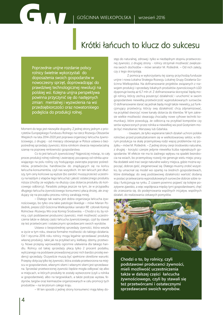 GOŚCINNA WIELKOPOLSKA wrzesień 2016 Krótki łańcuch to klucz do sukcesu Poprzednie unijne rozdanie polscy rolnicy świetnie wykorzystali do doposażenia swoich gospodarstw w nowoczesny sprzęt, doprowadzając do prawdziwej technologicznej rewolucji na polskiej wsi. Kolejna unijna perspektywa powinna przyczynić się do następnych zmian: mentalnej i wyzwolenia na wsi przedsiębiorczości oraz nowatorskiego podejścia do produkcji rolnej. Moment do tego jest niezwykle dogodny. Z jednej strony jednym z priorytetów Europejskiego Funduszu Rolnego na rzecz Rozwoju Obszarów Wiejskich na lata 2014-2020 jest poprawa organizacji łańcucha żywnościowego, z drugiej - od miesięcy obowiązuje w Polsce ustawa o bezpośredniej sprzedaży żywności, która rolnikom stwarza niepowtarzalną szansę na poprawę rentowności gospodarstwa. Co to jest łańcuch żywnościowy? Najprościej mówiąc, to cały proces produkcji rolnej roślinnej i zwierzęcej: począwszy od rolnika uprawiającego na polu rośliny czy hodującego zwierzęta poprzez pośredników, przetwórców, handlowców do znajdujących się na końcu łańcucha konsumentów, czyli nas wszystkich. Im ten łańcuch jest dłuższy, tym ceny końcowe są wyższe (bo zarobić muszą przecież uczestnicy na każdym z etapów tego łańcucha) i jakość ostatecznego produktu niższa (choćby ze względu na dłuższy czas dotarcia produktu do końcowego odbiorcy). Paradoks polega jeszcze na tym, że w przypadku długiego łańcucha żywnościowego konsumenci płacą drożej, ale znajdujący się na początku procesu rolnicy zarabiają mniej. – Dlatego tak ważna jest dobra organizacja łańcucha żywnościowego, bo tylko ona takie patologie likwiduje – mówi Marian Poślednik, prezes LGD Gościnna Wielkopolska i senator RP, członek Komisji Rolnictwa i Rozwoju Wsi oraz Komisji Środowiska. – Chodzi o to, by rolnicy, czyli podstawowi producenci żywności, mieli możliwość uczestniczenia także w dalszej części łańcucha żywnościowego, czyli by stawali się też przetwórcami i ostatecznymi sprzedawcami swoich wyrobów. Ustawa o bezpośredniej sprzedaży żywności, która weszła w życie w tym roku, stwarza formalne możliwości do takiego działania. Od 1 stycznia 2016 roku rolnicy mogą legalnie sprzedawać produkty własnej produkcji, takie jak na przykład sery, kiełbasy, dżemy, przetwory. Nowe przepisy wprowadziły ogromne ułatwienia dla takiego handlu. Rolnicy od takiej sprzedaży płacą tylko 2 procent podatku, wyliczanego na podstawie prowadzonej przez nich bardzo prostej ewidencji sprzedaży. Oczywiście muszą być spełnione określone warunki. Przepisy dotyczą tylko tej żywności, która została przetworzona na miejscu w gospodarstwie, własnymi siłami i własnymi siłami jest sprzedawana. Sprzedaż przetworzonej żywności będzie mogła odbywać się albo w miejscach, w których produkty te zostały wytworzone (czyli u rolnika w gospodarstwie), albo na targowiskach, a także podczas wystaw, festynów, targów oraz kiermaszów organizowanych w celu promocji tych produktów – na terytorium całego kraju. – W ten sposób z jednej strony konsumenci mają łatwy do- 4 stęp do naturalnej, zdrowej i tylko w niezbędnym stopniu przetworzonej żywności, z drugiej strony - rolnicy otrzymali możliwość zwiększenia swoich dochodów – mówi senator M. Poślednik. – Od nich zależy, czy z tego skorzystają. Z pomocą w wykorzystaniu tej szansy przychodzą fundusze unijne i nowa Lokalna Strategia Rozwoju Lokalnej Grupy Działania Gościnna Wielkopolska. Na dofinansowanie projektów związanych z rozwojem produkcji i sprzedaży lokalnych produktów żywnościowych LGD dysponuje kwotą aż 6,7 mln zł. Z dofinansowania skorzystać będą mogli rolnicy, którzy zechcą poszerzyć działalność i uruchomić w swoim gospodarstwie niewielką przetwórczość wyprodukowanych surowców. O dofinansowanie starać się jednak będą mogli także niewielcy, już funkcjonujący przetwórcy, którzy swą działalność chcą zdynamizować, na przykład stworzyć nowe kanały dotarcia do klientów. W tym zakresie wielkie możliwości stwarzają chociażby nowe cyfrowe techniki komunikacji, które powodują, że odbiorcą na przykład kompotów czy serów wytworzonych przez rolnika w niewielkiej wsi pod Gostyniem może być mieszkaniec Warszawy lub Gdańska. - Uważam, że tylko wspieranie takich działań uchroni polskie rolnictwo przed przekształceniem się w wielkotowarowy sektor, w którym produkcja na skalę przemysłową rodzi więcej problemów niż pożytku – mówi M. Poślednik. – Z jednej strony cierpi środowisko naturalne, z drugiej - korzyści czerpie jedynie niewielka liczba największych gospodarstw. W efekcie nie ma to żadnego wpływu na spadek bezrobocia na wsiach, bo przemysłowy rozwój nie generuje wielu miejsc pracy. Na dodatek wieś traci swoje naturalne walory miejsca, gdzie można wypocząć, dobrze zjeść, zregenerować się. Dlatego musimy zrobić wszystko, by umacniał się model wsi opartej na średnich gospodarstwach, które dokładając do swej podstawowej działalności wartość dodaną w postaci przetwarzania wyprodukowanych surowców dobrze sobie radzą i funkcjonują na rynku. Z czasem powinno pojawić się kolejne pozytywne zjawisko, a więc współpraca między tymi gospodarstwami, chęć do zrzeszania się, do podejmowania wspólnych inicjatyw, wspólnych działań, do realizowania ciekawych pomysłów. Chodzi o to, by rolnicy, czyli podstawowi producenci żywności, mieli możliwość uczestniczenia także w dalszej części łańcucha żywnościowego, czyli by stawali się też przetwórcami i ostatecznymi sprzedawcami swoich wyrobów.