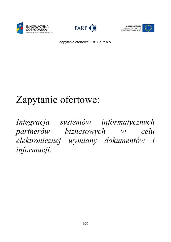 Zapytanie ofertowe EBS Sp. z o.o. Zapytanie ofertowe: Integracja systemów informatycznych partnerów biznesowych w celu elektronicznej wymiany dokumentów i informacji. 1/35 Zapytanie ofertowe EBS Sp. z o.o. Spis treści 1. 2. Charakterystyka Zamawiającego................................................................................................ 4 Przedmiot Oferty ........................................................................................................................ 6 2.1. Ogólne załoŜenia............................................................................................................... 6 2.1.1. System do zarządzania relacjami z klientem CRM........................................................... 6 2.1.2. System do zarządzania dokumentacją techniczną............................................................. 7 2.1.3. System do obsługi zgłoszeń serwisowych ........................................................................ 8 2.1.4. System wymiany dokumentów w formacie EDI .............................................................. 9 2.1.5. System do elektronicznego zarządzania projektami ......................................................... 9 2.2. Zidentyfikowane potrzeby ................................................................................................ 9 2.3. Sposób zaspokojenia potrzeb .......................................................................................... 11 2.4. Etap 1 .............................................................................................................................. 11 2.4.1. System do zarządzania relacjami z klientem CRM.................................................... 11 2.4.2. System wymiany dokumentów w formacie EDI........................................................ 13 2.4.3. System do obsługi zgłoszeń serwisowych.................................................................. 13 2.4.4. Serwer bazy danych.................................................................................................... 13 2.4.5. Oprogramowanie Windows Serwer 2008................................................................... 14 2.4.6. Oprogramowanie MS SQL Server 2008 .................................................................... 14 2.4.7. Urządzenia sieciowe do łączności z partnerami oraz infrastruktura sieciowa ........... 14 2.4.8. Instalacja sprzętu komputerowego i oprogramowania ............................................... 15 2.4.9. WdroŜenie systemu informatycznego B2B ................................................................ 15 2.5. Etap 2 .............................................................................................................................. 16 2.5.1. System do elektronicznego zarządzania projektami................................................... 16 2.5.2. Serwer aplikacji do zarządzania dokumentacją techniczną........................................ 17 3. Przedmiot Oferty ...................................................................................................................... 18 3.1. Wymagania dotyczące gwarancji .................................................................................... 18 3.2. Wymagania dotyczące Oferenta...................................................................................... 18 4. Termin wykonania Przedmiotu Oferty ..................................................................................... 20 5. Sposób przygotowania Ofert .................................................................................................... 21 6. Sposób postępowania ............................................................................................................... 22 8. Miejsce i termin składania ofert ............................................................................................... 27 9. Propozycja umowy ................................................................................................................... 28 10. Sposób kontaktowania się z Zamawiającym ............................................................................ 29 11. Zakończenie postępowania....................................................................................................... 31 12. Załączniki ................................................................................................................................. 32 12.1. Formularz ofertowy:........................................................................................................ 32 OFERTA...................................................................................................................................... 32 12.1. Dokumenty rejestrowe Oferenta: .................................................................................... 33 12.2. Weksel ............................................................................................................................. 33 12.3. Lista referencji ................................................................................................................ 33 2/35 Zapytanie ofertowe EBS Sp. z o.o. 12.4. 12.5. 12.6. 12.7. Specyfikacja oprogramowania i sprzętu .................................................................... 34 Zasady gwarancji ....................................................................................................... 35 Propozycja umowy..................................................................................................... 35 Oświadczenie oferenta o spełnieniu wymagań zapytania ofertowego....................... 35 3/35 Zapytanie ofertowe EBS Sp. z o.o. 1. Charakterystyka Zamawiającego Firma EBS załoŜona została w 1989 roku i od początku swojego istnienia zajmuje się projektowaniem i produkcją elektroniki uŜytkowej. Po wielu latach działalności na rynku firma wyspecjalizowała się w projektowaniu i produkcji elektroniki dl