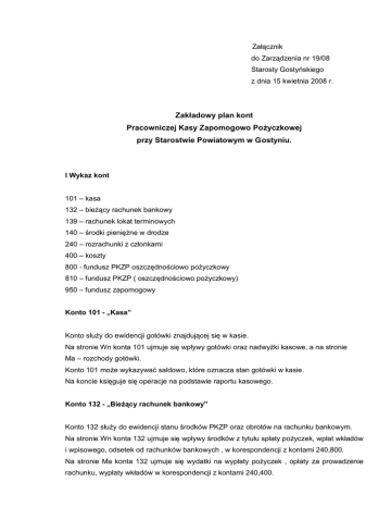 Załącznik do Zarządzenia nr 19/08 Starosty Gostyńskiego z dnia 15 kwietnia 2008 r. Zakładowy plan kont Pracowniczej Kasy Zapomogowo Pożyczkowej przy Starostwie Powiatowym w Gostyniu. I Wykaz kont 101 – kasa 132 – bieżący rachunek bankowy 139 – rachunek lokat terminowych 140 – środki pieniężne w drodze 240 – rozrachunki z członkami 400 – koszty 800 - fundusz PKZP oszczędnościowo pożyczkowy 810 – fundusz PKZP ( oszczędnościowo pożyczkowy) 950 – fundusz zapomogowy Konto 101 - „Kasa” Konto służy do ewidencji gotówki znajdującej się w kasie. Na stronie Wn konta 101 ujmuje się wpływy gotówki oraz nadwyżki kasowe, a na stronie Ma – rozchody gotówki. Konto 101 może wykazywać saldowo, które oznacza stan gotówki w kasie. Na koncie księguje się operacje na podstawie raportu kasowego. Konto 132 - „Bieżący rachunek bankowy” Konto 132 służy do ewidencji stanu środków PKZP oraz obrotów na rachunku bankowym. Na stronie Wn konta 132 ujmuje się wpływy środków z tytułu spłaty pożyczek, wpłat wkładów i wpisowego, odsetek od rachunków bankowych , w korespondencji z kontami 240,800. Na stronie Ma konta 132 ujmuje się wydatki na wypłaty pożyczek , opłaty za prowadzenie rachunku, wypłaty wkładów w korespondencji z kontami 240,400. Konto 132 może wykazywać saldo Wn, które oznacza stan środków na rachunku bieżącym. Na koncie księguje się operacje na podstawie wyciągu bankowego oraz raportu kasowego. Konto 139 - „Rachunek lokat terminowych” Konto 139 służy do ewidencji środków wydzielonych na innych rachunkach bankowych, którymi są lokaty terminowe. Na stronie Wn konta 139 ujmuje się wpływy środków pieniężnych (założenie lokaty) Na stronie Ma konta 139 ujmuje się wpływy środków pieniężnych (likwidacja lokaty) Konto 139 może wykazywać saldo Wn, które oznacza stan środków pieniężnych zgromadzonych w formie lokat terminowych. Na koncie księguje się operacje na podstawie wyciągu bankowego. Konto 140 - „Inne środki pieniężne” Konto służy do ewidencji środków pieniężnych w drodze. Ewidencję analityczną prowadzi się wg tytułów środków pieniężnych w drodze. Na koncie 140 „inne środki pieniężne” księguje się: 1) środki otrzymane z innych budżetów, jeżeli zostały przekazane w poprzednim okresie sprawozdawczym i są objęte wyciągiem bankowym z datą następnego okresu sprawozdawczego, 2) kwoty wpłacone przez inkasentów za pośrednictwem poczty lub bezpośrednio do banku z tytułu dochodów budżetowych, w wypadku potwierdzenia wpłaty przez bank w następnym okresie sprawozdawczym, 3) przelewy dochodów budżetowych zrealizowanych przez bank płatnika w okresie sprawozdawczym i objętych wyciągami bankowymi z rachunku bieżącego budżetu w następnym okresie sprawozdawczym. Środki pieniężne w drodze ewidencjonuje się na bieżąco. Saldo Wn konta 140 „inne środki pieniężne” oznacza stan środków pieniężnych w drodze. Konto 240 - „Pozostałe rozrachunki” Konto 240 – „pozostałe rozrachunki” służy do ewidencji należności i zobowiązań bezspornych z członkami PKZP i zakładami pracy. Po stronie Wn księguje się powstałe należności oraz spłatę i zmniejszenie zobowiązań, po stronie Ma tego konta ujmuje się powstałe zobowiązania oraz spłatę i zmniejszenie należności. Konto może wykazywać dwa salda. Saldo Wn oznacza stan należności od członków lub zakładów pracy, zaś saldo Ma stan zobowiązań. Do konta 24 „pozostałe rachunki” prowadzi się konta analityczne: - 24/1 - „rozrachunki z członkami PKZP” - 24/2 - „rozrachunki z zakładami pracy” Z dalszym podziałem na imiennych dłużników i wierzycieli. Konto 400 - „Koszty według rodzajów” Konto 400 służy do ewidencji kosztów prostych wg rodzaju. Na koncie tym księgowane są koszty egzekucyjne oraz inne koszty stanowiące pozostałe obciążenia. Na stronie Wn konta 400 ujmuje się poniesione koszty, a na stronie Ma - ich zmniejszenia. Ewidencję szczegółową prowadzi się wg pozycji planu finansowego oraz w przekrojach dostosowanych do potrzeb planowania, analizy i sprawozdawczości. Konto 400 może wykazywać w ciągu roku obrotowego saldo Wn, które wyraża wysokość poniesionych kosztów. Saldo konta 400 przenosi się w końcu roku obrotowego na konto 860. Konto 800 - „Fundusz oszczędnościowo- pożyczkowy” Konto to służy do księgowania wkładów członkowskich stanowiących własność członków. Wpłacone wkłady ujmuje się po stronie Ma tego konta, zaś wpłacone, przeksięgowane ujmuje się po stronie Wn. Konto wykazuje saldo Ma, oznaczające stan wkładów członków. Konto 810 - „Fundusz rezerwowy” Konto to służy do ewidencji wpływów określonych w statucie, a między innymi wpisowego, nie podjętych wkładów, darowizn, subwencji, odsetek od lokat i zasądzonych. Po stronie Ma tego konta księguje się wszystkie wpłaty, zaś po stronie Wn umorzenie należności z tytułu pożyczek, a także przelewy na fundusz zapomogowy. Konto wykazuje saldo Ma oznaczające stan funduszu rezerwowego. Konto – 950 „Fundusz zapomogowy” Konto to służy do ewidencji wpływów tworzących ten fundusz, a także wpłat zapomóg. Po stronie Wn tego konta ujmuje Sue przelewy z funduszu rezerwowego, a także dobrowolne wpłaty członków, byłych członków i innych osób fizycznych i prawnych. Po stronie Ma księguje się wypłaty zapomóg członkom w razie szczególnych wypadków losowych. Konto to wykazuje saldo Ma oznaczające stan środków na zapomogi.