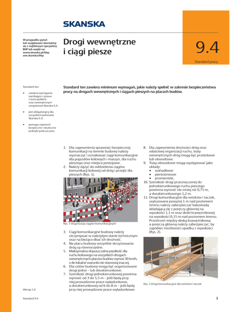 W przypadku pytań lub wątpliwości skontaktuj się z najbliższym specjalistą BHP lub wejdź na: www.skanska.pl/bhp, one.skanska/bhp Drogi wewnętrzne i ciągi piesze 9.4 Standard pracy Standard ten: • zawiera wymagania wynikające z prawa i norm polskich oraz wewnętrznych uregulowań Skanska S.A. • jest obligatoryjny dla wszystkich jednostek Skanska S.A. • pomaga zapewnić bezpieczne i skuteczne praktyki podczas prac. Standard ten zawiera minimum wymagań, jakie należy spełnić w zakresie bezpieczeństwa pracy na drogach wewnętrznych i ciągach pieszych na placach budów. 1. Dla zapewnienia sprawnej i bezpiecznej komunikacji na terenie budowy należy wyznaczyć i oznakować ciągi komunikacyjne dla pojazdów kołowych i maszyn, dla ruchu pieszego oraz miejsca postojowe. 2. Należy dążyć do oddzielenia ciągów komunikacji kołowej od dróg i przejść dla pieszych (Rys. 1). Rys. 1 Organizacja ciągów komunikacyjnych Wersja 1.0 Standard 9.4 3. Ciągi komunikacyjne budowy należy utrzymywać w należytym stanie technicznym oraz na bieżąco dbać ich drożność. 4. Na placu budowy wszystkie skrzyżowania dróg są równorzędne. 5. Maksymalna dopuszczalna prędkość dla ruchu kołowego na wszystkich drogach wewnętrznych placów budów wynosi 30 km/h, o ile lokalne warunki nie stanowią inaczej. 6. Dla celów budowy mogą być organizowane drogi jedno – lub dwukierunkowe. 7. Szerokość drogi jednokierunkowej powinna wynosić od 3 do 5,5 m – jeśli będą przy niej prowadzone prace wyładunkowe, a dwukierunkowej od 6 do 8 m – jeśli będą przy niej prowadzone prace wyładunkowe. 8. Dla zapewnienia drożności dróg oraz właściwej organizacji ruchu, trasy wewnętrznych dróg mogą być przelotowe lub obwodowe. 9. Trasy obwodowe mogą występować jako układy: • wahadłowe • pierścieniowe • promieniste. 10. Szerokość drogi przeznaczonej do jednokierunkowego ruchu pieszego powinna wynosić nie mniej niż 0,75 m, a dwukierunkowego 1,2 m. 11. Drogi komunikacyjne dla wózków i taczek, usytuowane powyżej 1 m nad poziomem terenu należy zabezpieczać balustradą składającą się z poręczy głównej na wysokości 1,1 m oraz deski krawężnikowej na wysokości 0,15 m nad poziomem terenu. Przestrzeń między deską krawężnikową a poręczą główną należy zabezpieczyć, by zapobiec możliwości upadku z wysokości (Rys. 2). Rys. 2 Drogi komunikacyjne dla wózków i taczek 1 Rys. 3 Pochylnia transportowa Rys. 4 Przejścia dla pieszych 2 12. Pochylnie do ręcznego przemieszczania ciężarów oraz drogi komunikacyjne dla taczek nie mogą mieć spadków większych niż 10% (Rys. 3). 13. Przejścia o nachyleniu większym niż 15% należy zaopatrywać w poprzeczne listwy, umocowane w odstępach nie mniej niż 0,4 m lub schody o szerokości nie mniejszej niż 0,75 m, z jednostronnym zabezpieczeniem w postaci bariery na wysokości 1,1 m. 14. Wyjścia z magazynów oraz przejścia między budynkami wychodzące na drogi należy zabezpieczać poręczami ochronnymi o wysokości 1,1 m lub w inny sposób np. tworząc tzw. labirynty wymuszające zwolnienie i zmianę kierunku ruchu (Rys. 4). 15. Drogi ewakuacyjne powinny odpowiadać wymaganiom przepisów techniczno – budowlanych oraz przeciwpożarowych. 16. Drogi i wyjścia ewakuacyjne wymagające oświetlenia należy zaopatrzyć w oświetlenie awaryjne, zapewniające dostateczne natężenie światła w przypadku awarii oświetlenia podstawowego. 17. Przed skrzyżowaniem dróg z napowietrznymi liniami elektroenergetycznymi, w odległości nie mniejszej niż 15 m ustawia się ostrzegawcze bramki oświetlone w warunkach ograniczonej widoczności i wyznaczające dopuszczalne gabaryty przejeżdżających pojazdów. 18. Przejścia i przejazdy w strefach niebezpiecznych należy zabezpieczać daszkami ochronnymi (Rys. 5). Rys. 5 Daszki ochronne nad drogami 19. Szerokość daszka ochronnego w miejscach przejść i przejazdów powinna wynosić co najmniej 0,5 m więcej z każdej strony niż szerokość przejścia lub przejazdu. 20. Na wszystkich drogach wewnętrznych obowiązują zasady ruchu opisane w standardzie głównym „5. Prace pod ruchem”.