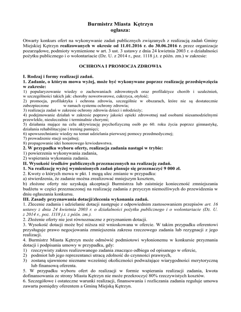 Burmistrz Miasta Kętrzyn ogłasza: Otwarty konkurs ofert na wykonywanie zadań publicznych związanych z realizacją zadań Gminy Miejskiej Kętrzyn realizowanych w okresie od 11.01.2016 r. do 30.06.2016 r. przez organizacje pozarządowe, podmioty wymienione w art. 3 ust. 3 ustawy z dnia 24 kwietnia 2003 r. o działalności pożytku publicznego i o wolontariacie (Dz. U. z 2014 r., poz. 1118 j.t. z późn. zm.) w zakresie: OCHRONA I PROMOCJA ZDROWIA I. Rodzaj i formy realizacji zadań. 1. Zadanie, o którym mowa wyżej, może być wykonywane poprzez realizację przedsięwzięcia w zakresie: 1) popularyzowanie wiedzy o zachowaniach zdrowotnych oraz profilaktyce chorób i uzależnień, w szczególności takich jak: choroby nowotworowe, cukrzyca, otyłość; 2) promocja, profilaktyka i ochrona zdrowia, szczególnie w obszarach, które nie są dostatecznie zabezpieczone w ramach systemu ochrony zdrowia; 3) realizacja zadań w zakresie ochrony zdrowia dzieci i młodzieży; 4) podejmowanie działań w zakresie poprawy jakości opieki zdrowotnej nad osobami niesamodzielnymi przewlekle, nieuleczalnie i terminalnie chorymi; 5) działania mające na celu aktywizację psychofizyczną osób po 60. roku życia poprzez gimnastykę, działania rehabilitacyjne i trening pamięci; 6) upowszechnianie wiedzy na temat udzielania pierwszej pomocy przedmedycznej; 7) prowadzenie stacji socjalnej; 8) propagowanie idei honorowego krwiodawstwa. 2. W przypadku wyboru oferty, realizacja zadania nastąpi w trybie: 1) powierzenia wykonywania zadania, 2) wspierania wykonania zadania. II. Wysokość środków publicznych przeznaczonych na realizację zadań. 1. Na realizację wyżej wymienionych zadań planuje się przeznaczyć 9 000 zł. 2. Kwoty o których mowa w pkt. 1 mogą ulec zmianie w przypadku: a) stwierdzenia, że zadanie można zrealizować mniejszym kosztem, b) złożone oferty nie uzyskają akceptacji Burmistrza lub zaistnieje konieczność zmniejszania budżetu w części przeznaczonej na realizację zadania z przyczyn niemożliwych do przewidzenia w dniu ogłaszania konkursu. III. Zasady przyznawania dotacji/zlecenia wykonania zadań. 1. Zlecenie zadania i udzielanie dotacji następuje z odpowiednim zastosowaniem przepisów art. 16 ustawy z dnia 24 kwietnia 2003 r. o działalności pożytku publicznego i o wolontariacie (Dz. U. z 2014 r., poz. 1118 j.t. z późn. zm.). 2. Złożenie oferty nie jest równoznaczne z przyznaniem dotacji. 3. Wysokość dotacji może być niższa niż wnioskowana w ofercie. W takim przypadku oferentowi przysługuje prawo negocjowania zmniejszenia zakresu rzeczowego zadania lub rezygnacji z jego realizacji. 4. Burmistrz Miasta Kętrzyn może odmówić podmiotowi wyłonionemu w konkursie przyznania dotacji i podpisania umowy w przypadku, gdy: 1) rzeczywisty zakres realizowanego zadania znacząco odbiega od opisanego w ofercie, 2) podmiot lub jego reprezentanci utracą zdolność do czynności prawnych, 3) zostaną ujawnione nieznane wcześniej okoliczności podważające wiarygodności merytoryczną lub finansową oferenta. 5. W przypadku wyboru ofert do realizacji w formie wspierania realizacji zadania, kwota dofinansowania ze strony Miasta Kętrzyn nie może przekroczyć 80% rzeczywistych kosztów. 6. Szczegółowe i ostateczne warunki realizacji, finansowania i rozliczania zadania reguluje umowa zawarta pomiędzy oferentem a Gminą Miejską Kętrzyn. I. IV. Termin i warunki realizacji zadań. 1. Zadania winny być zrealizowane od 11.01.2016 r. do 30.06.2016 r. r. z zastrzeżeniem, iż szczegółowe terminy wykonania zadań określone zostaną w umowach. 2. Zadania winny być zrealizowane z najwyższą starannością zgodnie z zawartą umową oraz obowiązującymi standardami i przepisami, w zakresie opisanym w ofercie. 3. Zadania winny być wykonane dla jak największej liczby mieszkańców Kętrzyna. V. Termin składania ofert. 1. Podmioty uprawnione do udziału w postępowaniu konkursowym składają pisemne oferty realizacji zadania wg wzoru określonego w rozporządzeniu Ministra Pracy i Polityki Społecznej z dnia 15 grudnia 2010 r. w sprawie wzoru oferty realizacji zadania publicznego, ramowego wzoru umowy o wykonanie zadania publicznego i wzoru sprawozdania z wykonania tego zadania (Dz. U. z 2011 r. Nr 6, poz. 25) w terminie do dnia 29 grudnia 2015 r. do godz. 15.30. 2. Oferty należy składać w Biurze Obsługi Interesanta (na parterze) w Urzędzie Miasta Kętrzyn ul. Wojska Polskiego 11, osobiście lub drogą pocztową (decyduje data wpływu). 3. Do oferty należy dołączyć: kopię aktualnego odpisu z Krajowego Rejestru Sądowego, innego rejestru lub ewidencji (odpis musi być zgodny z aktualnym stanem faktycznym i prawnym, niezależnie od tego, kiedy został wydany). 4. Druki ofert na realizację zadania publicznego, jak również szczegółowe informacje o konkursie można pobierać ze strony internetowej Miasta Kętrzyn: www.miastoketrzyn.pl - w dziale: organizacje pozarządowe – Otwarte Konkursy Ofert oraz w Biuletynie Informacji Publicznej Urzędu Miasta Kętrzyn a także w Urzędzie Miasta Kętrzyn, ul. Woj. Polskiego 11, pok. nr 209. 5. Komisja wzywa do uzupełnienia oferty w terminie 3 dni roboczych od otrzymania wezwania jeżeli: oferta jest niekompletna, zawiera braki formalne, została złożona na nieprawidłowych formularzach. 6. Jeżeli braki nie zostały uzupełnione w terminie lub oferta została złożona po terminie, Komisja opiniuje ofertę negatywnie. VI. Termin, tryb i kryteria stosowane przy dokonywaniu wyboru ofert. 1. Warunkiem rozpatrzenia oferty jest: zamieszczenie w ofercie informacji, o których mowa w art. 14 ustawy z dnia 24 kwietnia 2003 r. o działalności pożytku publicznego i o wolontariacie (Dz. U. z 2014 r., poz. 1118 j.t. z późn. zm.). 2. Przy rozpatrywaniu ofert Komisja Konkursowa: a) ocenia możliwość realizacji zadania publicznego przez organizację pozarządową lub podmioty wymienione w art. 3 ust. 3 ustawy; b) oceni