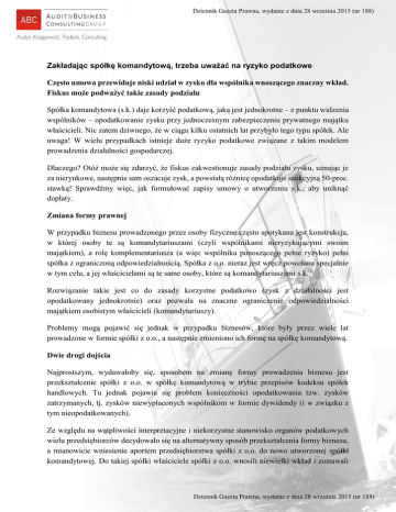 Dziennik Gazeta Prawna, wydanie z dnia 28 września 2015 (nr 188) Zakładając spółkę komandytową, trzeba uważać na ryzyko podatkowe Często umowa przewiduje niski udział w zysku dla wspólnika wnoszącego znaczny wkład. Fiskus może podważyć takie zasady podziału Spółka komandytowa (s.k.) daje korzyść podatkową, jaką jest jednokrotne – z punktu widzenia wspólników – opodatkowanie zysku przy jednoczesnym zabezpieczeniu prywatnego majątku właścicieli. Nic zatem dziwnego, że w ciągu kilku ostatnich lat przybyło tego typu spółek. Ale uwaga! W wielu przypadkach istnieje duże ryzyko podatkowe związane z takim modelem prowadzenia działalności gospodarczej. Dlaczego? Otóż może się zdarzyć, że fiskus zakwestionuje zasady podziału zysku, uznając je za nierynkowe, następnie sam oszacuje zysk, a powstałą różnicę opodatkuje sankcyjną 50-proc. stawką! Sprawdźmy więc, jak formułować zapisy umowy o utworzeniu s.k., aby uniknąć dopłaty. Zmiana formy prawnej W przypadku biznesu prowadzonego przez osoby fizyczne często spotykana jest konstrukcja, w której osoby te są komandytariuszami (czyli wspólnikami nieryzykującymi swoim majątkiem), a rolę komplementariusza (a więc wspólnika ponoszącego pełne ryzyko) pełni spółka z ograniczoną odpowiedzialnością. Spółka z o.o. nieraz jest wręcz powołana specjalnie w tym celu, a jej właścicielami są te same osoby, które są komandytariuszami s.k. Rozwiązanie takie jest co do zasady korzystne podatkowo (zysk z działalności jest opodatkowany jednokrotnie) oraz pozwala na znaczne ograniczenie odpowiedzialności majątkiem osobistym właścicieli (komandytariuszy). Problemy mogą pojawić się jednak w przypadku biznesów, które były przez wiele lat prowadzone w formie spółki z o.o., a następnie zmieniono ich formę na spółkę komandytową. Dwie drogi dojścia Najprostszym, wydawałoby się, sposobem na zmianę formy prowadzenia biznesu jest przekształcenie spółki z o.o. w spółkę komandytową w trybie przepisów kodeksu spółek handlowych. Tu jednak pojawia się problem konieczności opodatkowania tzw. zysków zatrzymanych, tj. zysków niewypłaconych wspólnikom w formie dywidendy (i w związku z tym nieopodatkowanych). Ze względu na wątpliwości interpretacyjne i niekorzystne stanowisko organów podatkowych wielu przedsiębiorców decydowało się na alternatywny sposób przekształcenia formy biznesu, a mianowicie wniesienie aportem przedsiębiorstwa spółki z o.o. do nowo utworzonej spółki komandytowej. Do takiej spółki właściciele spółki z o.o. wnosili niewielki wkład i zostawali Dziennik Gazeta Prawna, wydanie z dnia 28 września 2015 (nr 188) Dziennik Gazeta Prawna, wydanie z dnia 28 września 2015 (nr 188) komandytariuszami, a komplementariuszem zostawała spółka z o.o., która wniosła dotychczasowy biznes. Efekt optymalizacji W takim przypadku, w celu osiągnięcia elementu optymalizacji opodatkowania, stosowaną praktyką było przypisywanie sp. z o.o. stosunkowo niewielkiego udziału w zyskach sp.k., (np. 1 proc.), właściciele (osoby fizyczne) otrzymywali zaś pozostałą część zysku. W efekcie dochodziło do sytuacji, w której jeden ze wspólników (spółka z o.o.) wnosił wkład o istotnej wartości, zadowalając się nieproporcjonalnie niskim udziałem w zysku. W związku z tym pojawia się wątpliwość, czy ustalenie podziału zysku nieproporcjonalnie do wartości wniesionych wkładów jest dopuszczalne w sytuacji, w której odbywa się to między podmiotami powiązanymi. Jeden ze wspólników (sp. z o.o.) jest bowiem powiązany kapitałowo (ale najczęściej i osobowo) z pozostałymi. Kodeks spółek handlowych pozwala na dowolne kształtowanie podziału zysku między wspólników – wystarczy zapis w umowie spółki o ustalonym dla każdego ze wspólników udziale w zysku. Jeżeli takiego zapisu nie ma, to komandytariusz uczestniczy w zysku spółki proporcjonalnie do jego wkładu rzeczywiście wniesionego do spółki (art. 123 par. 1 k.s.h.). Natomiast ustawa o CIT wskazuje, że przychody i koszty podatkowe dzieli się między komplementariusza i komandytariuszy proporcjonalnie do ustalonego w umowie spółki podziału zysku (art. 5 ust. 1 i 2 ustawy o CIT oraz art. 8 ust. 1 i 2 ustawy o PIT). Organy podatkowe przez wiele lat nie kwestionowały takiego podejścia, dopuszczając niesprawiedliwy podział, twierdząc m.in., że „Uczestniczenie w przychodach i kosztach podatkowych odbywa się proporcjonalnie do udziału w zysku, niezależnie od wysokości wkładów wniesionych przez wspólników”. Przykładem mogą być interpretacje dyrektorów izb skarbowych w: Poznaniu z 6 maja 2014 r. (nr ILPB1/415-356/14-2/AG), Warszawie z 19 kwietnia 2013 r. (nr IPPB3/423-84/13-2/AM), Poznaniu z 2 sierpnia 2012 r. (nr ILPB1/415499/12-3/AMN), Katowicach z 3 lipca 2009 r. (nr IBPB1/4I5-281/09/KB) czy Poznaniu z 18 września 2008 r. (nr ILPB1/415- 436/08-2/RP). Nowe podejście W ciągu ostatnich dwóch lat pojawiały się jednak także interpretacje opowiadające się za innym stanowiskiem. I tak, jeżeli podmioty powiązane utworzą sp.k., a warunki zawarcia umowy tej spółki określającej m.in. sposób ustalenia praw do udziału w zysku odbiegałyby od warunków, jakie ustaliłyby podmioty niepowiązane, i wpłynęłoby to na wysokość uzyskiwanych dochodów, to organy podatkowe mogą określić dochód wspólników bez uwzględnienia warunków wynikających z tych powiązań. Stwierdzili tak w wydanych interpretacjach np. dyrektorzy izb skarbowych w: Katowicach z 18 grudnia 2014 r. (nr IBPBI/1/423-21/14/KB), Poznaniu z 25 października 2013 r. (nr ILPB1/415-853/13-5/AMN), Poznaniu z 11 czerwca Dziennik Gazeta Prawna, wydanie z dnia 28 września 2015 (nr 188) Dziennik Gazeta Prawna, wydanie z dnia 28 września 2015 (nr 188) 2013 r. (nr ILPB4/423-93/12/13-S/MC). Takie niekorzystne dla podatników stanowisko zaprezentował również Wojewódzki
