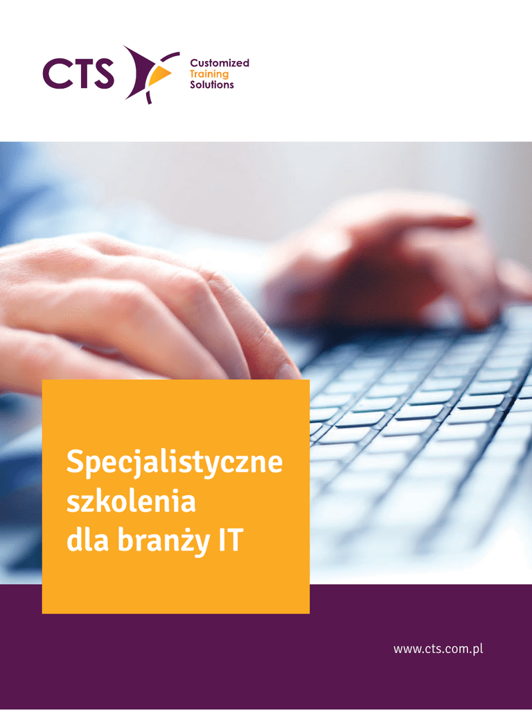 Specjalistyczne szkolenia dla branży IT www.cts.com.pl SZANOWNI PAŃSTWO! Firma CTS Customized Training Solutions od przeszło 20 lat prowadzi wysokospecjalistyczne szkolenia dla osób w branży IT. W CTS uczymy nie tylko technicznych umiejętności przydatnych w pracy programisty, administratora czy specjalisty IT, ale także rozwijamy umiejętności analizowania, kreatywności, samodzielności, dociekliwości, zaangażowania tak bardzo cenionych w dzisiejszych czasach. Dziś branża IT to wyzwanie. W branży IT wszystko zależy od umiejętności ponieważ: • rynki bardzo szybko się rozwijają • trzeba umieć przewidywać funkcjonowanie konkretnego produktu • coraz więcej konsumentów korzysta z elektronicznych usług i produktów • innowacyjność to gwarancja sukcesu. Wybór firmy CTS na dostawcę rozwiązań szkoleniowych daje gwarancję otrzymania specjalistycznej wiedzy na najwyższym poziomie poprzez: • szeroką ofertę autoryzowanych szkoleń: Microsoft, CompTIA, McAfee, Prince2, ITIL, ISO 27005, 31000, 27001, 22301 • dopasowanie programu szkoleń autorskich do wymagań Klienta • różne tryby nauki: stacjonarne i autorski remote training (z dowolnego miejsca na świecie i w dowolnym czasie) • doświadczoną kadrę trenerską, szkolącą po polsku i angielsku, regularnie odnawiającą certyfikację • elastyczne terminy i konkurencyjne ceny • ciągłe kontrolowanie jakości pracy trenerów oraz środowiska szkoleniowego (prawie 100% zadowolonych lub bardzo zadowolonych kursantów). Prezes Zarządu Beata Wieczorek 1 SZKOLENIA IT Oferujemy szkolenia - na różnych poziomach począwszy od podstawowego do zaawansowanego - dla różnych grup zawodowych pracujących w branży IT. Prowadzimy szkolenia zarówno autoryzowane jak i autorskie. Oferta szkoleniowa w zakresie specjalności informatycznych podzielona została na następujące obszary: • Bezpieczeństwo sieci • Sieci APLIKACJE BIUROWE ...... ZARZĄDZANIE INFRASTRUKTURĄ ...... • Excel • Word • PowerPoint • SharePoint • Access • Outlook ...... ARCHITEKTURA PROGRAMOWANIA • Języki programowania • Aplikacje mobilne • Rozwiązania webowe • Modelowanie procesami • Cloud computing • Business Intelligence BIZNESOWE IT ...... • Zarządzanie serwerami • Zarządzanie desktopami • Struktury do zarządzania zdalnego • Bezpieczeństwo • Cloud computing ...... ADMINISTRACJA IT • CompTIA • ITIL • UML/RUB • BPMN • Usability • Architektura Enterprise Realizujemy także szkolenia biznesowe i z zarządzania dla kadry IT. Szczegółowe informacje na stronie: www.cts.com.pl 2 AUTORYZACJE W zakresie rozwiązań technicznych CTS posiada status ośrodka autoryzowanego liczących się firm: software’owych: egzaminacyjnych: njnj Microsoft njnj Pearson VUE njnj CompTIA njnj Prometric Test Center njnj McAfee njnj Cetriport 3 CO NAS WYRÓŻNIA? CTS oferuje od 1989 roku szkolenia, dostosowane do indywidualnych potrzeb Klientów z najbardziej dynamicznych tematów – prawa i IT. Nasi trenerzy posiadają stosowne uprawnienia zawodowe (zezwolenia, certyfikaty) od wielu lat, a to przekłada się na ich bogate doświadczenie praktyczne. Branża usług informatycznych i prawnych wymusza na nich ciągłe doskonalenie, reagowanie na zmiany lub zapowiedzi zmian. Oba te czynniki skutkują bardzo wysokimi notami w ankietach poszkoleniowych i wysokim procentem powracających do nas Klientów. ELASTYCZNOŚĆ PEWNE TERMINY KONKURENCYJNOŚĆ Szkolimy w dni robocze i w weekendy w przypadku szkoleń zamkniętych, wedle wyboru Klienta. Standardowo w Warszawie i Krakowie. Niestandardowo w dowolnym miejscu w Polsce i zagranicą. Posiadamy doświadczenie w organizacji zaawansowanych technicznie, szkoleń w nietypowych miejscach (np. ośrodki agroturystyczne). Oferujemy szkolenia w gwarantowanych terminach realizacji. Dzięki temu Klienci mają pewność iż odbędzie się ono w zaplanowanym terminie. Ułatwiamy tym samym zaplanowanie sobie czasu i podjęcie decyzji odnośnie zapisu na szkolenie. Nasze ceny warto porównać z innymi dostawcami podobnych usług. Za mniejszą cenę w CTS można zdobyć wiedzę na najwyższym poziomie. Dbamy by w ofercie były aktualne promocje, ale również oferujemy jednorazowe upusty cenowe i stałe rabaty naszym Klientom. DZIAŁAMY OD 1989 ROKU! 4 METODY PROWADZENIA SZKOLEŃ W CTS oferujemy dwie formy prowadzenia szkoleń: stacjonarne i w formie remote training. Szkolenia stacjonarne odbywają się w sali komputerowej w naszych dwóch ośrodkach w Warszawie lub w Krakowie. Trener prowadzący szkolenie ma do dyspozycji projektor multimedialny, a także bezpośredni kontakt z uczestnikami szkolenia. Dzięki temu może na bieżąco odpowiadać na pytania kursantów oraz pomagać im w części praktycznej szkoleń. Stanowiska komputerowe w sali szkoleniowej wyposażone są w nowoczesne szkoleniowe jednostki komputerowe z ekranami LCD i posiadają dostęp do zaawansowanego środowiska laboratoriów, w których przeprowadzamy ćwiczenia praktyczne. Sprzęt spełnia wymogi dedykowane dla szkoleń IT. Szkolenia w formie remote training to szkolenia zdalne prowadzone przez internet. Mikrofony oraz kamery umieszczone w sali pozwalają na wygodne śledzenie prelekcji wykładowców, a także dyskusje uczestników szkolenia. Państwa pytania oraz udział w dyskusjach są słyszane przez trenera oraz innych uczestników szkolenia. Jakość (efektywność) szkoleń remote jest na tym samym poziomie, jak szkoleń „zwykłych”. Szkolenia remote to nie tylko oszczędność czasu związana z koniecznością dojazdu do ośrodka szkoleniowego, to także niższa cena samego szkolenia. DWIE FORMY SZKOLEŃ: STACJONARNE I REMOTE TRAINING 5 TRENERZY Prowadzenie szkoleń w CTS zawsze powierzamy dobrym trenerom. Dobry trener to taki, który ma odpowiednie przygo- Trenerzy współpracujący z CTS są specjalistami, co towanie merytoryczne potwierdzone studiami lub potwierdzają posiadane przez ni