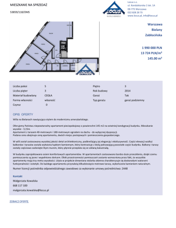 Locus s.c. ul. Konduktorska 1 lok. 1A 00-775 Warszawa 022 828 28 73 www.locus.pl, [email protected] D/^<E/E^WZ 53859/118/OMS Warszawa Bielany ĂďųŽĐŝŷƐŬĂ 1 990 000 PLN 13 724 PLN/m² 145.00 m² Liczba pokoi 5 WŝħƚƌŽ 3 >ŝĐnjďĂƉŝħƚĞƌ 3 Rok budowy 2014 DĂƚĞƌŝĂųďƵĚŽǁůĂŶLJ 'B 'ĂƌĂǏ Tak &ŽƌŵĂǁųĂƐŶŽƑĐŝ ǁųĂƐŶŽƑđ dLJƉŐĂƌĂǏƵ ŐĂƌĂǏƉŽĚnjŝĞŵŶLJ Czynsz 0 OPIS OFERTY tŝůůĂŶĂŝĞůĂŶĂĐŚŶĂǁŝČnjƵũČĐĂƐƚLJůĞŵĚŽŵŽĚĞƌŶŝnjŵƵĂŵĞƌLJŬĂŷƐŬŝĞŐŽ͘ KĨĞƌƵũĞŵLJWĂŷƐƚǁƵŶŝĞƉŽǁƚĂƌnjĂůŶLJĂƉĂƌƚĂŵĞŶƚƉŝĞĐŝŽƉŽŬŽũŽǁLJŽƉŽǁŝĞƌnjĐŚŶŝ145 m2 na ostatniej kondygnacji budynku. Mieszkanie wysokie - 3,15m. Apartament z tarasem 40-metrowym i 180ͲŵĞƚƌŽǁLJŵŽŐƌŽĚĞŵŶĂĚĂĐŚƵͲĚŽǁLJųČĐnjŶĞũĚLJƐƉŽnjLJĐũŝ͘ WŽĚĂŶĂĐĞŶĂŽďĞũŵƵũĞĐĞŶħĂƉĂƌƚĂŵĞŶƚƵ͕ĚǁſĐŚŵŝĞũƐĐƉŽƐƚŽũŽǁLJĐŚŝƉŽŵŝĞƐnjĐnjĞŶŝĂŐŽƐƉŽĚĂƌĐnjĞŐŽ͘ tǁŝůůŝnjŽƐƚĂųnjĂƐƚŽƐŽǁĂŶLJǁLJƐŽŬŝĞũũĂŬŽƑĐŝĚĞƚĂůĂƌĐŚŝƚĞŬƚŽŶŝĐnjŶLJ͕ƉŽĚŬƌĞƑůĂũČĐLJũĞũĞůĞŐĂŶĐũħŝĞŬƐŬůƵnjLJǁŶŽƑđ͘njħƑĐŝĞůĞǁĂĐũŝǁnjĚųƵǏ ďĂůŬŽŶſǁŝƚĂƌĂƐſǁnjŽƐƚĂųĂǁLJųŽǏŽŶĂųƵƉŬŝĞŵŬĂŵŝĞŶŶLJŵ͕ŬƚſƌLJŬŽŶƚƌĂƐƚƵũĞnjďŝĞůČƉŽŬƌLJǁĂũČĐČƉŽnjŽƐƚĂųĞĐnjħƑĐŝďƵĚLJŶŬƵ͘ĂůŬŽŶLJŝƚĂƌĂƐLJ njŽƐƚĂųLJĐnjħƑĐŝŽǁŽnjĂƐųŽŶŝħƚĞůŝƚLJŵŵƵƌĞŵ͕ŬƚſƌLJƉųLJŶŶŝĞƉƌnjĞƉůĂƚĂƐŝħnjĞƐnjŬůĂŶČďĂůƵƐƚƌĂĚČ͘ tďƵĚLJŶŬƵnjĂƉƌŽũĞŬƚŽǁĂŶŽŽƐŝĞŵŬŽŵĨŽƌƚŽǁLJĐŚĂƉĂƌƚĂŵĞŶƚſǁ͘tĂƉĂƌƚĂŵĞŶƚĂĐŚnjĂƐƚŽƐŽǁĂŶŽďĂƌĚnjŽĚƵǏĞƉƌnjĞƐnjŬůĞŶŝĂ͕ĚnjŝħŬŝĐnjĞŵƵ ƉŽŵŝĞƐnjĐnjĞŶŝĂƐČũĂƐŶĞŝǁLJƉĞųŶŝŽŶĞƐųŽŷĐĞŵ͘ĨĞŬƚƉƌnjĞƐƚƌnjĞŶŶŽƑĐŝƉŽŵŝĞƐnjĐnjĞŷnjŽƐƚĂŶŝĞǁnjŵŽĐŶŝŽŶLJƉƌnjĞnjĨĂŬƚ͕ǏĞǁƐnjLJƐƚŬŝĞ ĂƉĂƌƚĂŵĞŶƚLJŵĂũČƚƌnjLJŵĞƚƌLJǁLJƐŽŬŽƑĐŝ͘hǏLJƚĂǁƉƌŽũĞŬĐŝĞĚƌĞǁŶŝĂŶĂƐƚŽůĂƌŬĂŽŬŝĞŶŶĂĐŚĂƌĂŬƚĞƌLJnjƵũĞƐŝħĚŽƐŬŽŶĂųLJŵŝǁĂůŽƌĂŵŝ ĨƵŶŬĐũŽŶĂůŶŽƑĐŝŝĞƐƚĞƚLJŬŝ͘ŽŬĂǏĚĞŐŽĂƉĂƌƚĂŵĞŶƚƵƉƌnjLJŶĂůĞǏČŬŝůŬƵĚnjŝĞƐŝħĐŝŽŵĞƚƌŽǁĞƚĂƌĂƐLJ͕ǁLJŬŽŷĐnjŽŶĞŬĂŵŝĞŶŝĞŵŶĂƚƵƌĂůŶLJŵ͘ EƵŵĞƌůŝĐĞŶĐũŝƉŽƑƌĞĚŶŝŬĂŽĚƉŽǁŝĞĚnjŝĂůŶĞŐŽnjĂǁŽĚŽǁŽnjĂǁLJŬŽŶĂŶŝĞƵŵŽǁLJƉŽƑƌĞĚŶŝĐƚǁĂ͗Ϯϰϰϴ Kontakt DĂųŐŽƌnjĂƚĂ<ŽǁĂůƐŬĂ 668 117 100 [email protected] KK&Zd%