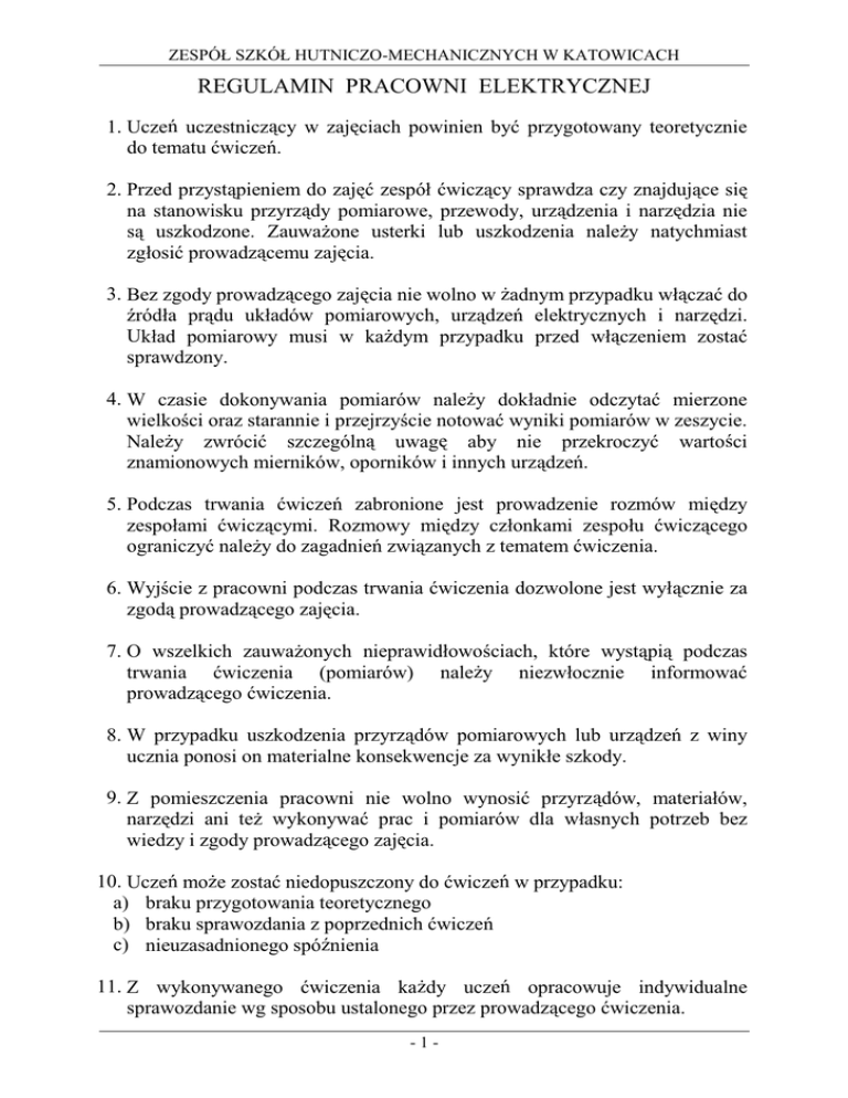 =(63Ïà6=.Ïà+871,&=2-MECHANICZNYCH W KATOWICACH REGULAMIN PRACOWNI ELEKTRYCZNEJ 1. 8F]H XF]HVWQLF]F\ Z ]DM FLDFK SRZLQLHQ E\ü SU]\JRWRZDQ\ WHRUHW\F]QLH GRWHPDWXüZLF]H 2. 3U]HGSU]\VWSLHQLHPGR]DM ü]HVSyáüZLF]F\VSUDZG]DF]\]QDMGXMFHVL QD VWDQRZLVNX SU]\U]G\ SRPLDURZH SU]HZRG\ XU]G]HQLD L QDU] G]LD QLH V XV]NRG]RQH =DXZD*RQH XVWHUNL OXE XV]NRG]HQLD QDOH*\ QDW\FKPLDVW ]JáRVLüSURZDG]FHPX]DM FLD 3. %H]]JRG\SURZDG]FHJR]DM FLDQLHZROQRZ*DGQ\PSU]\SDGNXZáF]DüGR (UyGáD SUGX XNáDGyZ SRPLDURZ\FK XU]G]H HOHNWU\F]Q\FK L QDU] G]L UNáDG SRPLDURZ\ PXVL Z ND*G\P SU]\SDGNX SU]HG ZáF]HQLHP ]RVWDü sprawdzony. 4. : F]DVLH GRNRQ\ZDQLD SRPLDUyZ QDOH*\ GRNáDGQLH RGF]\WDü PLHU]RQH ZLHONRFLRUD]VWDUDQQLHLSU]HMU]\FLHQRWRZDüZ\QLNLSRPLDUyZZ]HV]\FLH 1DOH*\ ]ZUyFLü V]F]HJyOQ XZDJ DE\ QLH SU]HNURF]\ü ZDUWRFL ]QDPLRQRZ\FKPLHUQLNyZRSRUQLNyZLLQQ\FKXU]G]H 5. 3RGF]DV WUZDQLD üZLF]H ]DEURQLRQH MHVW SURZDG]HQLH UR]PyZ PL G]\ ]HVSRáDPL üZLF]F\PL 5R]PRZ\ PL G]\ F]áRQNDPL ]HVSRáX üZLF]FHJR RJUDQLF]\üQDOH*\GR]DJDGQLH]ZL]DQ\FK]WHPDWHPüZLF]HQLD 6. :\MFLH]SUDFRZQLSRGF]DVWUZDQLDüZLF]HQLDGR]ZRORQHMHVWZ\áF]QLH]D ]JRGSURZDG]FHJR]DM FLD 7. 2 ZV]HONLFK ]DXZD*RQ\FK QLHSUDZLGáRZRFLDFK NWyUH Z\VWSL SRGF]DV WUZDQLD üZLF]HQLD SRPLDUyZ QDOH*\ QLH]ZáRF]QLH LQIRUPRZDü SURZDG]FHJRüZLF]HQLD 8. : SU]\SDGNX XV]NRG]HQLD SU]\U]GyZ SRPLDURZ\FK OXE XU]G]H ] ZLQ\ XF]QLDSRQRVLRQPDWHULDOQHNRQVHNZHQFMH]DZ\QLNáHV]NRG\ 9. = SRPLHV]F]HQLD SUDFRZQL QLH ZROQR Z\QRVLü SU]\U]GyZ PDWHULDáyZ QDU] G]L DQL WH* Z\NRQ\ZDü SUDF L SRPLDUyZ GOD ZáDVQ\FK SRWU]HE EH] ZLHG]\L]JRG\SURZDG]FHJR]DM FLD 10. 8F]HPR*H]RVWDüQLHGRSXV]F]RQ\GRüZLF]HZSU]\SDGNX a) braku przygotowania teoretycznego b) EUDNXVSUDZR]GDQLD]SRSU]HGQLFKüZLF]H c) QLHX]DVDGQLRQHJRVSy(QLHQLD 11. = Z\NRQ\ZDQHJR üZLF]HQLD ND*G\ XF]H RSUDFRZXMH LQG\ZLGXDOQH VSUDZR]GDQLHZJVSRVREXXVWDORQHJRSU]H]SURZDG]FHJRüZLF]HQLD -1- =(63Ïà6=.Ïà+871,&=2-MECHANICZNYCH W KATOWICACH 12. 8F]H PD RERZL]HN XF]HVWQLF]\ü ZH ZV]\VWNLFK SU]HZLG]LDQ\FK SURJUDPHPüZLF]HQLDFK:SU]\SDGNXQLHXF]HVWQLF]HQLDLVWQLHMHRERZL]HN opracowania specjalnego opisu üZLF]HQLD OXE XF]HVWQLF]HQLD Z ]DM FLDFK VSUDZG]DMF\FK XPR*OLZLDMF\FK NRQWURO RSDQRZDQLD SHZQ\FK XPLHM WQRFLSUDNW\F]Q\FKDWDN*HZLHG]\WHRUHW\F]QHM 13. :SUDFDFK]ZL]DQ\FK]SU]\JRWRZDQLHPüZLF]HQLDSRPDJDSURZDG]FHPX Z\]QDF]RQ\]HVSyáG\*XUQ\GRRERZL]NyZNWyUHJRQDOH*\ a) SU]\JRWRZDQLHSU]HG]DM FLDPLSU]\U]GyZXU]G]HNUHG\LWDEOLF b) UR]G]LDáQDVWDQRZLVNDSU]\U]GyZXU]G]HQDU] G]LLSU]HZRGyZRUD] sprawdzenie ich stanu technicznego c) VSU]WDQLHSUDFRZQLSRüZLF]HQLDFK 14. 1DVWRáDFKQDNWyU\FKSURZDG]RQHVSUDFHLSRPLDU\QLHPRJ]QDMGRZDü VL *DGQHLQQHSU]HGPLRW\QLHSRWU]HEQHGODSU]HSURZDG]HQLDüZLF]HQLD 15. : F]DVLH WUZDQLD ]DM ü QDOH*\ ]DFKRZDü QDMGDOHM LGFH URGNL RVWUR*QRFL ]DEH]SLHF]DMFH SU]HG SRUD*HQLHP SUGHP HOHNWU\F]Q\P Z]JO GQLH przed LQQ\PLZ\SDGNDPL1LHXZDJDOHNNRP\OQRüEG(QLHRVWUR*QRüPRJE\ü SU]\F]\QNDOHFWZDOXEPLHUFL :V]F]HJyOQRFLQLHQDOH*\ a) GRW\NDüEH]SRWU]HE\SU]HZRGyZXU]G]HLSU]\U]GyZSRPLDURZ\FK b) ]EOL*DüVL GRUXFKRP\FKLZLUXMF\FKF] FLPDV]\Q 16. W UD]LH ]DLVWQLHQLD SR*DUX QDOH*\ EH]Z]JO GQLH ]DFKRZDü VSRNyM L SRGSRU]GNRZDüVL SROHFHQLRPSURZDG]FHJR]DM FLD -2-