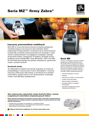 Seria MZ™ firmy Zebra® Łączymy pracowników mobilnych Seria MZ to nowa linia ekonomicznych drukarek paragonów charakteryzujących się typowym dla produktów Zebry połączeniem funkcjonalności z atrakcyjną ceną. Zwarta budowa modelu MZ umożliwia wykorzystywanie tych drukarek w wielu różnych zastosowaniach wymagających szybkiego i łatwego drukowania kwitów i paragonów na żądanie. Drukarkę można podłączyć przez interfejs 802.11b/g, Bluetooth®, IrDA® lub USB do terminala przenośnego lub aparatu smartphone i generować czyste i wyraźne wydruki. Swoboda druku Te niekłopotliwe drukarki nosi się tak wygodnie, że wcale nie przeszkadzają w wykonywaniu innych obowiązków i można je mieć przy sobie przez całą zmianę. A ponieważ są to drukarki marki Zebra, możesz liczyć na ich niezawodność, wybierając model z serii MZ klasy podstawowej. Seria MZ Te łatwe w obsłudze przenośne drukarki paragonów to idealny pierwszy krok dla użytkowników pragnących zastąpić ręcznie wypisywane dokumenty, gotowe druki lub psujące się drukarki przenośne. Pracownicy mobilni na całym świecie docenią wygodę niewielkich drukarek z serii MZ w takich zastosowaniach jak: • naprawy/instalacje w terenie • dostawy • płatność przy stoliku w restauracjach • mobilny punkt sprzedaży • bilety/mandaty parkingowe • sprzedaż biletów w środkach komunikacji • rachunki za usługi komunalne/ odczytywanie liczników Aby wykorzystaç optymalnie swoje drukarki Zebra, używaj oryginalnych materiałów eksploatacyjnych Zebra! Zebra oferuje do drukarek przenośnych szeroki wybór materiałów eksploatacyjnych wyprodukowanych według wysokich standardów jakości i przeznaczonych do wielu różnych zastosowań. • Produkowane specjalnie do współpracy z drukarkami Zebra • Testowane laboratoryjnie w celu zapewnienia optymalnych rezultatów • Minimalizujà zużycie głowicy drukarki Więcej informacji znajdziesz na stronie www.zebra.com Podstawowe dane techniczne* Wyposażenie standardowe Parametry nośników Dane techniczne drukarek • Inteligentne zarządzanie bateriami (monitoruje baterie w celu przedłużenia użytkowania i zwiększenia wydajności) • Rezydentne czcionki skalowalne • Wysoko wydajny 32-bitowy procesor • Czujnik braku papieru • Komora na rolkę nośnika otwierana jednym przyciskiem do łatwego wkładania i wyjmowania rolki • Przezroczysta pokrywa komory nośników umożliwiająca podgląd zapasu nośnika • Zewnętrzne włączanie/wyłączanie z klawiatury, terminala lub drukarki • Zasilacz sieciowy w zestawie • Obsługa IrDA/USB 2.0 Maks. średnica zewn. rolki • 47,8 mm MZ 220 Maksymalny obszar druku • Szerokość: 48,3 mm • Długość: 813 mm Rozdzielczość • 8 punktów na mm (203 dpi) Maksymalna szybkość druku • 76,2 mm na sekundę Pamięć • Flash 8 MB, SRAM 16 MB Parametry fizyczne • Szerokość: 80,8 mm • Głębokość: 57,4 mm • Wysokość: 135,6 mm • Masa (z baterią): 0,32 kg Parametry pracy Środowiskowe • Temperatura pracy -10ľC do 50ľC • Temperatura przechowywania -20ľC do 60ľC • Wilgotność pracy 10-90% bez kondensacji • Zgodność z normą IP 42 (odporność na pył i wodę) • Odporność na wielokrotne upadki na beton z wysokości 1,22 m Elektryczne • Bateria litowo-jonowa 1,5 Ah • Elementy wewnętrzne zabezpieczone przed wstrząsami Interfejsy • Port USB 2.0 • Obsługiwane protokoły internetowe: TCP, UDP, DHCP, FTP, Telnet, HTTP, LPD, SNMP, SMTP, POP3 • IrDA (standardowo) • 802.11b/g (opcjonalnie) • Bluetooth (opcjonalnie) • Zgodność z systemem Microsoft® Windows®: CE.NET, Pocket PC, Windows Mobile 2002, Windows Mobile 2003 SE, Windows XP, 2000 i Windows NT przez sterownik drukarki Zebra dla Windows i/lub nasze kontrolki ActiveX i inne aplikacje Spełniane normy • FCC część 15 i EN 55022 – ograniczenia dla klasy B; FCC, ICS i normy europejskie dla Bluetooth i 802.11b/g; normy bezpieczeństwa CSA i IEC 60950; NOM, C-Tick, VCCI, S-Mark Maks. szerokość nośników • 50,8 mm (±0,76 mm) (MZ 220™) • 76,2 mm (±0,76 mm) (MZ 320™) Średnica wewn. rolki • 10,2 mm do 19 mm Grubość • 0,0508 mm do 0,1016 mm Rodzaje nośników • Papier do termicznego druku paragonów lub nośniki powlekane UV Aby uzyskać optymalną jakość druku i wydajność mechanizmu drukarki, używaj oryginalnych materiałów eksploatacyjnych Zebra®. Czcionki/grafika/kody kreskowe Czcionki i zestawy znaków • Czcionki standardowe: 25 bitmapowych, 1 wygładzana-skalowalna (CG Triumvirate™ Bold Condensed)** • Czcionki opcjonalne: czcionki bitmapowe i skalowalne do pobrania • Międzynarodowe zestawy znaków (standardowo): chiński 16x16 (tradycyjny), 16x16 (uproszczony), 24x24 (uproszczony); japoński 16x16, 24x24, hebrajski/arabski, koreański, grecki Grafika • Obsługa czcionek i grafiki definiowanych przez użytkownika, w tym logotypów użytkownika Kody kreskowe • Kody liniowe: Codabar, Code 39, Code 93, Code 128, FIM Postnet, Interleaved 2-of-5, MSI, Plessey, UCC/EAN-128, UPC-A, UPC-E, rozszerzenia 2- i 5-cyfrowe • Dwuwymiarowe: GS1 DataBar (RSS) i Composite Symbology®, MaxiCode, PDF417, QR Code, TLC 39 MZ 320 Maksymalny obszar druku • Szerokość: 73,7 mm • Długość: 813 mm Rozdzielczość • 8 punktów na mm (203 dpi) Maksymalna szybkość druku • 76,2 mm na sekundę Pamięć • Flash 8 MB, SRAM 16 MB Parametry fizyczne • Szerokość: 104,4 mm • Głębokość: 57,4 mm • Wysokość: 135,6 mm • Masa (z baterią): 0,34 kg Opcje i akcesoria • Interfejs Bluetooth • Interfejs 802.11b/g • Futerał ochronny • Pasek na ramię • Dok ładujący na cztery drukarki • Zasilacz samochodowy Myślisz o zapewnieniu mobilności swoim pracownikom? Wykorzystanie przenośnych drukarek w magazynie lub innym ogniwie łańcucha dostaw zwiżksza wydajnośç i przynosi szybki zwrot z inwestycji. Aby dowiedzieć się, jakie korzyści może przynieść