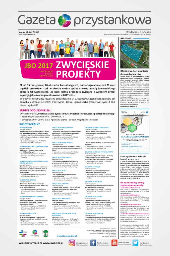 Gazeta przystankowa Urząd Miejski w Jaworznie Numer 17 (60) / 2016 Biuro Promocji i Informacji, ul. Grunwaldzka 33, 43-600 Jaworzno, tel. (32) 61 81 585 Więcej na www.jaworzno.pl Aktualności JBO 2017 JAWORZNICKI BUDŻET OBYWATELSKI ZWYCIĘSKIE PROJEKTY Blisko 15 tys. głosów, 20 obszarów konsultacyjnych, budżet ogólnomiejski i 21 zwycięskich projektów - tak w skrócie można opisać czwartą edycję Jaworznickiego Budżetu Obywatelskiego. Za nami pełna procedura związana z wyborem przedsięwzięć, jakie zostaną zrealizowane w 2017 roku. W 4 edycji mieszkańcy Jaworzna oddali łącznie 14 976 głosów. Łączna liczba głosów oddanych elektronicznie 6 909, tradycyjnie - 8 067. Łączna liczba głosów ważnych 14 144, nieważnych - 832 Oferta inwestycyjna miasta dla przedsiębiorców Szukasz działki na uruchomienie lub rozwój swojej działalności gospodarczej? Sprawdź ofertę sprzedaży gminnych działek inwestycyjnych w Strefie Przemysłowa II. Do dyspozycji przedsiębiorców miasto oddaje atrakcyjnie zlokalizowane, w pełni uzbrojone działki inwestycyjne. W miejscowym planie zagospodarowania przestrzennego działki przeznaczone są pod zabudowę produkcyjnousługową. Sprzedaż nieruchomości, w formie przetargu ustnego nieograniczonego odbędzie się 11 stycznia 2017 r. Więcej informacji: Wydział Rozwoju i Polityki Gospodarczej Urzędu Miejskiego w Jaworznie Plac Górników 5, 43-600 Jaworzno, tel. 32 61 81 712, email: [email protected] www.invest-in-jaworzno.pl BUDŻET OGÓLNOMIEJSKI: Zwycięski projekt:„Poprawa jakości życia i zdrowia mieszkańców Jaworzna poprzez fizjoterapię” ź szacunkowe koszty zadania 1 000 000,00 zł ź wnioskodawcy: Dorota Guja, Agnieszka Ziarko - Bondar, Magdalena Smreczak BUDŻET LOKALNY: OBSZAR NR 2 BORY Zwycięski projekt: „Rewitalizacja parku w dzielnicy Bory – projekt oraz budowa alejek i placów parkowych wraz z montażem tzw. elementów małej architektury (ławki i stoły parkowe, kosze na śmieci, stojaki na rowery itp.)” ź Szacunkowe koszty zadania: 75 000,00 zł ź Wnioskodawca: Michał Matyasik OBSZAR NR 3 BYCZYNA, CEZARÓWKA DOLNA Zwycięski projekt: „Park zabaw + siłownia pod chmurką przy LKS Zgoda Byczyna” ź Szacunkowe koszty zadania: 75 000,00 zł ź Wnioskodawcy: Henryk Głowacki, Jan Domagała OBSZAR NR 4 CEZARÓWKA GÓRNA, JEZIORKI, KOŹMIN, WILKOSZYN Zwycięski projekt: „Strefa rekreacyjno – sportowa w dzielnicy Wilkoszyn” – etap I plac zabaw dla dzieci ze stołem do tenisa stołowego oraz siłownią „pod chmurką” ź Szacunkowe koszty zadania 75 000,00 zł ź Wnioskodawca: Dorota Jońca OBSZAR NR 5 CIĘŻKOWICE Zwycięski projekt: „Stworzenie Mini Centrum rekreacyjnokulturalnego, zagospodarowanie skweru przy ul. Ks. A. Mroczka 51, 49” ź Szacunkowe koszty zadania 75 000,00 zł ź Wnioskodawcy: Adrian Majewski, Krzysztof Żurek OBSZAR NR 8 DOBRA, PIECZYSKA Zwycięski projekt: „Rozbudowa obecnego placu zabaw i siłowni podchmurką o dalsze urządzenia dla dzieci i dorosłych przy ul. Chocimskiej” ź Szacunkowe koszty zadania 75 000,00 zł ź Wnioskodawca: Wacław Cudak OBSZAR NR 9 GIGANT, LEOPOLD Zwycięski projekt: „Zabudowa oświetlenia parkowego i kamery monitoringu na terenie rekreacyjno-sportowym Gigant” ź Szacunkowe koszty zadania 43 500,00 zł ź Wnioskodawca: Mieczysław Długosz OBSZAR NR 10 GÓRA PIASKU Zwycięski projekt: „Cykl pikników naukowych i warsztatów przeznaczonych dla dzieci od 3 do 13 lat” ź Szacunkowe koszty zadania 75 000,00 zł ź Wnioskodawca: Agnieszka Kuśnierczyk OBSZAR NR 11 JELEŃ Zwycięski projekt: „Plac zabaw przy zegarze słonecznym – przy ul. Celników” ź Szacunkowe koszty zadania 75 000,00 zł ź Wnioskodawca: Anna Łyszczek OBSZAR NR 12 ŁUBOWIEC Zwycięski projekt: „Parkour/Street Workout – Park do ćwiczeń akrobatycznych i siłowych - skwer przy ul. Zubrzyckiego” ź Szacunkowe koszty zadania 75 000,00 zł ź Wnioskodawca: Łukasz Sowa OBSZAR NR 6 DĄBROWA NARODOWA Zwycięski projekt: „Rodzinny plac zabaw z siłownią zewnętrzną - doposażenie placu zabaw i siłowni w dodatkowe atrakcje” ź Szacunkowe koszty zadania 35 000,00 zł ź Wnioskodawcy: Dorota Guja, Krzysztof Lehnort, Marek Szuler OBSZAR NR 13 NIEDZIELISKA Zwycięski projekt: „Plac zabaw oraz siłownia zewnętrzna „pod chmurką” w okolicy SP3” ź Szacunkowe koszty zadania 75 000,00 zł ź Wnioskodawcy: Agnieszka Lesiak, Agnieszka Stach OBSZAR NR 7 DŁUGOSZYN Zwycięski projekt: „Przystań kajakowa wraz z miejscem do biwakowania na brzegu rzeki Biała Przemsza w Długoszynie” ź Szacunkowe koszty zadania 75 000,00 zł ź Wnioskodawcy: Jerzy Nieużyła, Paweł Ząbek OBSZAR NR 14 OSIEDLE STAŁE, REJON ELEKTROWNI Zwycięski projekt: „Rozbudowa parkingu przy ul. Klonowej” ź Szacunkowe koszty zadania 75 000,00 zł ź Wnioskodawcy: Michał Goryczka, Nikodem Motyka, Bernard Goryczka JAWORZNICKI BUDŻET OBYWATELSKI www.jbo.jaworzno.pl Więcej informacji na www.jaworzno.pl OBSZAR NR 15 PAŃSKA GÓRA, SKAŁKA Zwycięskie projekty: „Osiedle Skałka - Strefa sportu i rekreacji - siłownia zewnętrzna, oświetlenie + monitoring” ź Szacunkowe koszty zadania 53 945,00 zł ź Wnioskodawca: Sebas an Pycia „Osiedle Skałka – Wakacje na Skałce nie muszą być nudne!” ź Szacunkowe koszty zadania 21 055,00 zł ź Wnioskodawca: Sebas an Pycia OBSZAR NR 16 PECHNIK, PODWALE, WARPIE Zwycięski projekt: „Cyprysowy zakątek rekreacyjny – elementy siłowni zewnętrznej oraz doposażenie istniejącego placu zabaw przy ul. Cyprysowej” ź Szacunkowe koszty zadania 75 000,00 zł ź Wnioskodawca: Ewa Zuber OBSZAR NR 17 PODŁĘŻE Zwycięski projekt: „Modernizacja nasypu przy targowisku „Manha an” w dzielnicy Podłęże ź Szacunkowe koszty zadania 75 000,00 zł ź Wnioskodawcy: Krystyna Stachelczyk, Jadwiga Grzybek OBSZAR NR 18 PSZCZELNIK Zwycięski projekt: „Teren rekreacyjny dla dzieci na skrzyżowaniu ulic Jarzębinowej i Wrzosowej” 
